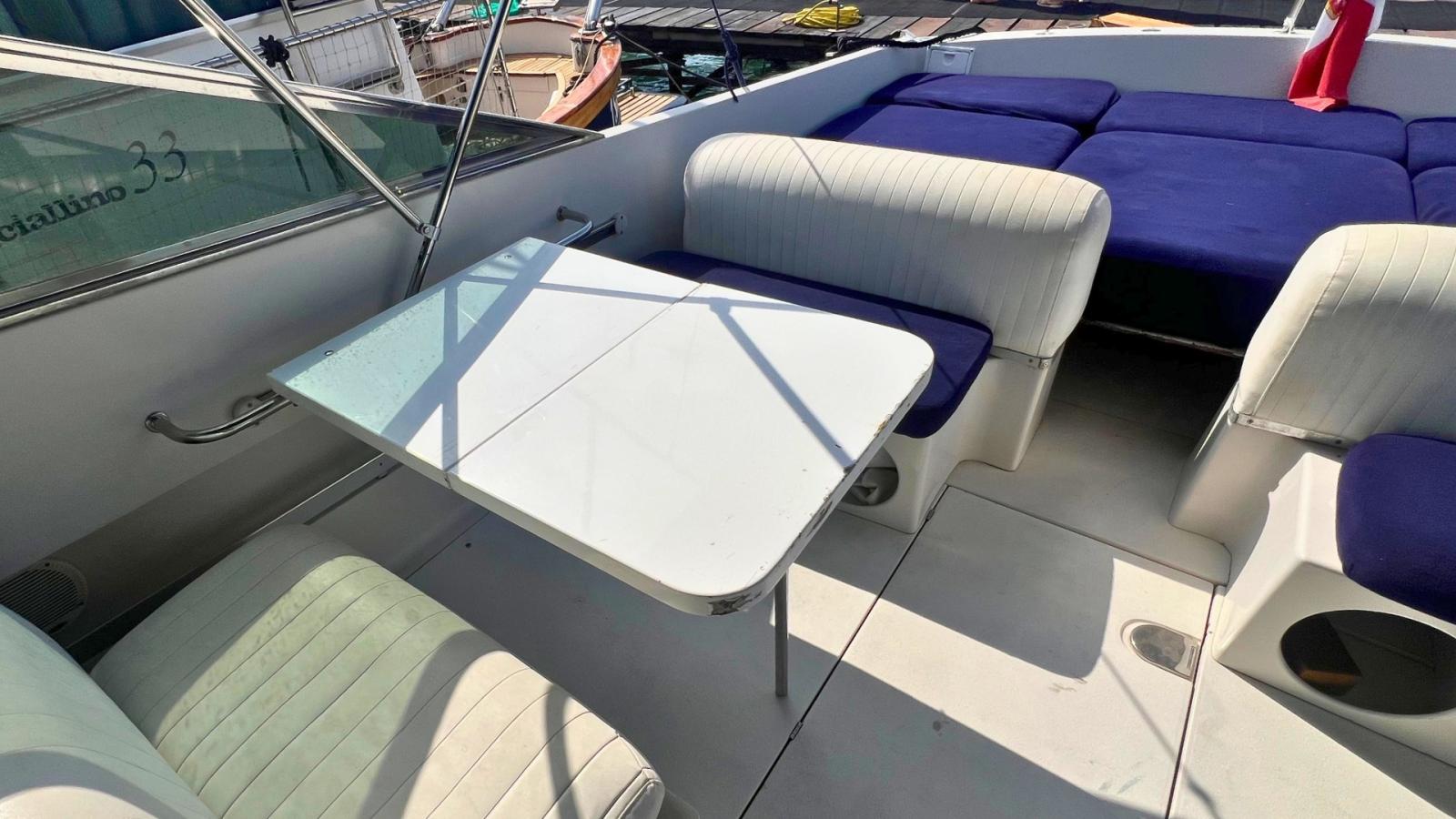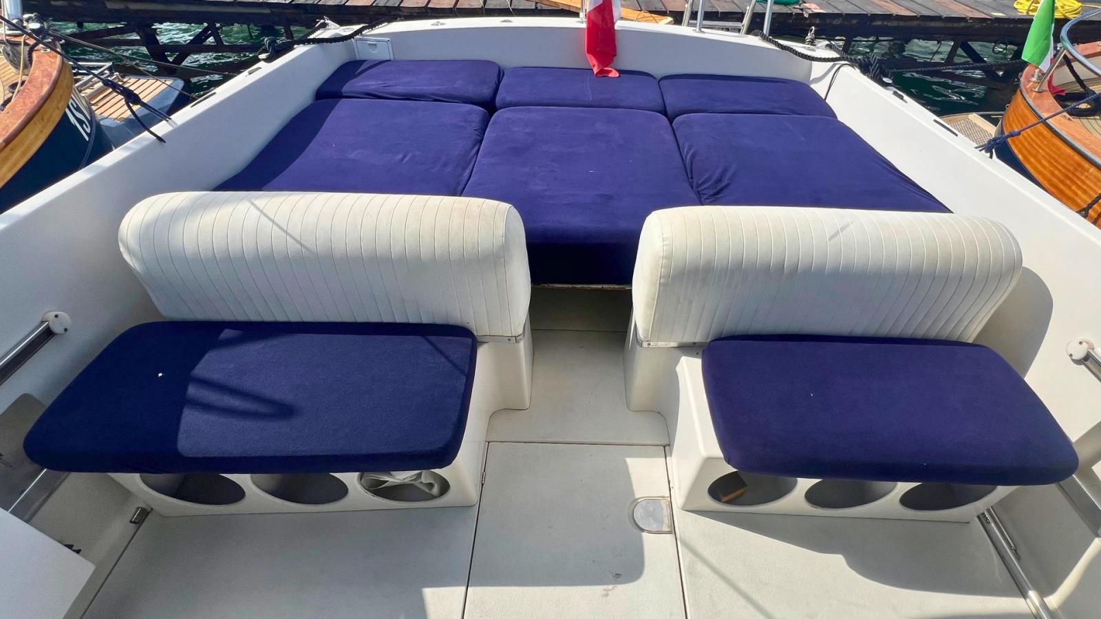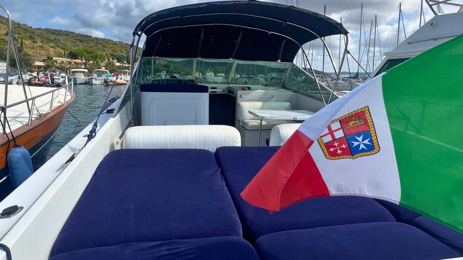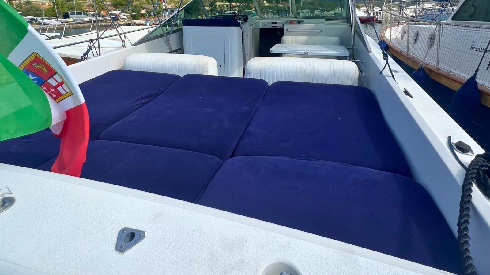 Itama 38, the iconic open of the Cantieri Navali di Roma: deep-V hull and sturdy GRP construction. Re-motorized in 2006 with 2 × Cummins 6BTA 5.9 (~370 HP ea), it offers safe and reliable driving. Recent updates: new tanks, redone helm station, renewed upholstery and updated safety system; on board new SIMRAD GPS and Paguro 5000 generator.