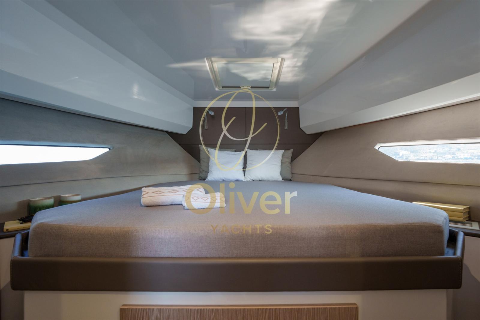 The Open version stands out for its large panoramic windshield and the optional T-Top with electric awning at the stern, an elegant solution that protects the living area without interrupting the feeling of freedom. The cockpit, completely redesigned, is a concentrate of design and functionality: the modular backrest of the sofa allows the dining area to be transformed into a large sundeck with a folding table, ensuring maximum versatility in every situation.