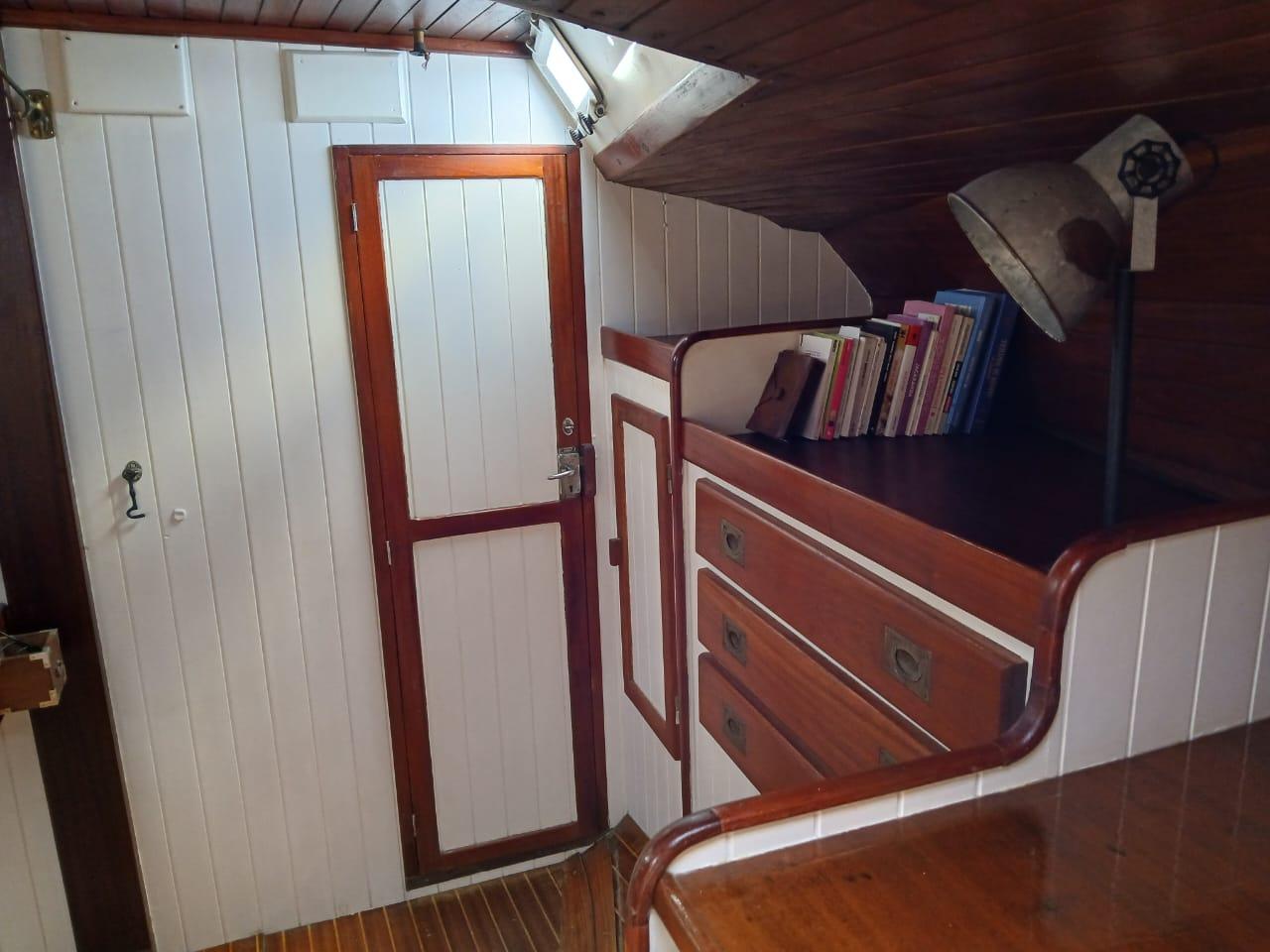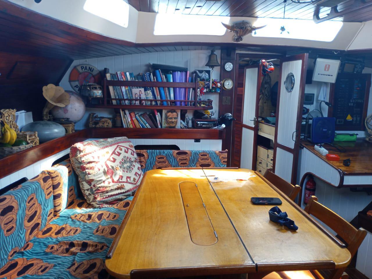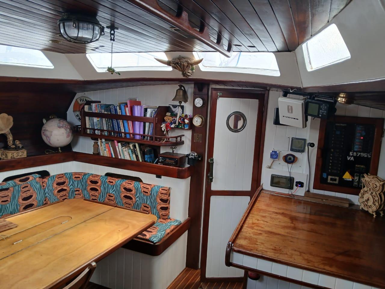L-shaped saloon to port with table and bench seat and plenty of storage under the bench and floors