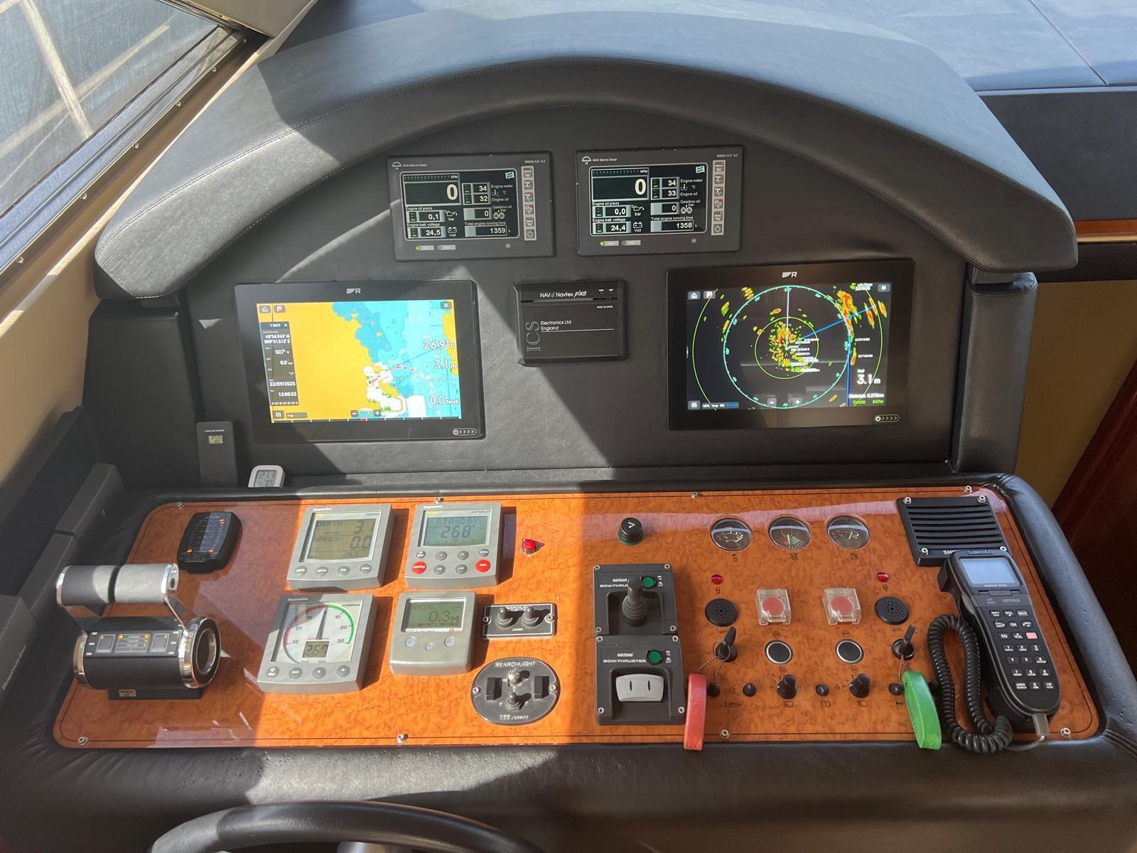 Engine Alarm, Bilge Alarm, Anchor (Ultra Anchor 27 kg + catena 100 mt), Spare shaft, Water pressure pump (doppia), 8 Batteries (nuove 2022), Deck Shower, 2 Secondary Propeller, Hydraulic Flaps, Fire Extinguishing System (revisione 2025), Flaps Indicators, Washbasin in the cockpit, Courtesy Lights, Underwater lights, Gangway (Besenzoni), Platform, Manual Bilge Pump, Entry door, Teak Cockpit, Shorepower connector, Water harbor connector system, Voltage Rectifier, Electronic instrumentation repeater, Electric Windlass, swimming ladder, cockpit table, Horn, 2 Stern Winches.