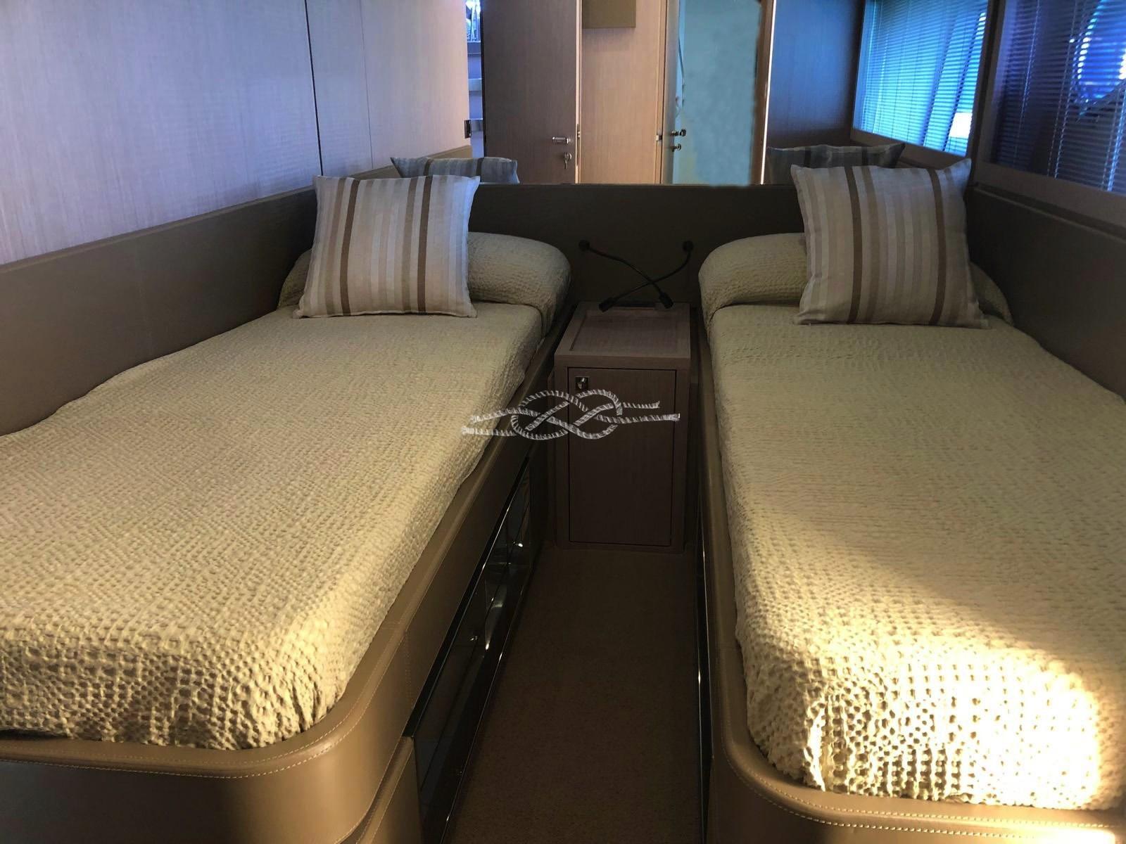 Master cabin with double bed, walk-in closet, bathroom - VIP cabin with double bed and bathroom - guest cabin with double bed and bathroom - guest cabin with two flat beds - guest bathroom.