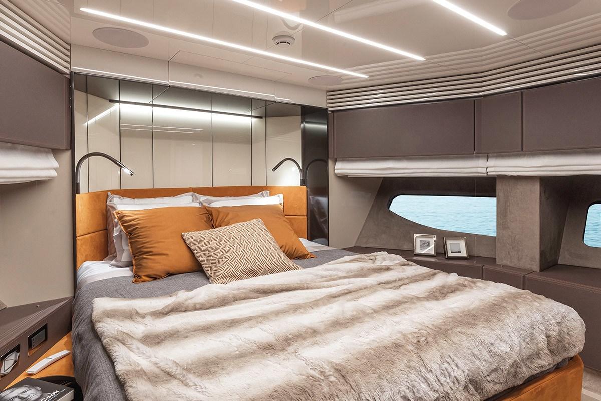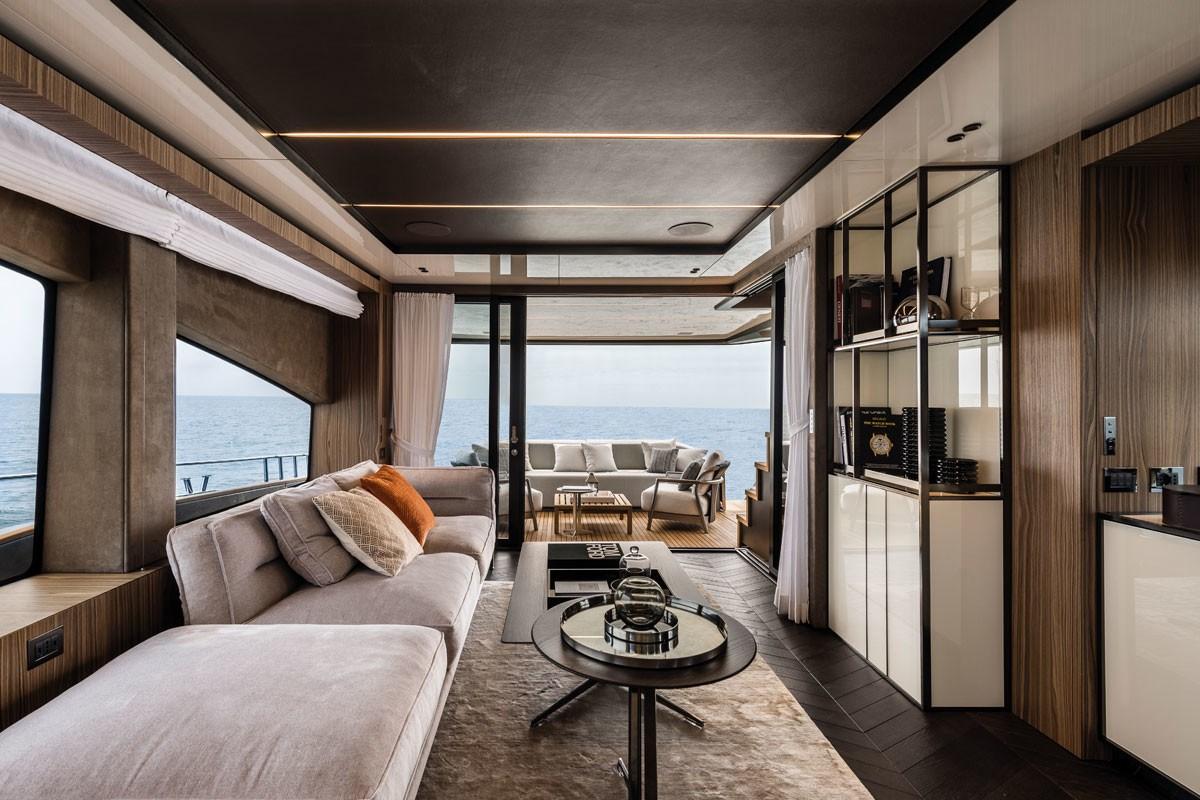 The fly-bridge is equipped with a large lounge and a sunbathing area. The aft swim platform is spacious and can be expanded, offering an outdoor shower and atmospheric lighting for the evening.
