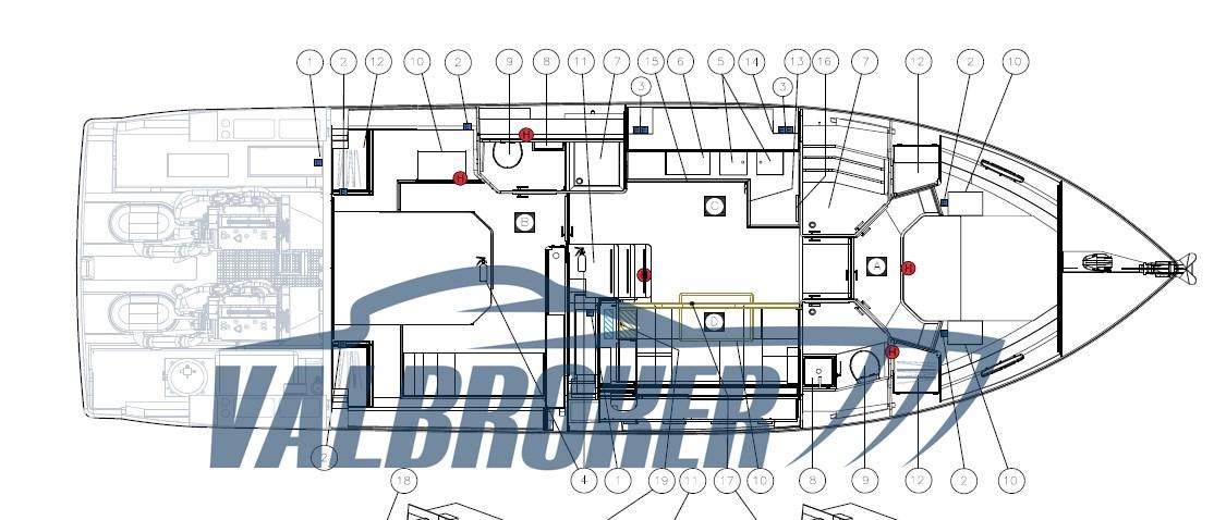 windshield and hatch cover in white PVC; folding saddles for tenders; septic tank with electric macerator, deck drain and three-way valve; leather lounge sofa; Chocolate leather headboards with brown stitching; oak wood furnishings; furniture upgrades salons and cabins covered in leather, Skyhook including waypoint tracking function to keep the boat stationary during a stop (gas station etc.), internal sofa