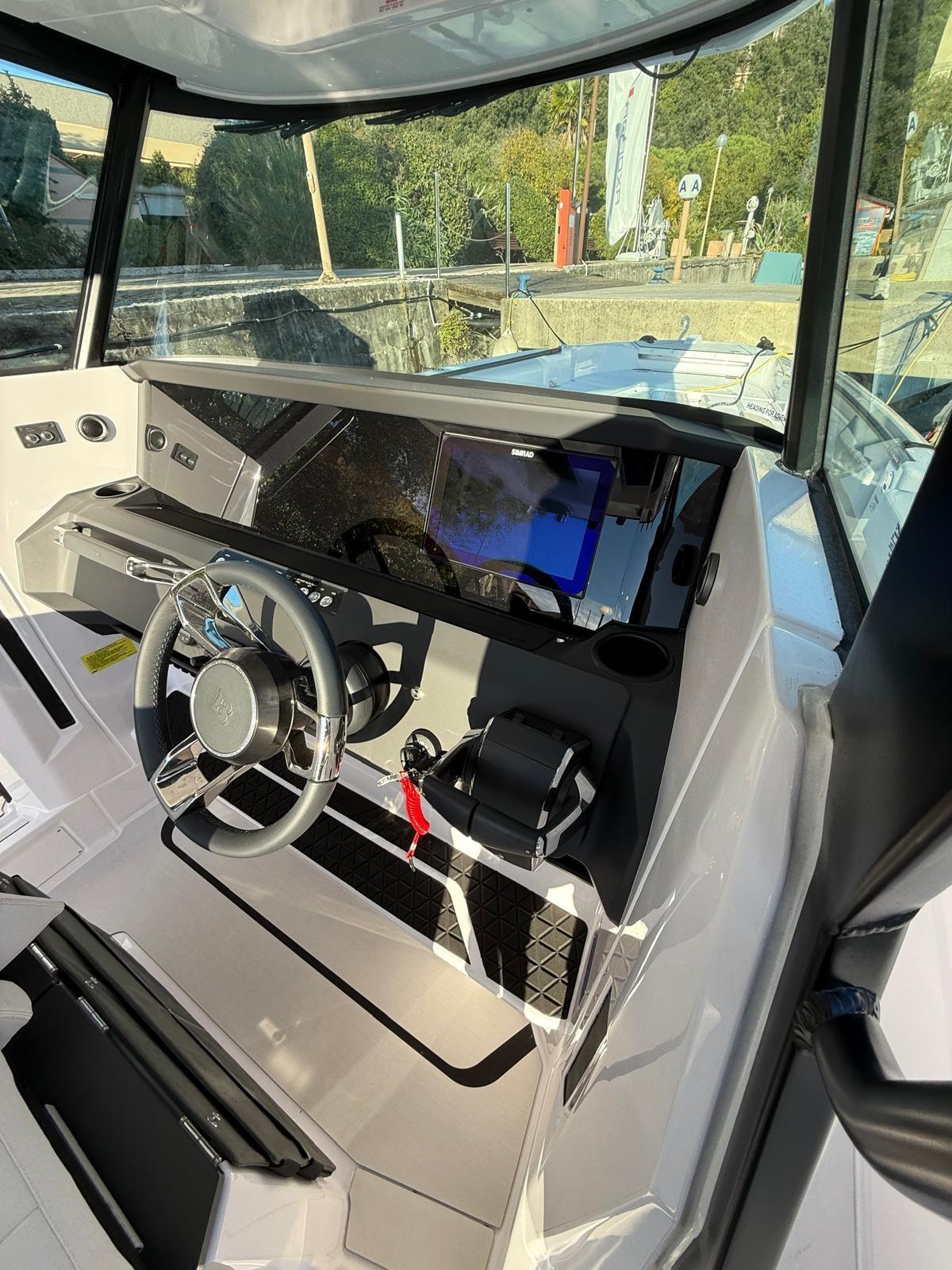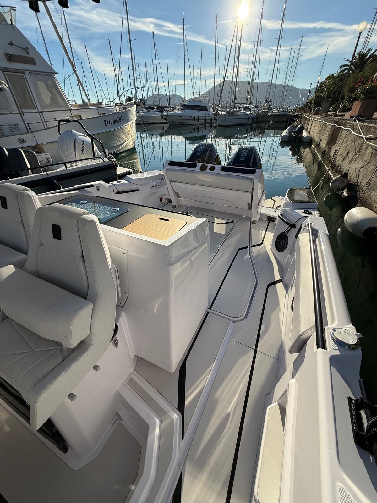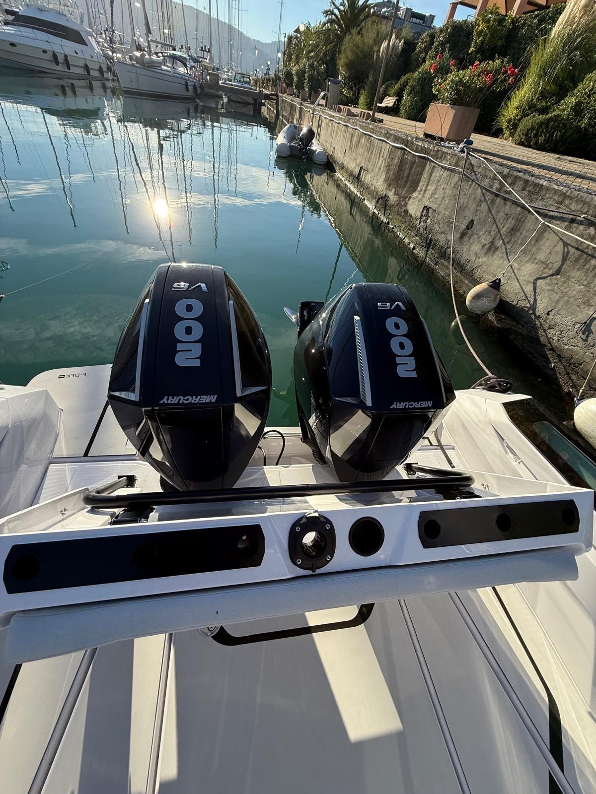 Pair of black Mercury 200 hp engines, COMPLETE FISHING OPTIONS, 2 Live Tanks, fish tank with macerator, fishing module rod holder with bait drawer, work lights, folding bench at the stern, JL Audio premium audio, Simrad electronics: NSX 12 inches, high-wide chirp thru-hull transducer, Vhf.