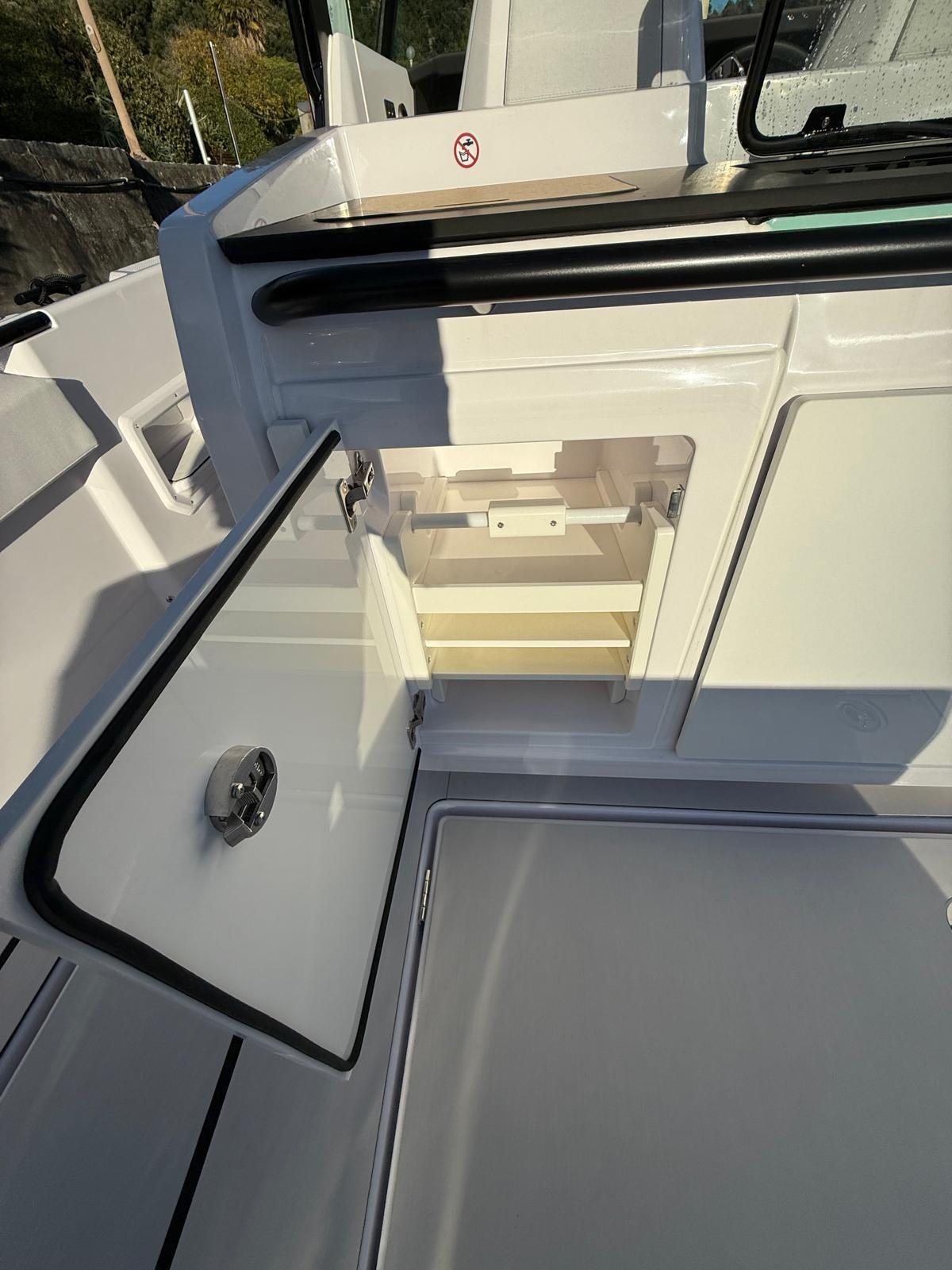Engine Alarm, Bilge Alarm, Alternator, Water pressure pump, Auto-Trim, Shore power cable, Deck Shower, Headlights fixed on the stem, Electric Flaps, Hard top, Washbasin in the cockpit, Courtesy Lights, Underwater lights, Automatic Bilge Pump, Manual Bilge Pump, Deck Wash Pump, Shorepower connector, Water harbor connector system, swimming ladder, Horn.