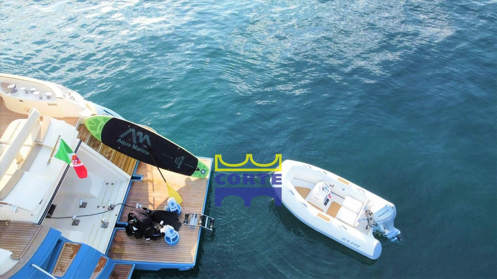 Engine Alarm, Bilge Alarm, Anchor (Bruce inox), Water pressure pump, Teak Side Decks, Special Colour (azzurro), Deck Shower, Twin Steering, Directional Spotlight, Hydraulic Flaps, Tender Garage (ad apertura elettroidraulica), Fire Extinguishing System, Washbasin in the cockpit, Courtesy Lights, Underwater lights (sotto plancetta di poppa), Gangway (elettroidraulica a scomparsa), Platform (poppa per bagno), Automatic Bilge Pump, Entry door, Teak Cockpit, Shorepower connector, Water harbor connector system, Electronic instrumentation repeater, Electric Windlass, swimming ladder, Stabilizers (Arg Mitsubishi), cockpit table (con 2 divani), Tender (recente con alaggio facilitato), Horn, Winch Electric (prua), 2 Stern Winches, Bow Winches.