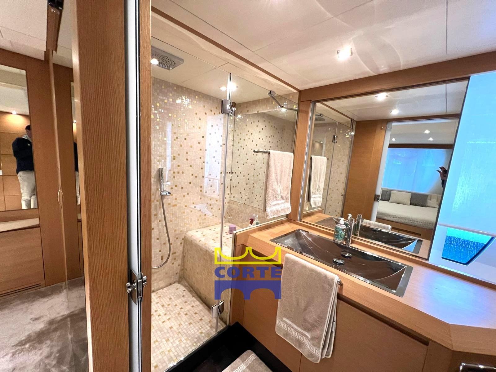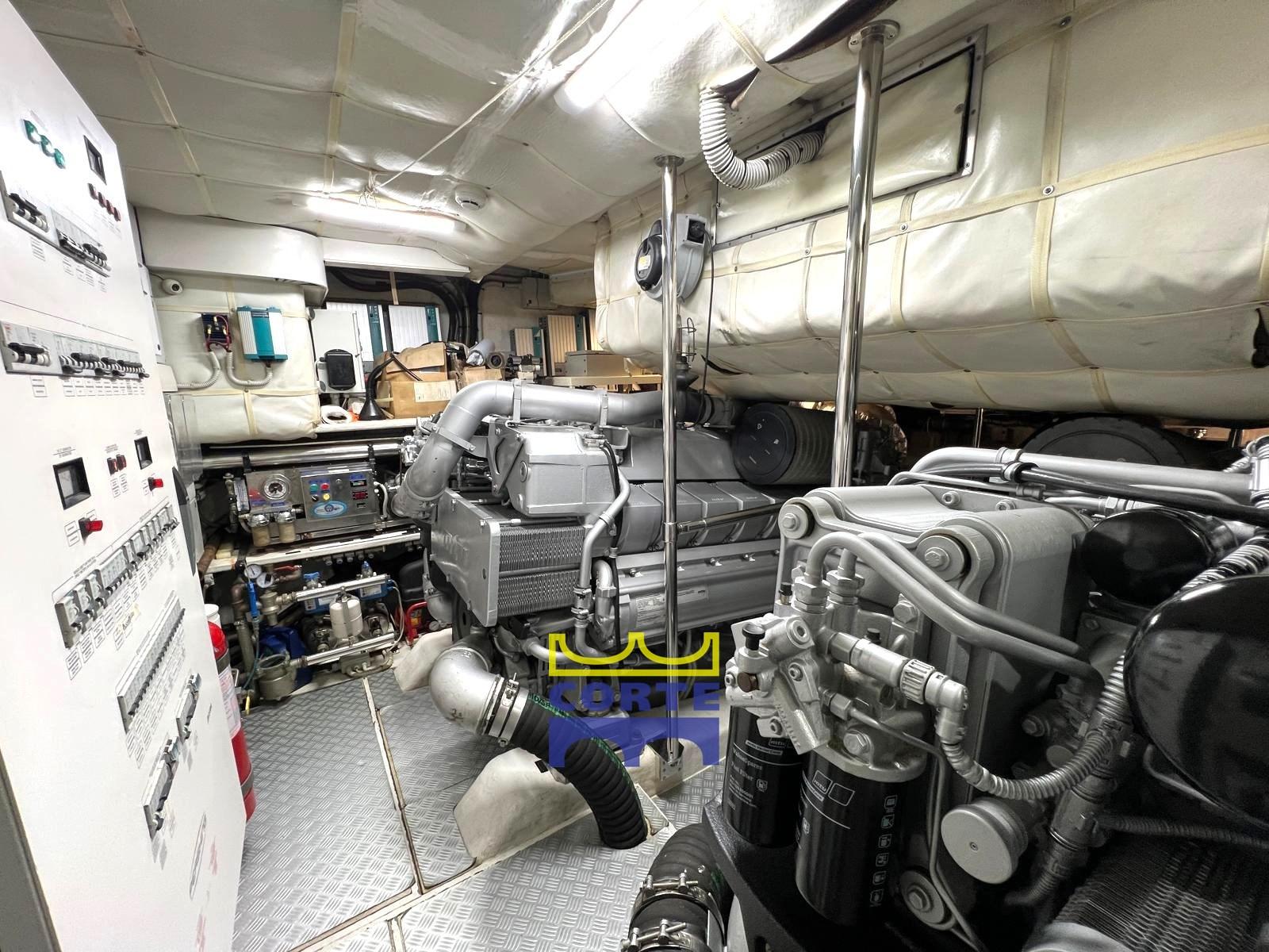 Fume/Gas Detector, Engine Alarm, Bilge Alarm, 2 Water pressure pump (230/24), 2 Battery charger (24/75 Mastervolt), Deck Shower, Stern Thruster (idraulica), Bow Thruster (idraulica), Tender Garage (idraulico), Washbasin in the cockpit, Underwater lights, Gangway (idraulica a scomparsa), Platform (in teak), Automatic Bilge Pump, Manual Bilge Pump, Entry door, Side door (elettro idrauliche), Teak Cockpit, Shorepower connector, Electric Windlass, swimming ladder (elettro idraulica), cockpit table (trasformabile in prendisole), 2 Stern Winches.