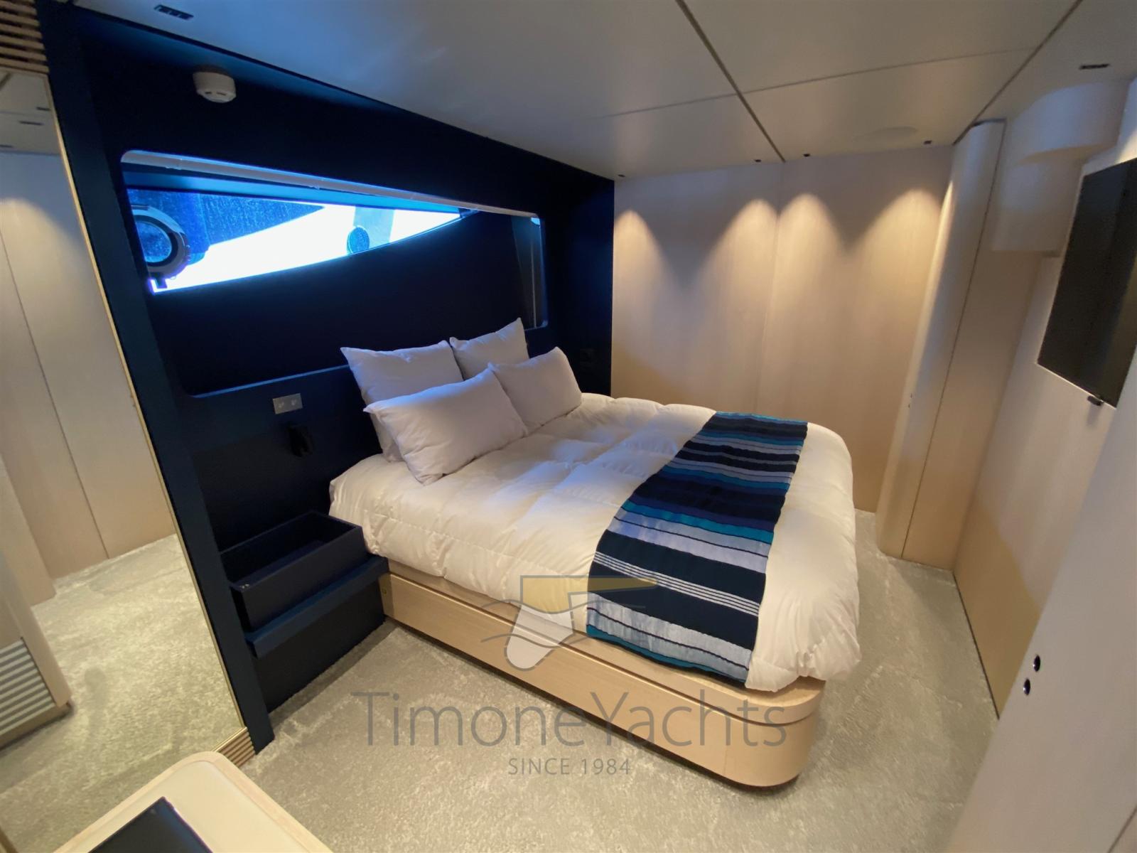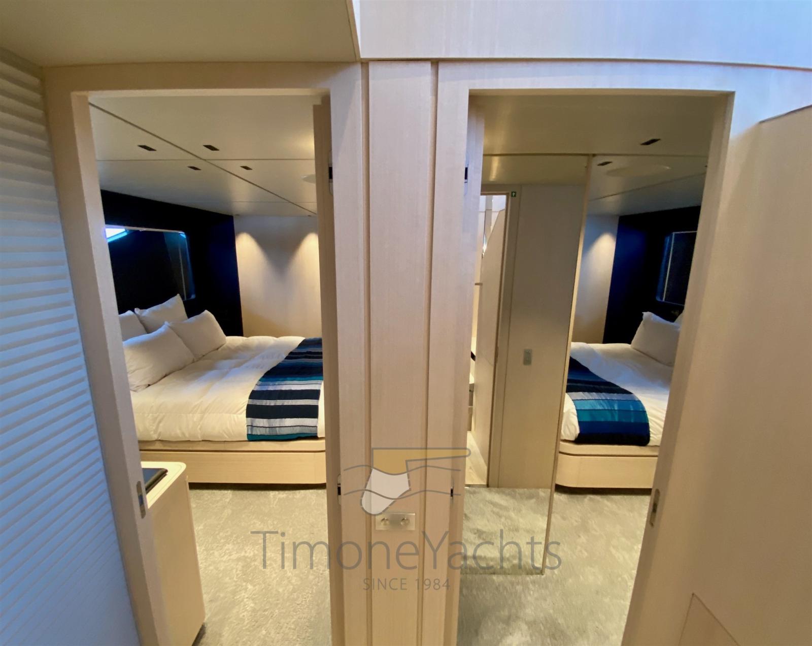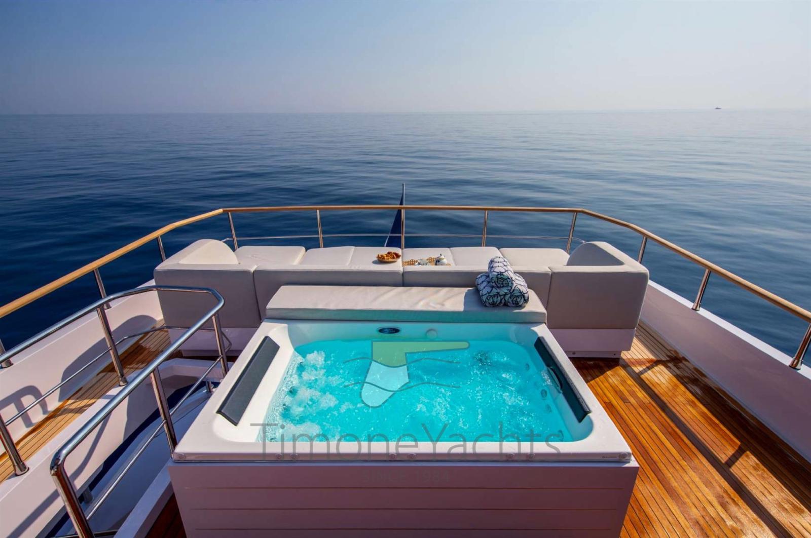 Auto Dynamic Trim Interceptor, Auto-Trim, Teak Side Decks, Deck Shower, Headlights fixed on the stem, Directional Spotlight, Electric Flaps (Humphree automatic), Tender Garage, Hard top, Fire Extinguishing System, Flaps Indicators, Anchor Chain Washdown, Courtesy Lights, Underwater lights, Gangway, Side door, Teak Cockpit, Shorepower connector, Water harbor connector system, Stabilizers (1 pair of Humpree fins (electric) + nr.1 Seakeeper NG 26), cockpit table, Tender (4.2 mts + 40 hp outboard), Horn, Stern Winches, Bow Winches.