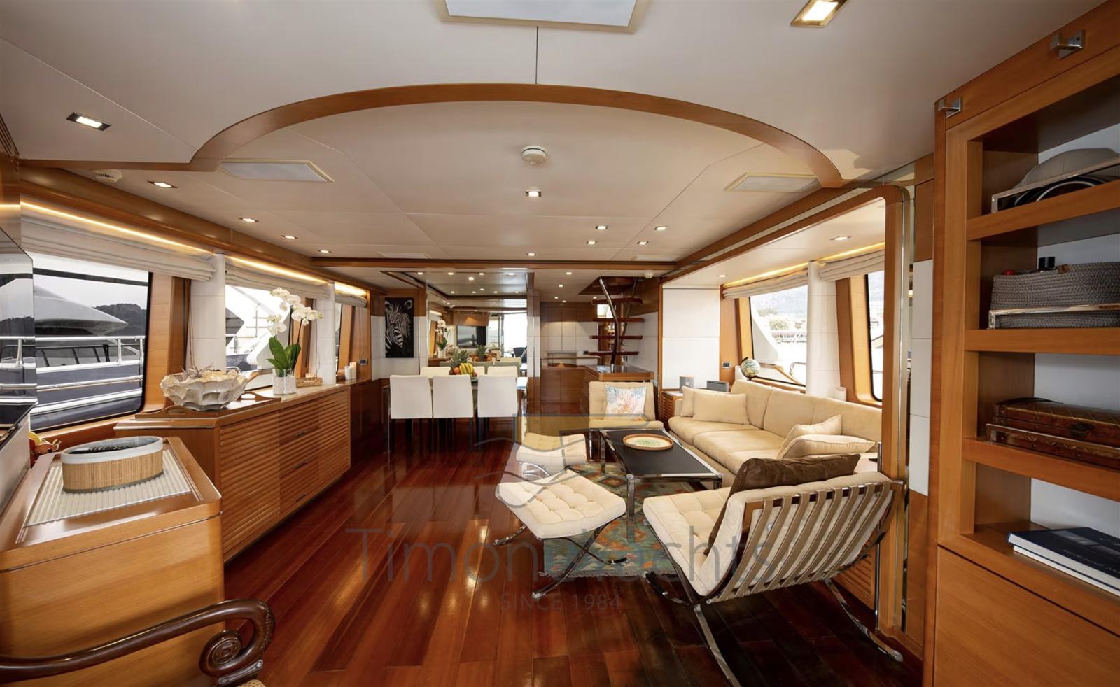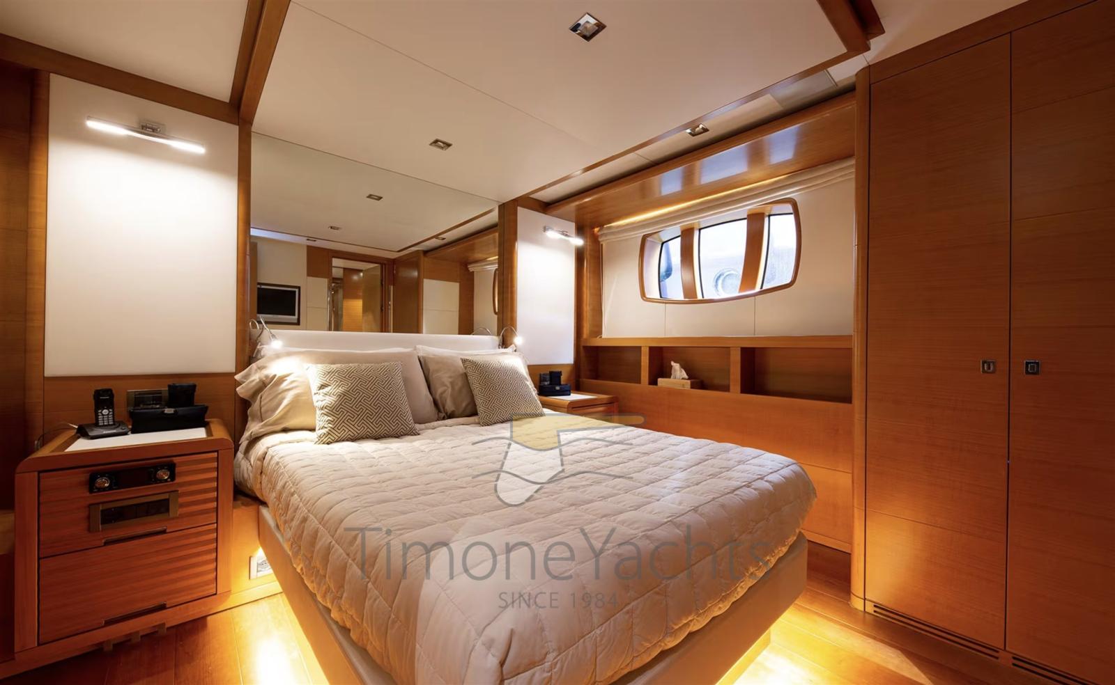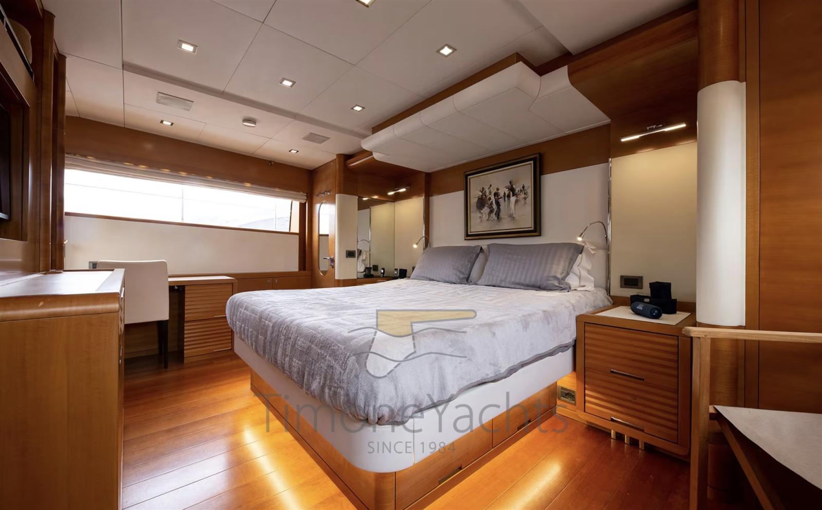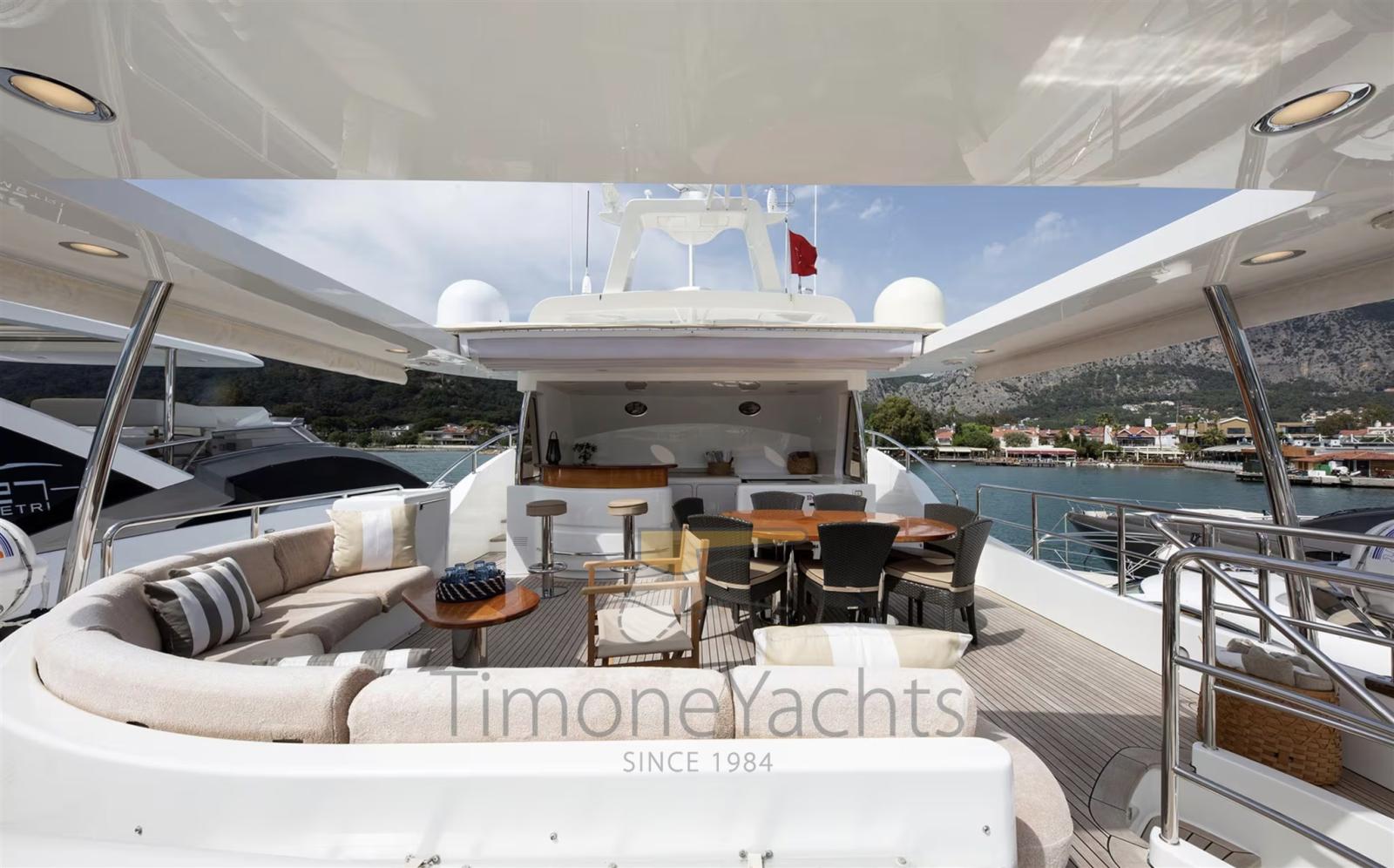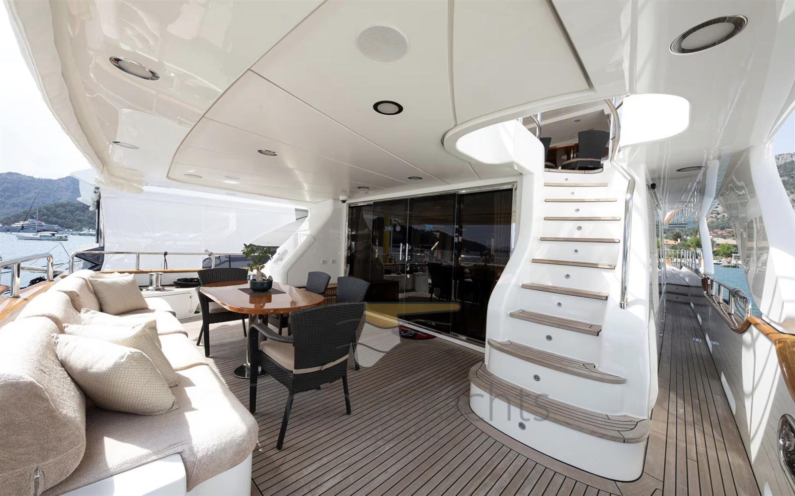 Alternator, Water pressure pump, Teak Side Decks, Guard rail, Twin Steering, Hydraulic Flaps, Davits for tender on fly, Hard top, Anchor Chain Washdown, Gangway, Teak deck, Entry door, Side door, Teak Cockpit, Shorepower connector, Water harbor connector system, Saddles for tender, Stabilizers (Naiad Zero Speed Stabilisers (2 fns) mod. 353), cockpit table, Tender, Horn, Stern Winches, Bow Winches.