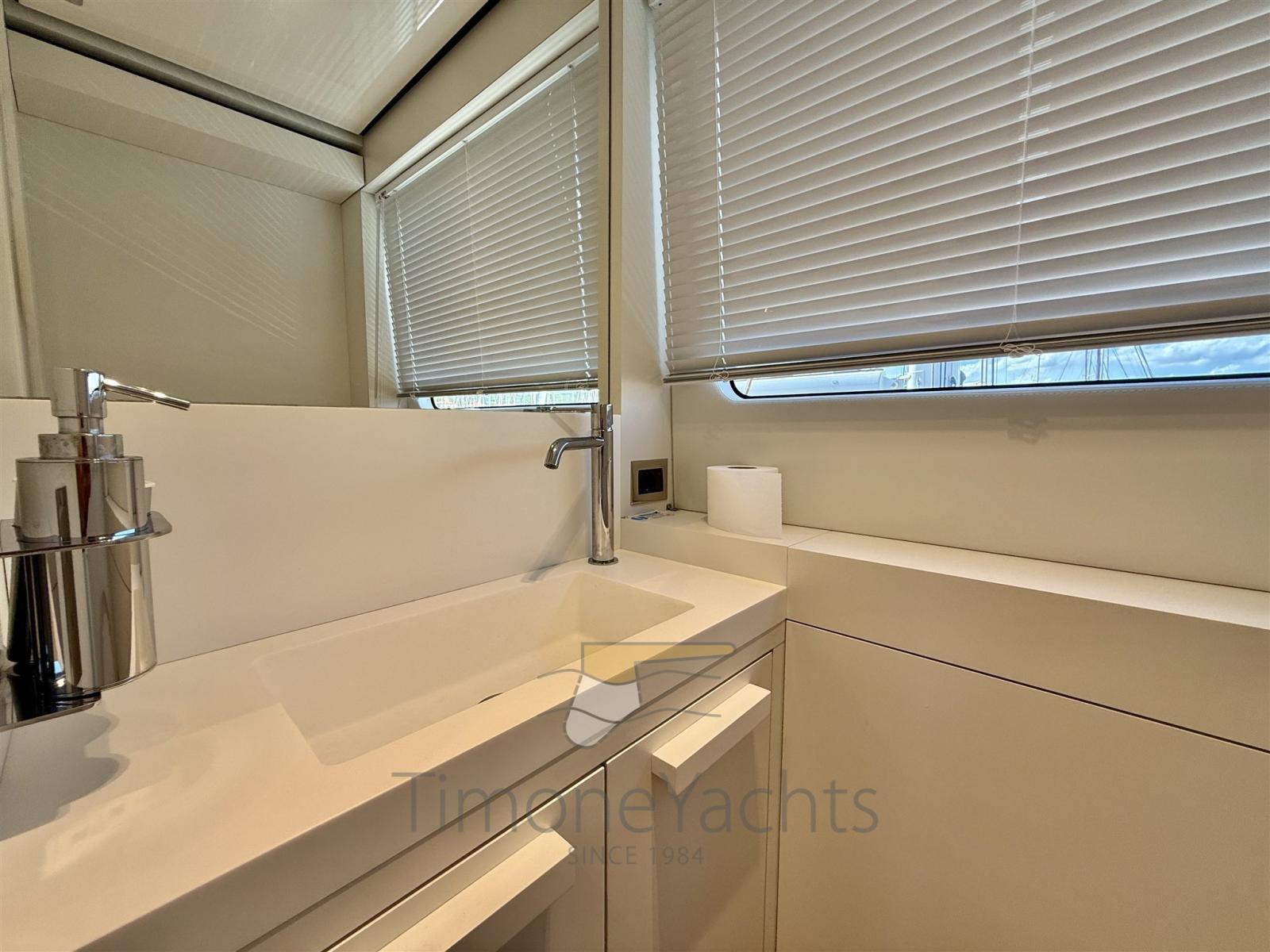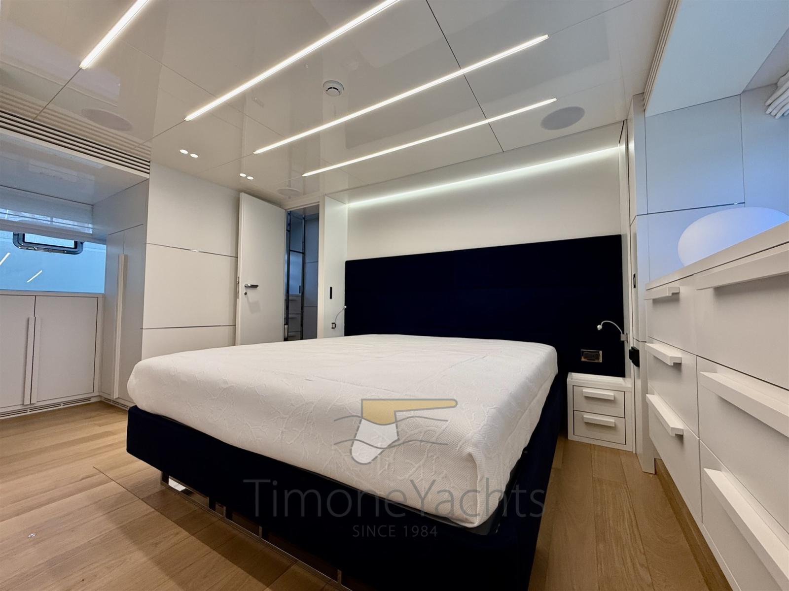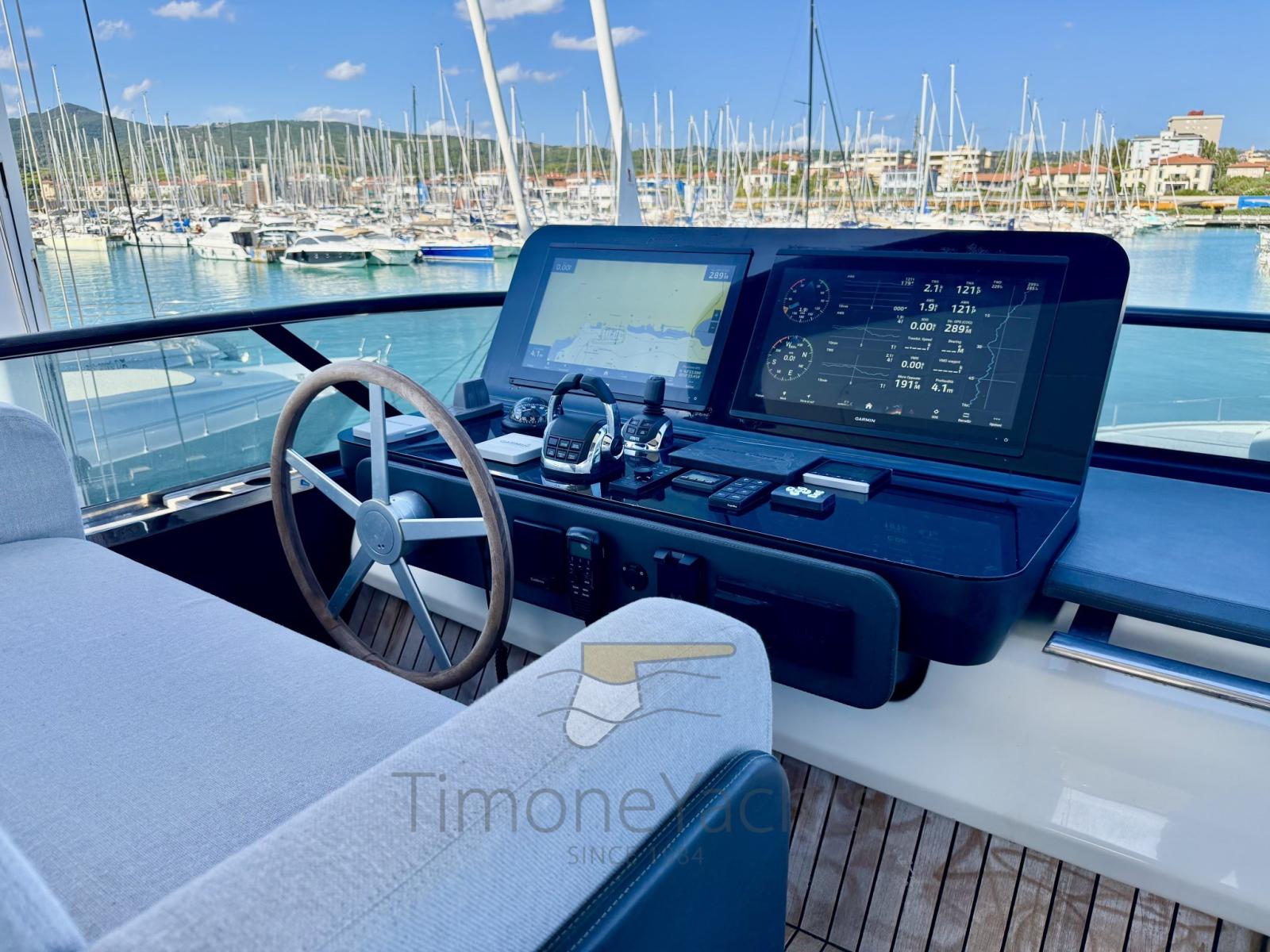 Fume/Gas Detector, Engine Alarm, Bilge Alarm, Alternator, Auto Dynamic Trim Interceptor, Water pressure pump, Teak Side Decks, 2 Deck Shower, Twin Steering, Electric Flaps, Tender Garage, Hard top (Con lamelle in alluminio regolabili), Compressor Air System, Anchor Chain Washdown, Gangway, Platform, Automatic Bilge Pump, Teak deck, Entry door, Side door, Teak Cockpit, Shorepower connector, Water harbor connector system, Electric Windlass, swimming ladder, Stabilizers (Pinne stabilizzatrici), cockpit table, Horn, Stern Winches, Bow Winches.