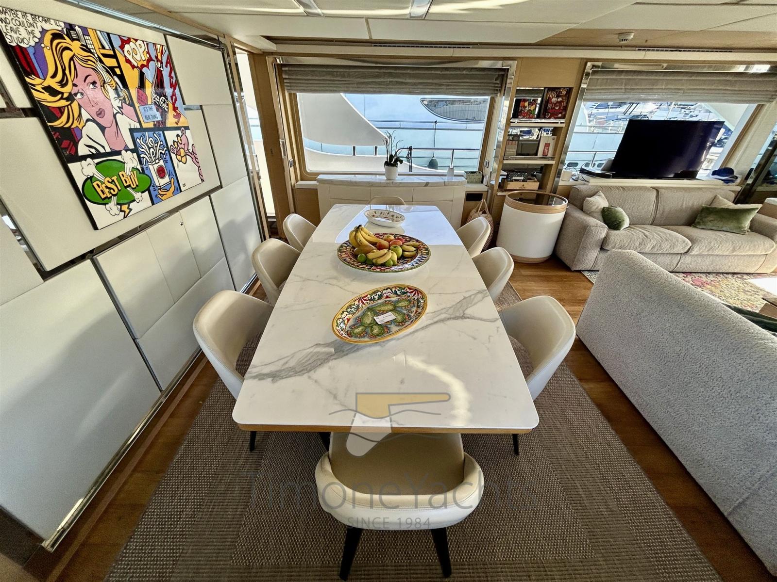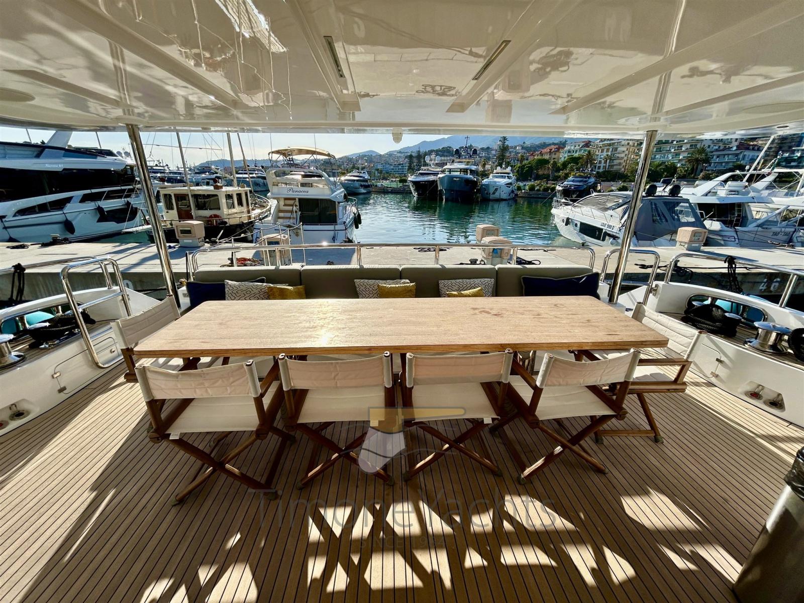 Fume/Gas Detector, Engine Alarm, Bilge Alarm, 2 Anchor, Water pressure pump, 2 Life Raft, Draining System, Teak Side Decks, Shore power cable, Deck Shower, Twin Steering, Tender Garage, Hard top, Fire Extinguishing System, Compressor Air System, 2 Anchor Chain Washdown, Courtesy Lights, Underwater lights, Battery Monitor, Gangway, Automatic Bilge Pump, Manual Bilge Pump, Deck Wash Pump, Teak deck, Entry door, 2 Side door, Teak Cockpit, Shorepower connector, Electric Windlass, Gang Board, Stabilizers (Fins, electric (underway + zero speed)), cockpit table, guard rails with gates, Horn, Stern Winches, 2 Bow Winches.