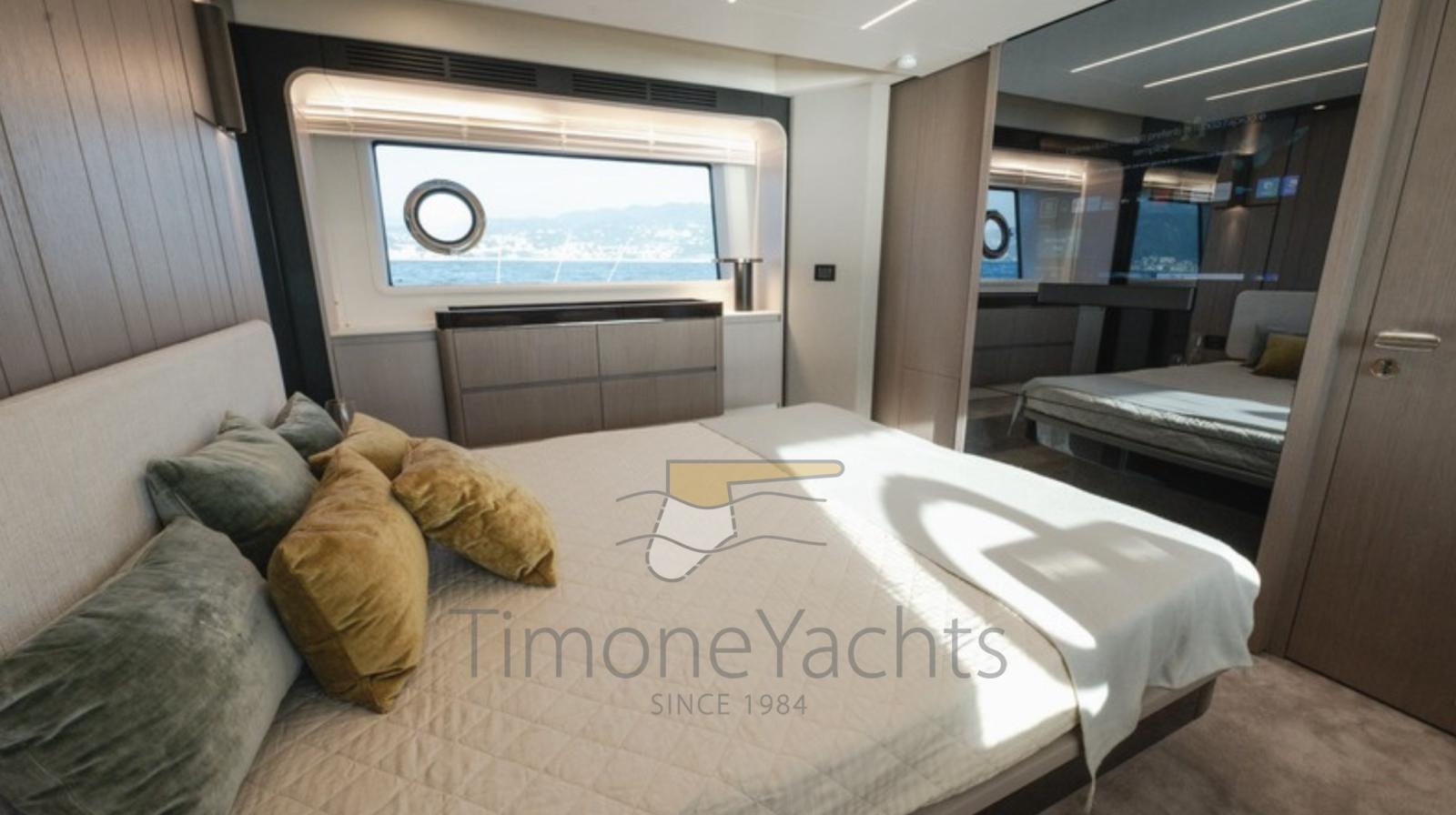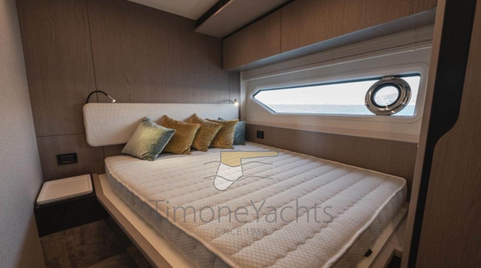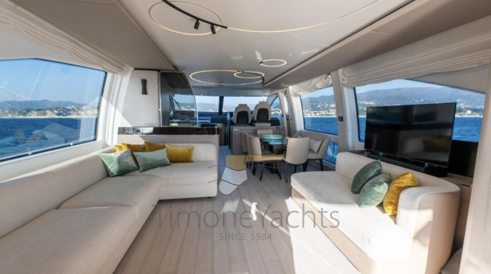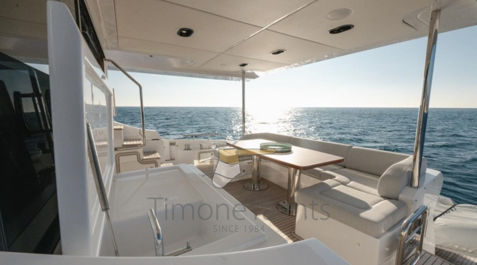 Fume/Gas Detector, Engine Alarm, Bilge Alarm, Alternator, Auto Dynamic Trim Interceptor, Water pressure pump, Teak Side Decks, Shore power cable, Deck Shower, Twin Steering, Electric Flaps, Hard top, Flaps Indicators, Anchor Chain Washdown, Washbasin in the cockpit, Courtesy Lights, Underwater lights, Fenders, Gangway, Platform, Automatic Bilge Pump, Teak deck, Entry door, Side door, Teak Cockpit, Shorepower connector, Water harbor connector system, Electric Windlass, swimming ladder, Stabilizers (Seakeeper 18), cockpit table, Tender (Tender 3.9m, 5 seater Technorib PIRELLI J39), guard rails with gates, Horn, Stern Winches, Bow Winches.