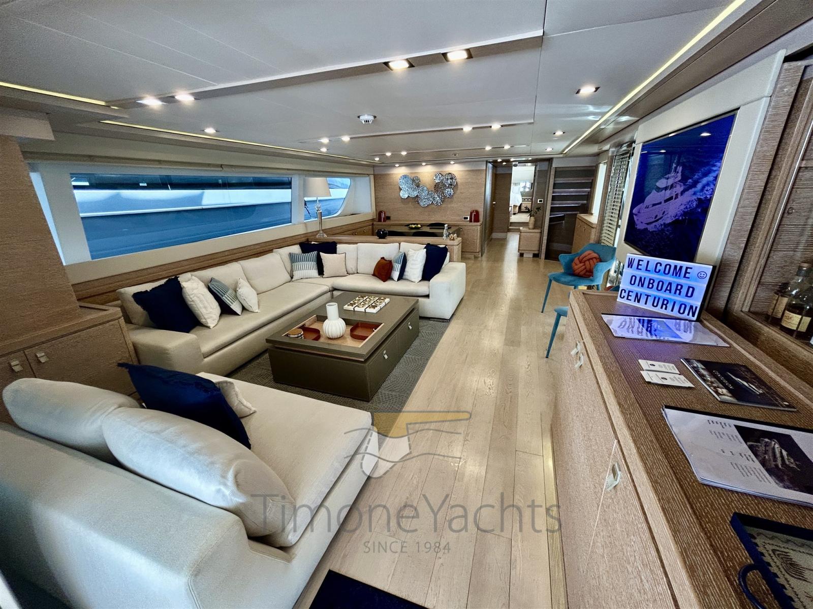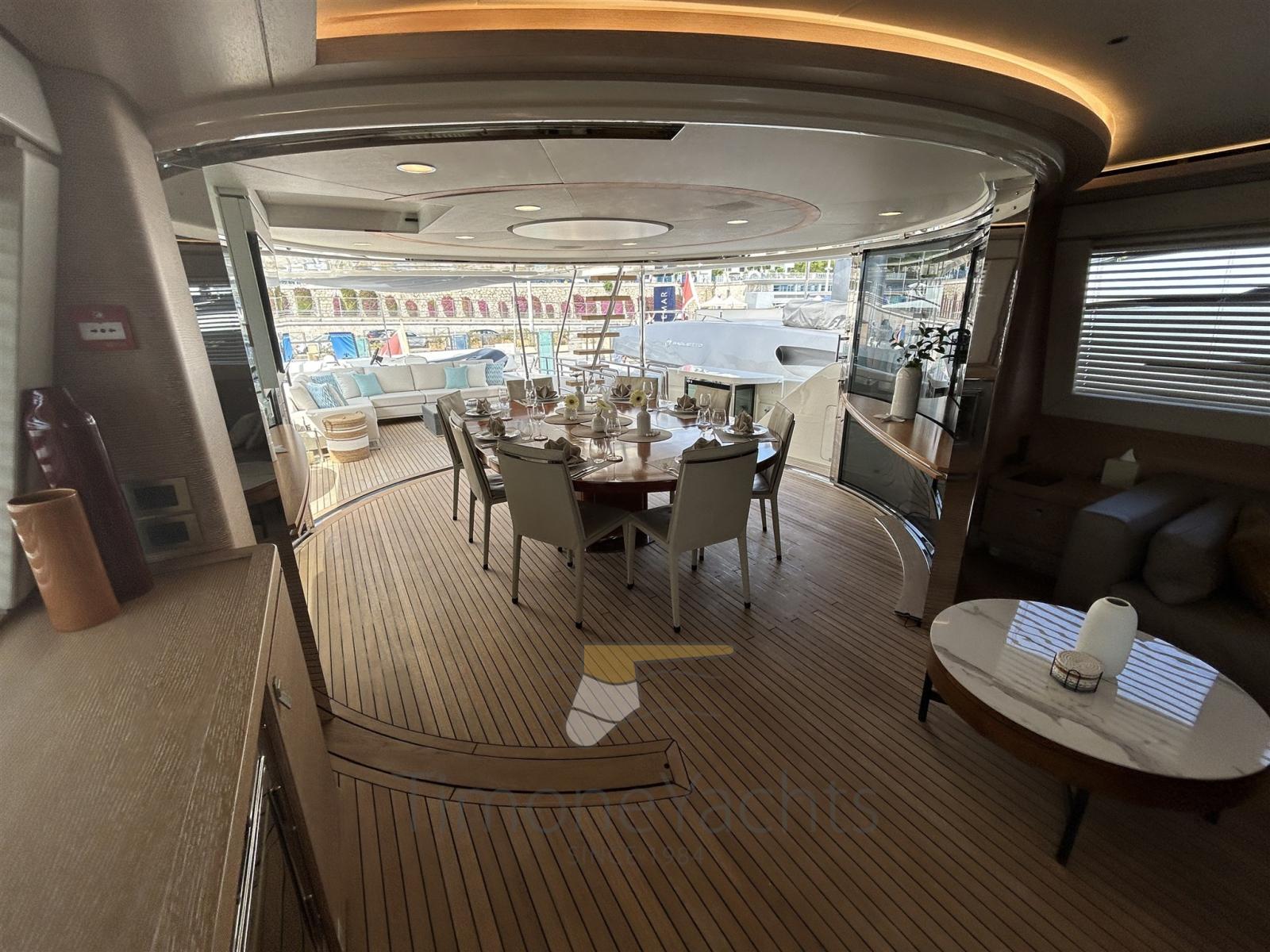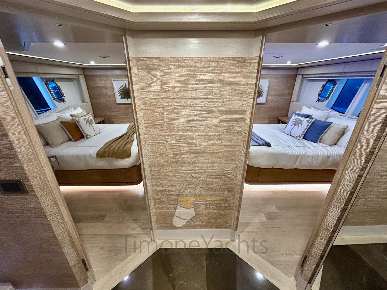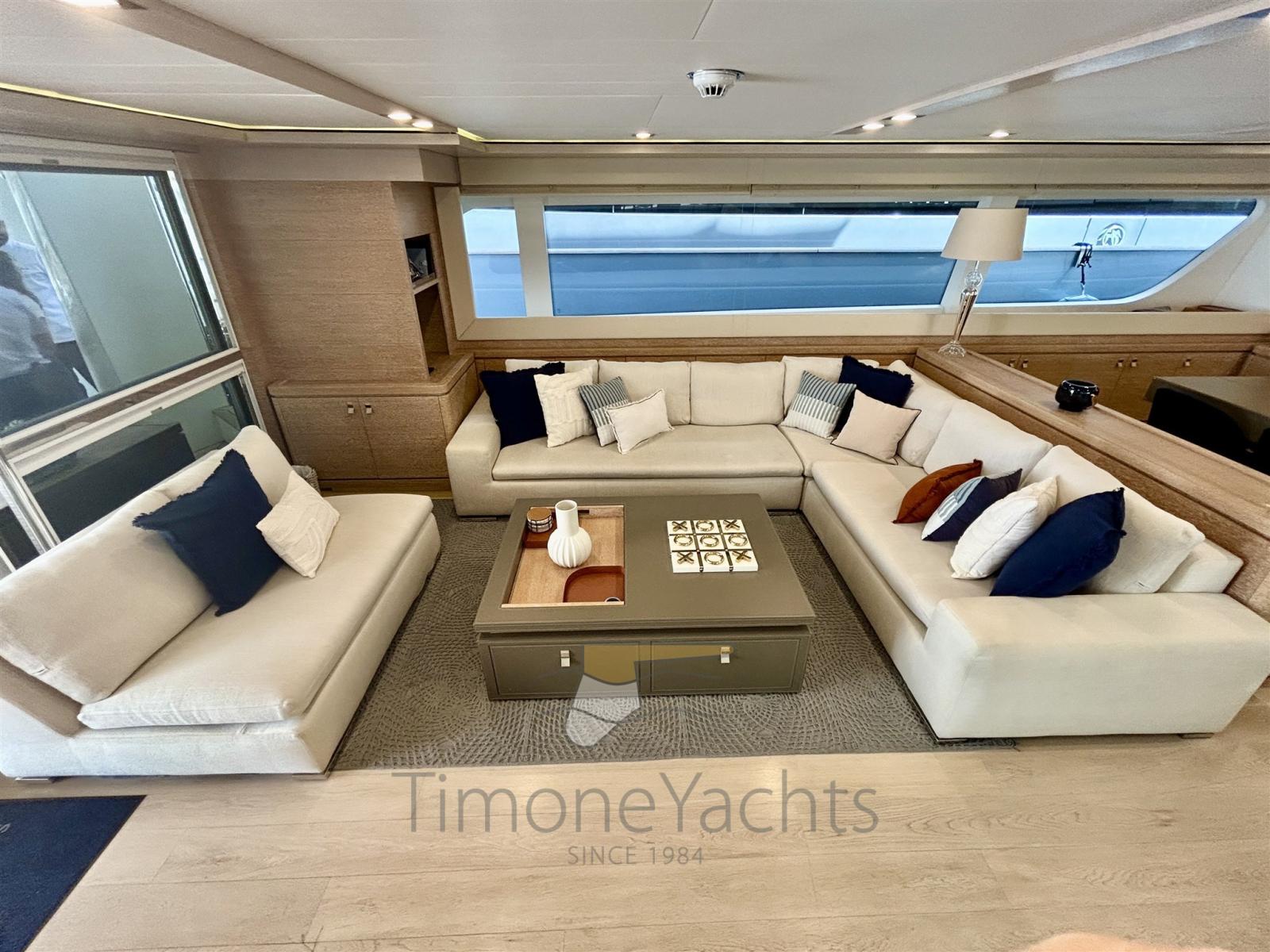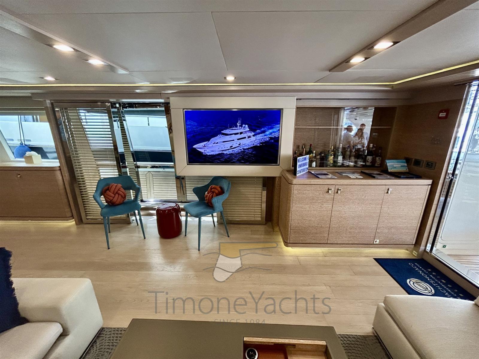 Fume/Gas Detector, Engine Alarm, Bilge Alarm, Alternator, 2 Anchor (2 x 105 Kg), Water pressure pump, Teak Side Decks, Special Colour, Deck Shower, Twin Steering, Hydraulic Flaps, Davits for tender on fly, Fire Extinguishing System, Flaps Indicators, Anchor Chain Washdown, Courtesy Lights, Gangway, Teak deck, Entry door, Teak Cockpit, Shorepower connector, Water harbor connector system, Stabilizers (Fins + 3xGyroscopic stabilizers Mitsubishi ARG MSM-4000), cockpit table, Tender (Williams Turbojet 325 from 2018 (50 engine hours)), Horn, Stern Winches, Bow Winches.