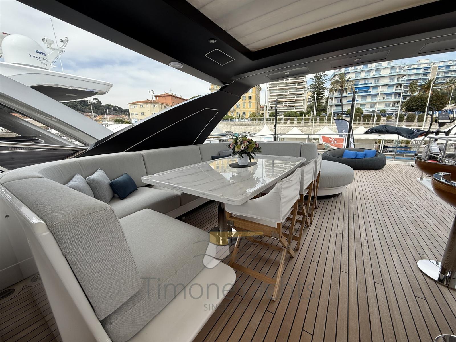 Fume/Gas Detector, Engine Alarm, Bilge Alarm, Water pressure pump, Teak Side Decks, Deck Shower, Twin Steering, Directional Spotlight, Hydraulic Flaps, Hard top, Flaps Indicators, Anchor Chain Washdown, Washbasin in the cockpit, Underwater lights, Gangway, Platform, Automatic Bilge Pump, Manual Bilge Pump, Teak deck, Entry door, Teak Cockpit, Shorepower connector, Water harbor connector system, Stabilizers (Zero speed), cockpit table, guard rails with gates, Horn, Stern Winches, Bow Winches.