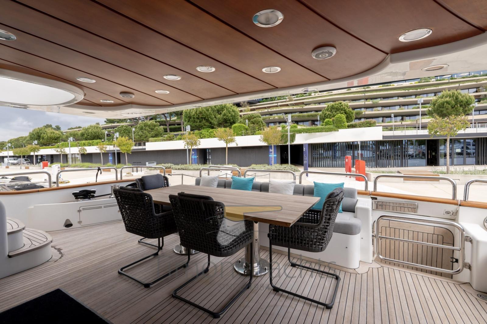 Water pressure pump, Teak Side Decks, Deck Shower, Twin Steering, Directional Spotlight, Hydraulic Flaps, Tender Garage, Davits for tender on fly, Anchor Chain Washdown, Underwater lights, Gangway, Platform, Entry door, 2 Side door, Teak Cockpit, Shorepower connector, Water harbor connector system, swimming ladder, Stabilizers, cockpit table, Tender, guard rails with gates, Horn, Stern Winches, Bow Winches.