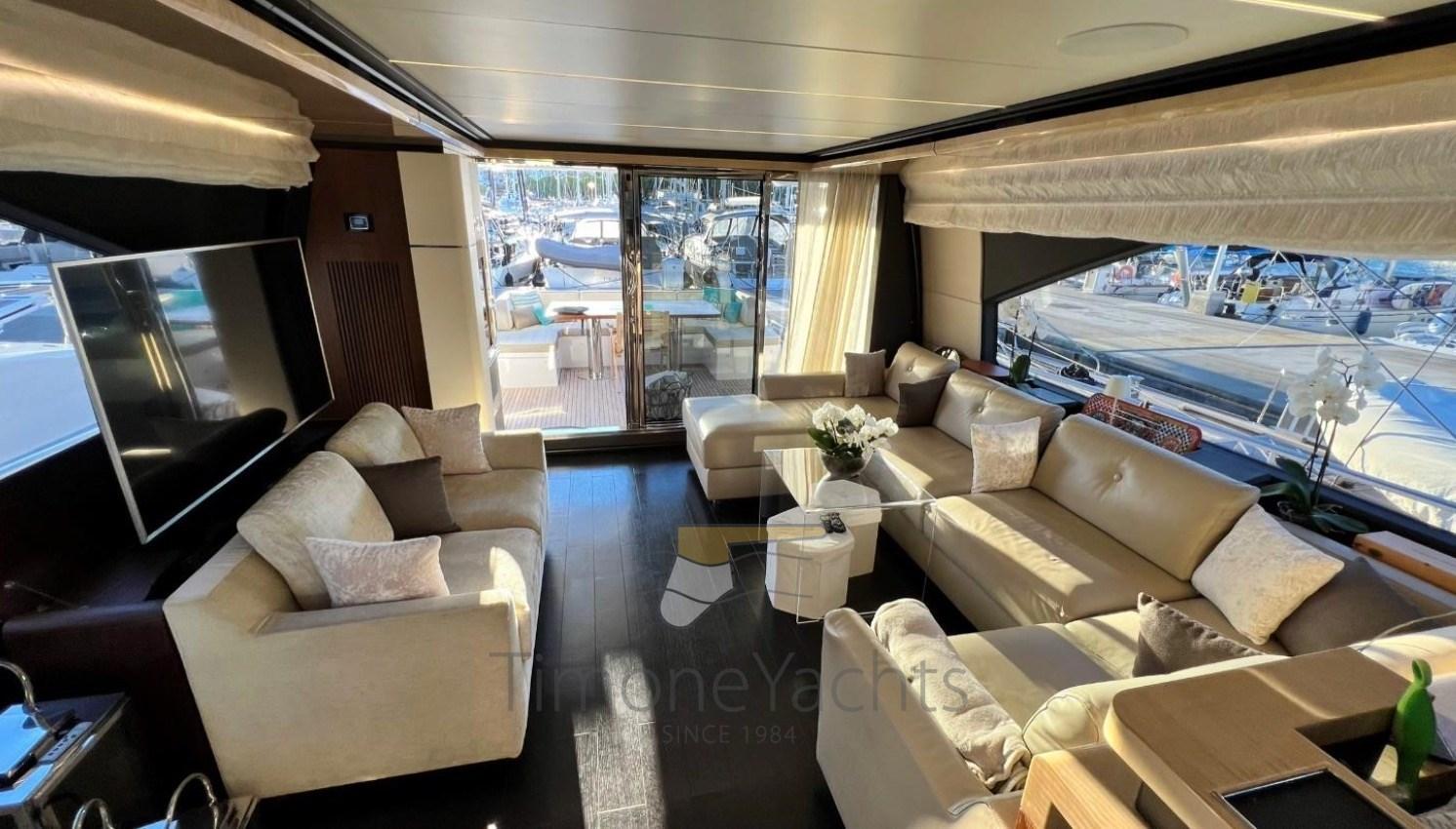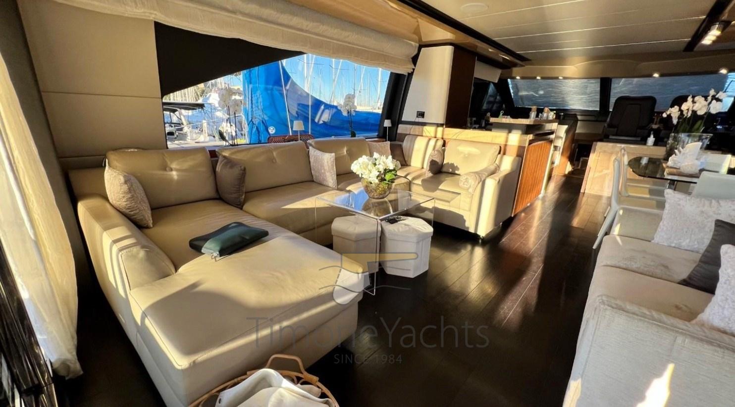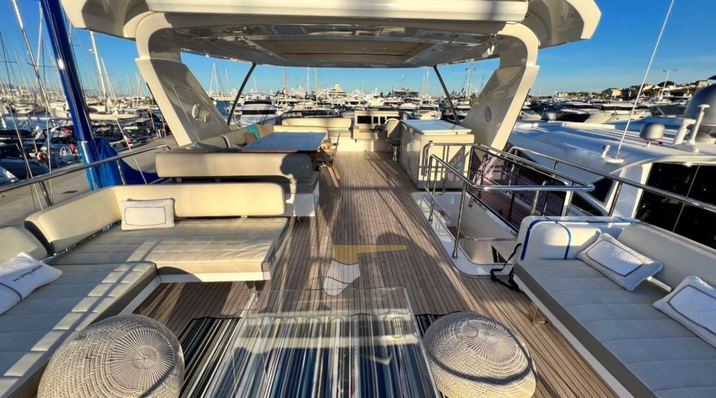 Folding cleats, Teak Side Decks, Deck Shower, Directional Spotlight, Hydraulic Flaps, Davits for tender on fly, Hard top, Fire Extinguishing System, Flaps Indicators, Anchor Chain Washdown, Courtesy Lights, Gangway, Side door, Teak Cockpit, Shorepower connector, Water harbor connector system, Stabilizers (Seakeeper), cockpit table, Tender, Horn, 2 Stern Winches, Bow Winches.
