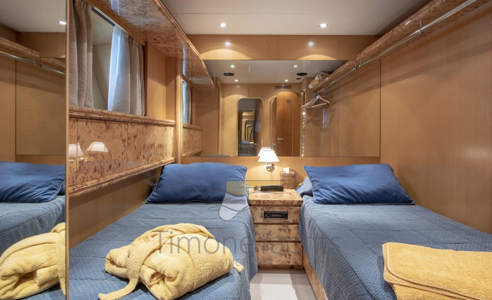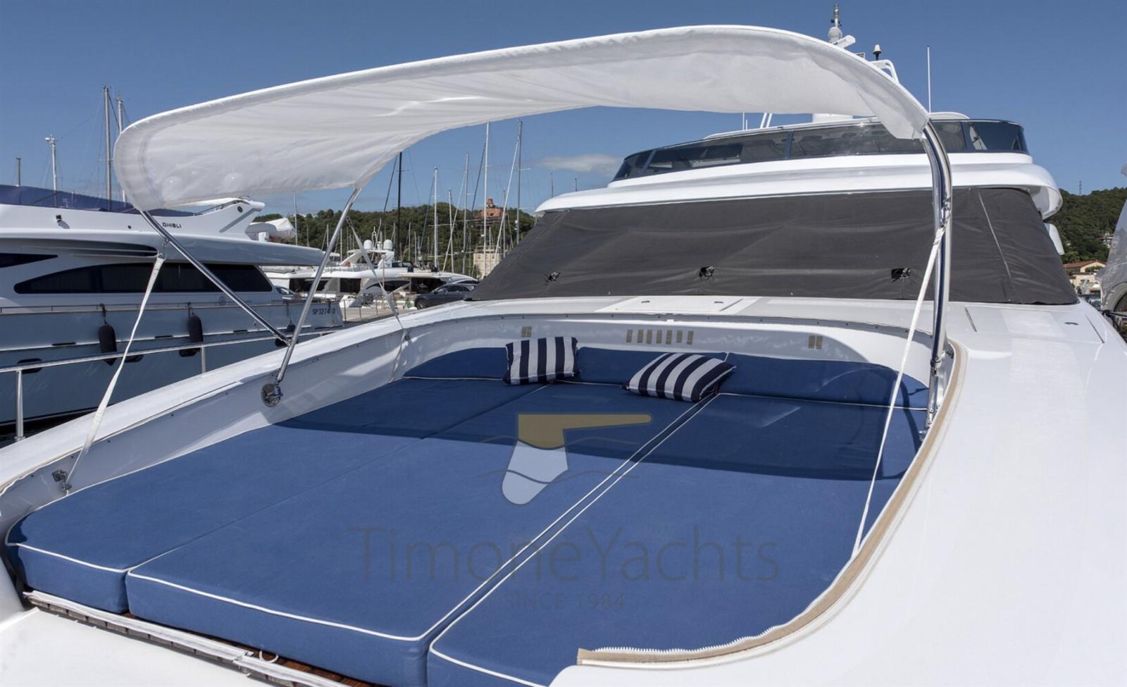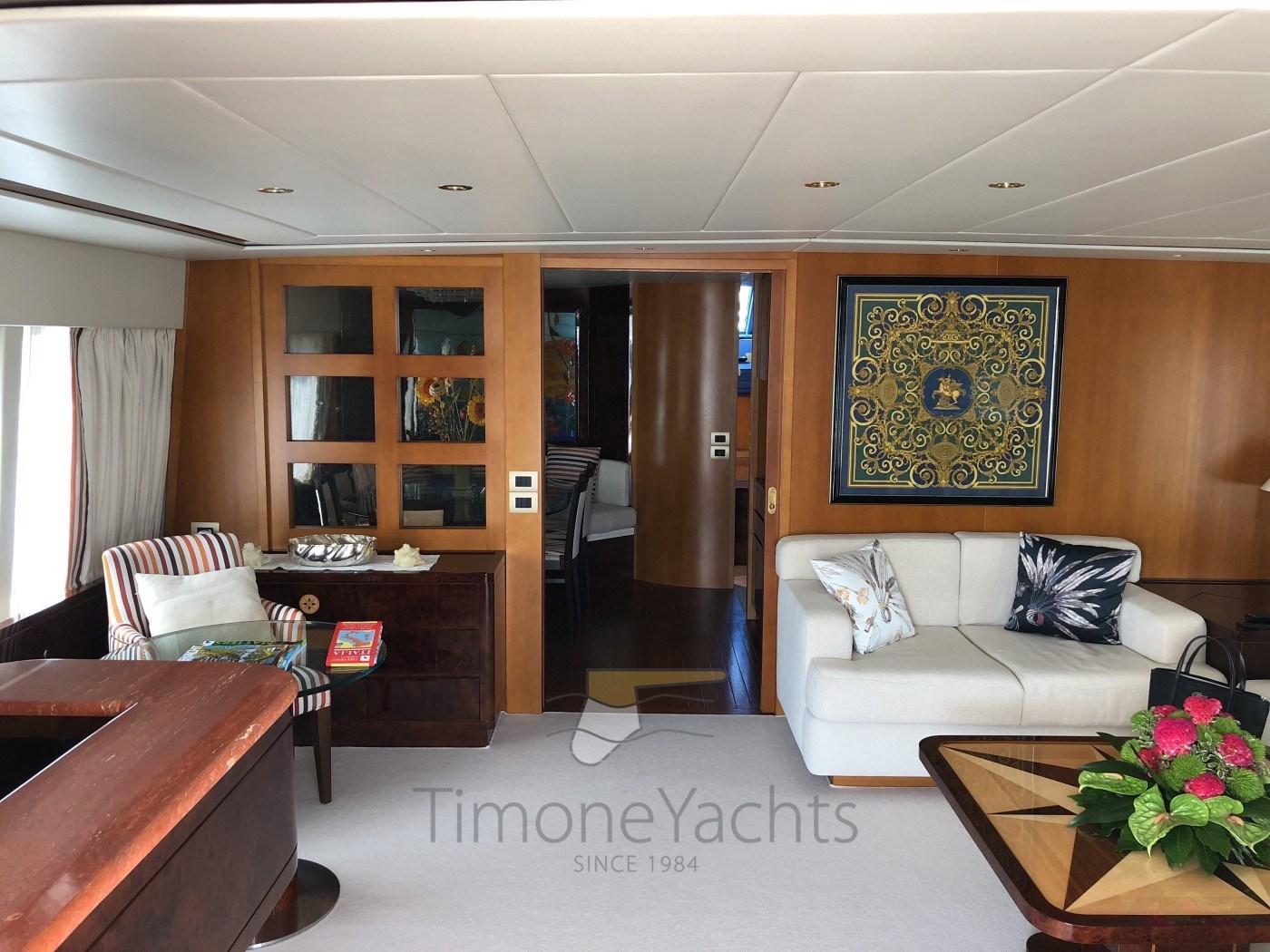 Bow thruster - Bathing ladder - Crane - Crane - Windlass - Galley - Bimini top - Bow sun cushion - Cushions - Fridge - Freeza - Oven - Microwave - Washing machine - Dish washer - Icemaker - DVD - Stereo sound system - Sat tv system - TV No. 6 - Water pump - Shore water plug - Stern mooring winch - Gangway - CD player - Manouvre Joystick - Battery charger - Fridge on fly - Sink on fly - Waste holding tank - Searchlight - Water heater - Teak platform - Teak cockpit - Crane on fly - Automatic flap - Wet bar on fly -and bar main in salon - Electric anods system (anti galvanic) - Seakeeper.