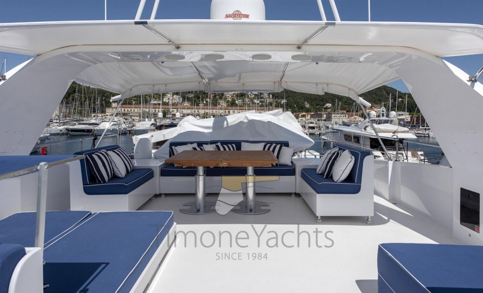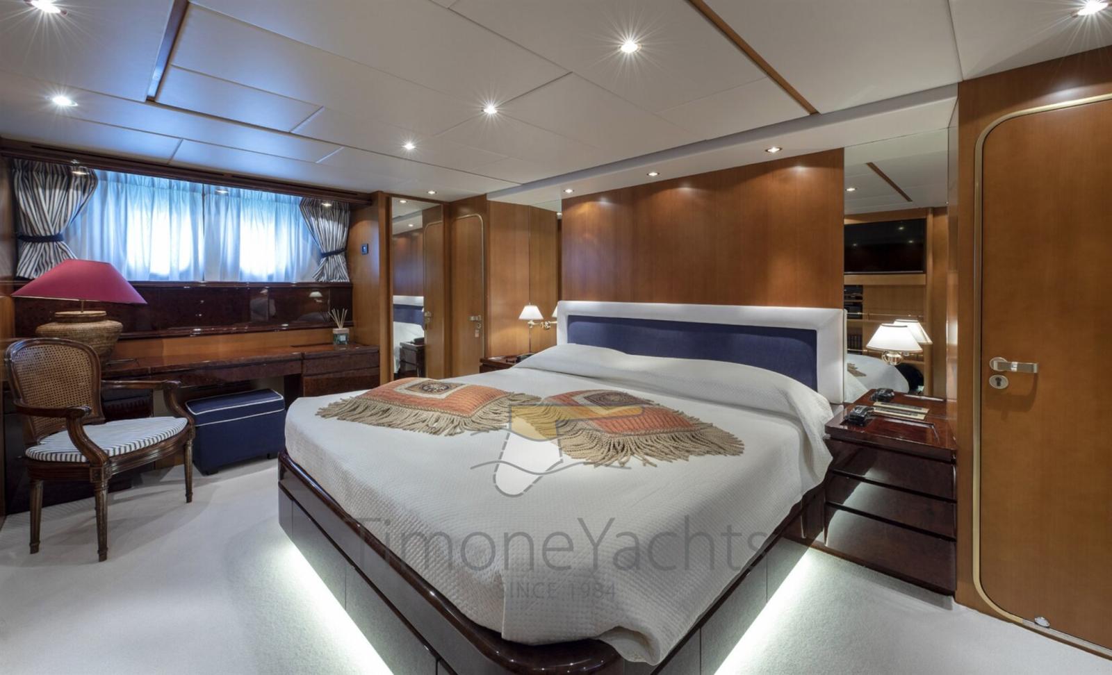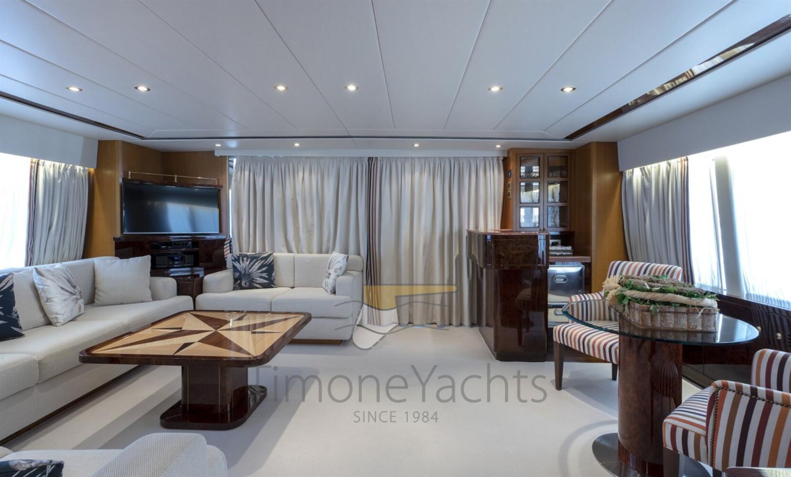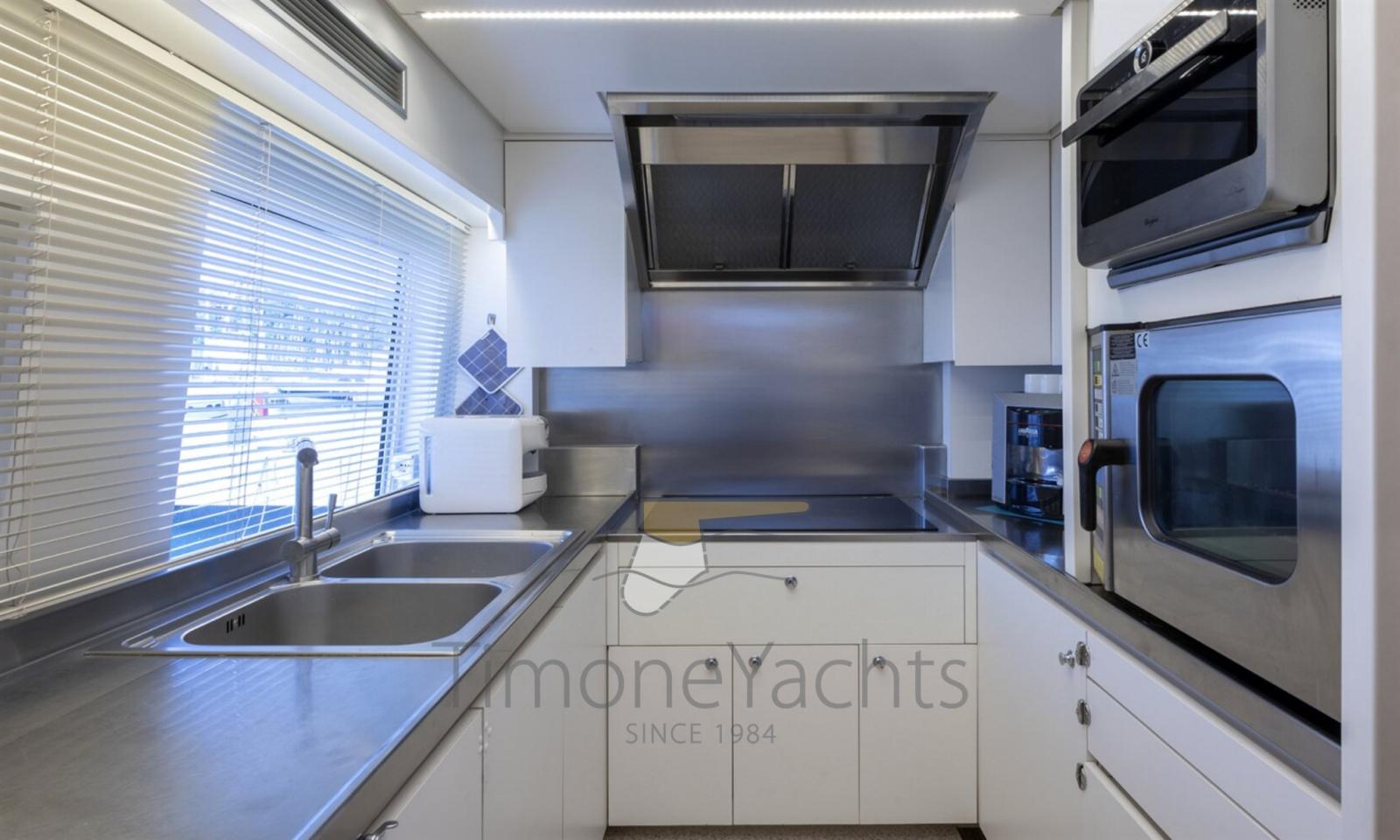 Bow thruster - Bathing ladder - Crane - Crane - Windlass - Galley - Bimini top - Bow sun cushion - Cushions - Fridge - Freeza - Oven - Microwave - Washing machine - Dish washer - Icemaker - DVD - Stereo sound system - Sat tv system - TV No. 6 - Water pump - Shore water plug - Stern mooring winch - Gangway - CD player - Manouvre Joystick - Battery charger - Fridge on fly - Sink on fly - Waste holding tank - Searchlight - Water heater - Teak platform - Teak cockpit - Crane on fly - Automatic flap - Wet bar on fly -and bar main in salon - Electric anods system (anti galvanic) - Seakeeper.