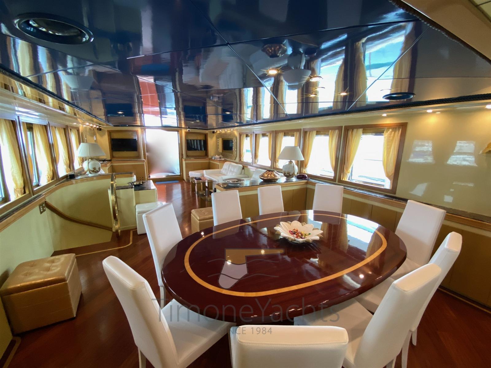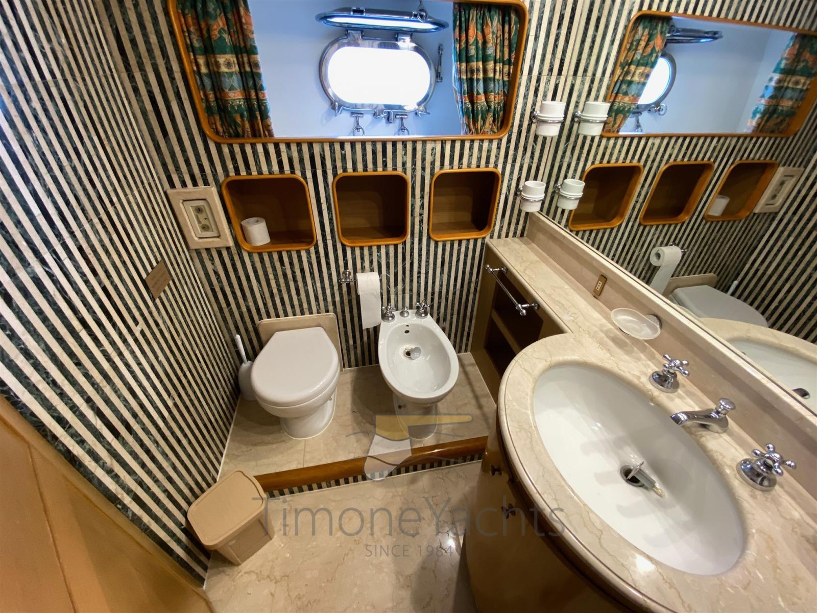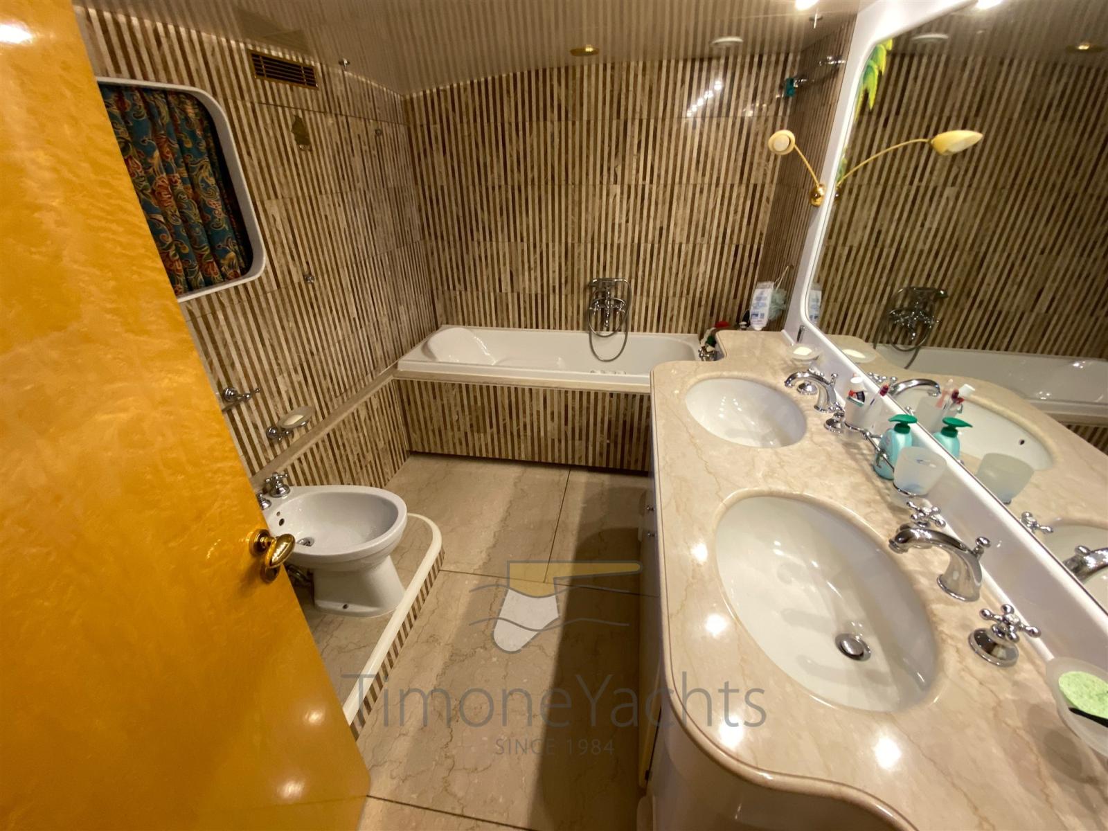 Volumes here are plenty and so is the onboard comfort. She sleeps 12 guests in 5 cabins + 6 crew in 3 cabs. Interesting features are a second galley up on main deck, as well as day head with shower and bidet along the port sidewalk: that big you couldnt name it as "daily". The flybridge is endless: once the two large tenders are in water it's easy to host a 100+ guests party up there.