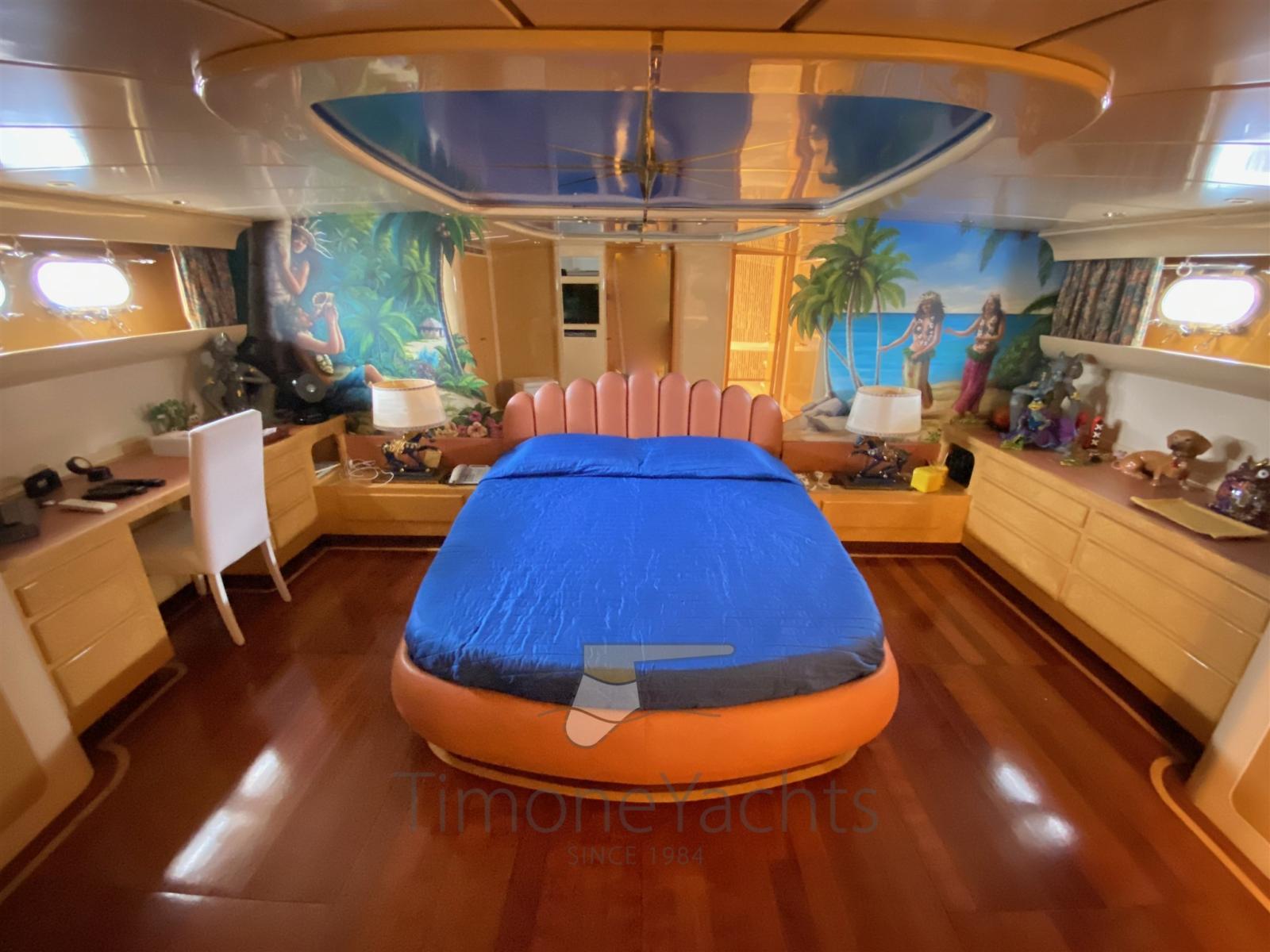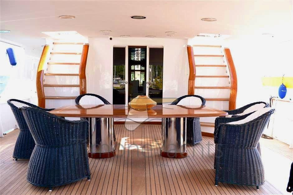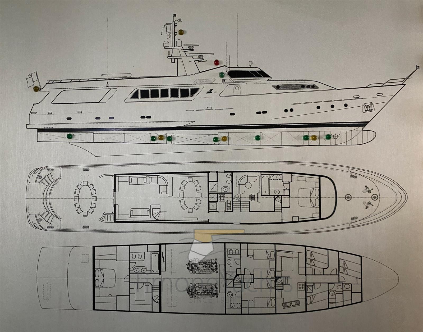 Volumes here are plenty and so is the onboard comfort. She sleeps 12 guests in 5 cabins + 6 crew in 3 cabs. Interesting features are a second galley up on main deck, as well as day head with shower and bidet along the port sidewalk: that big you couldnt name it as "daily". The flybridge is endless: once the two large tenders are in water it's easy to host a 100+ guests party up there.
