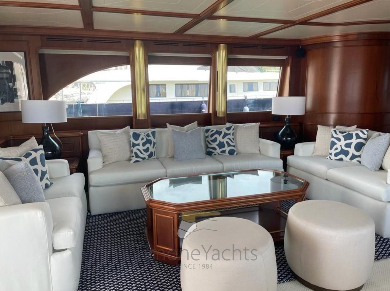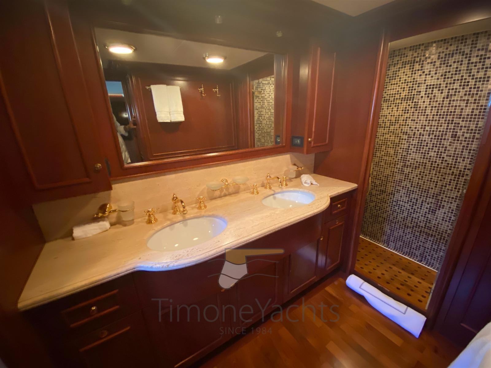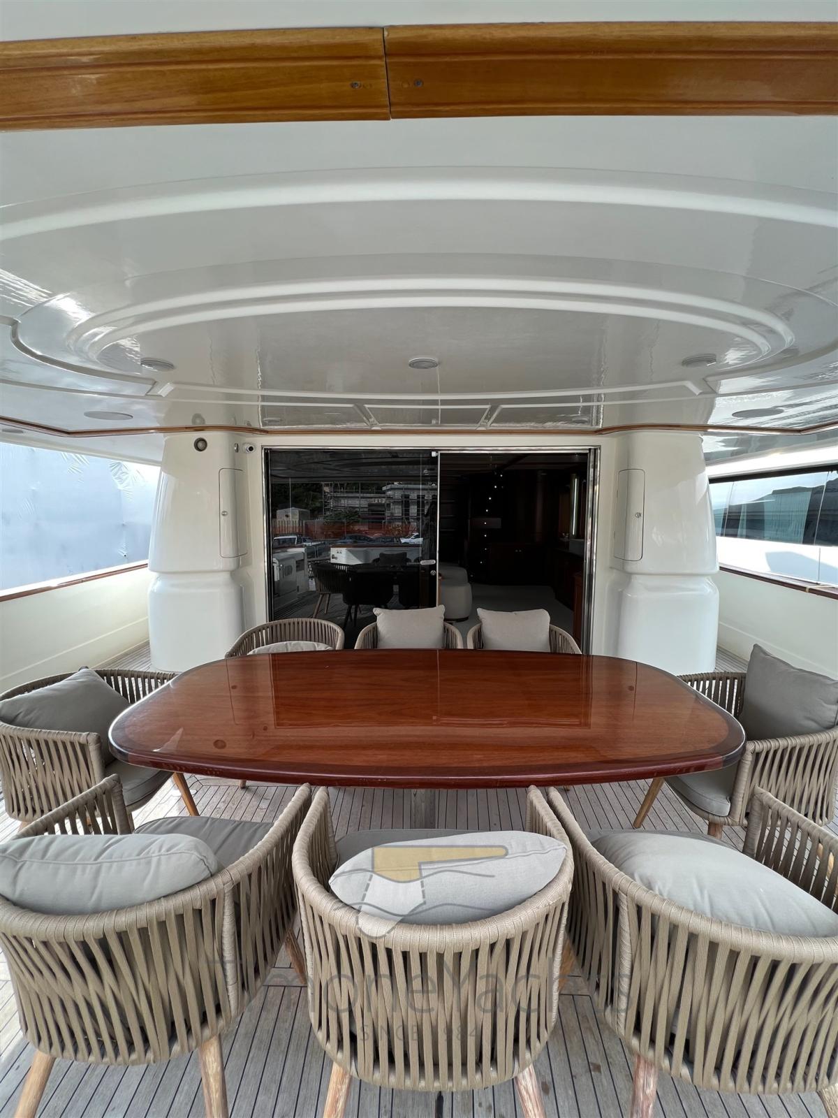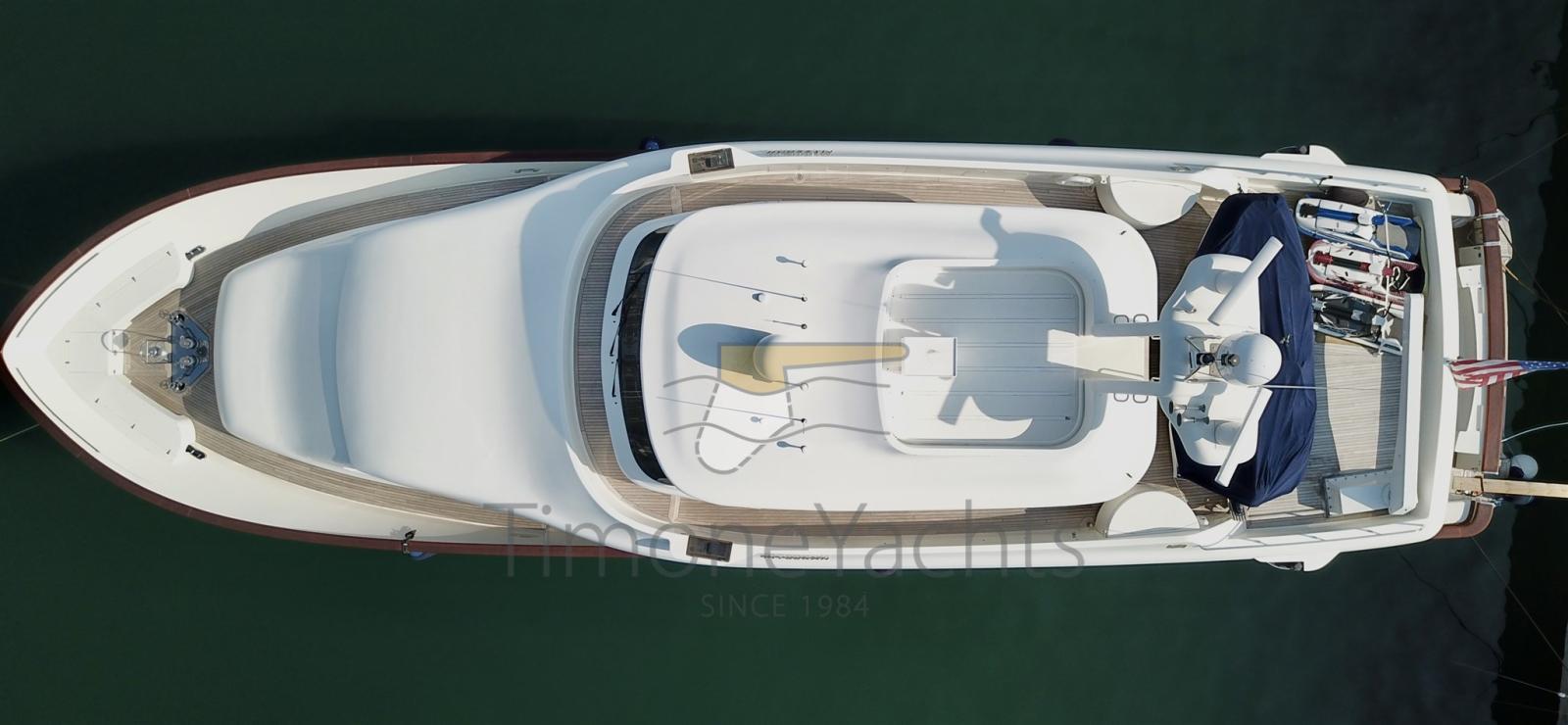 Teak Side Decks, Deck Shower, Headlights fixed on the stem, Directional Spotlight, Hydraulic Flaps, Tender Garage (garage only for jetski and beach club, tender on fly), Davits for tender on fly, Fire Extinguishing System, Flaps Indicators, Anchor Chain Washdown, Washbasin in the cockpit (on fly), Courtesy Lights, Underwater lights, Gangway, 2 Side door, Teak Cockpit, Shorepower connector, Water harbor connector system, Stabilizers (underway fins), cockpit table, 2 Stern Winches, 2 Bow Winches.