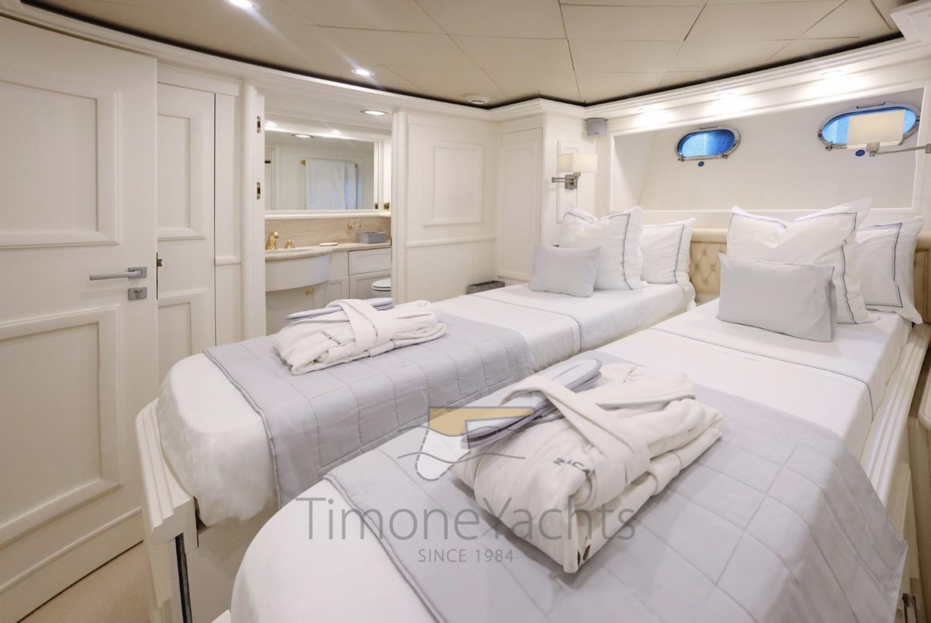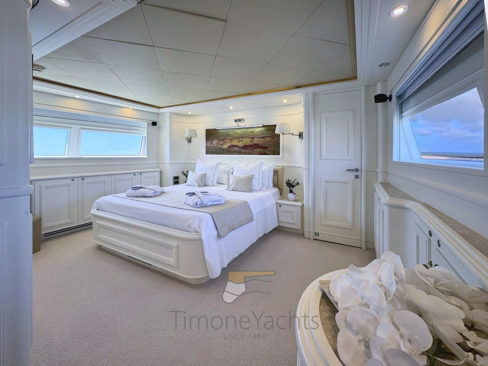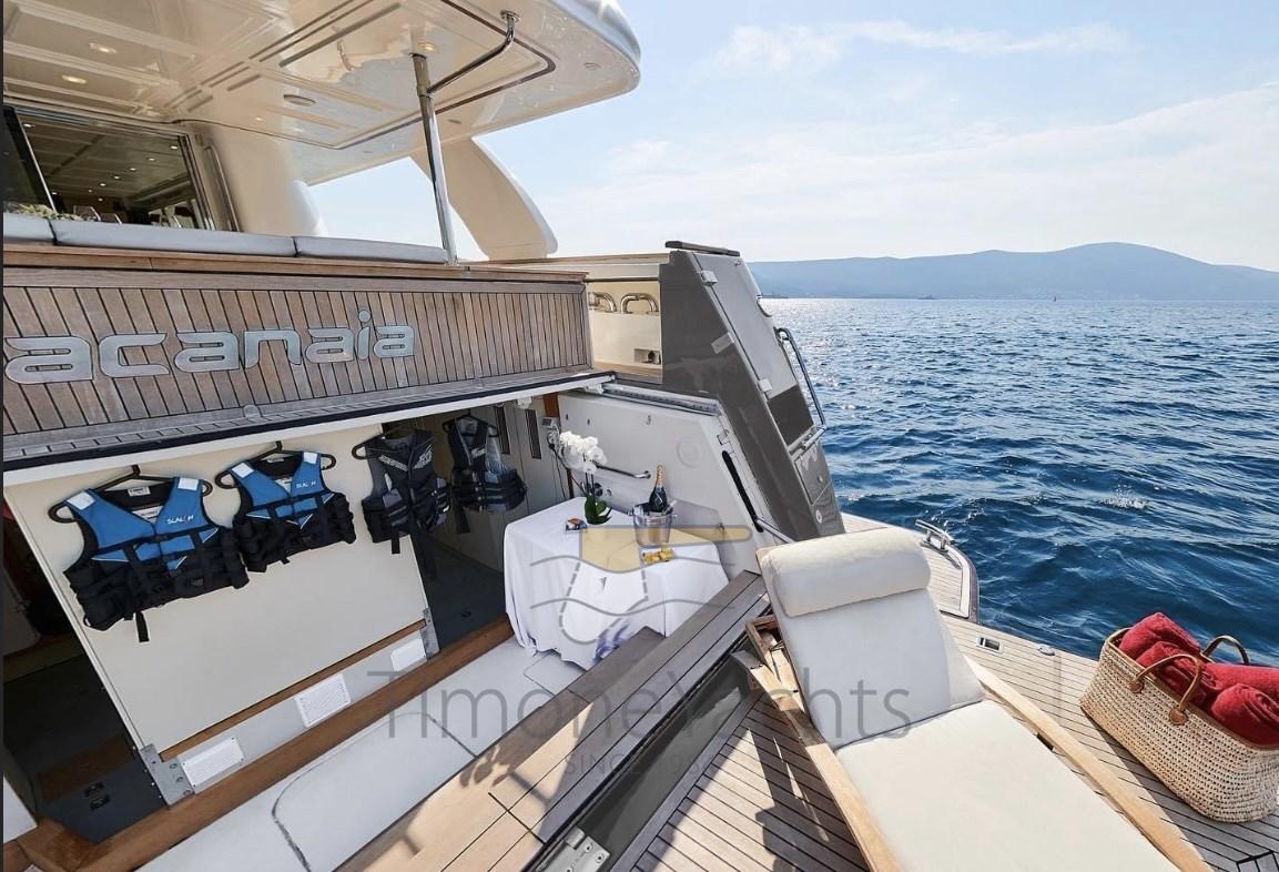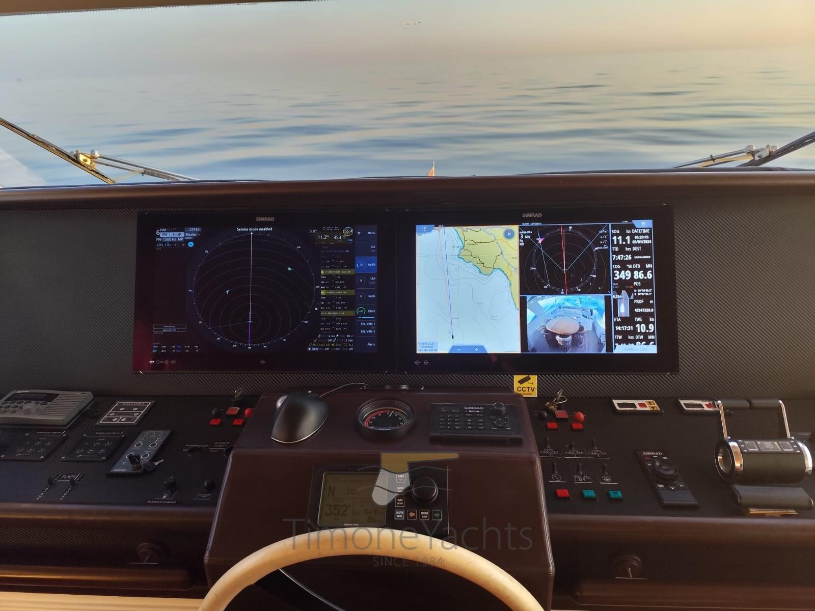 Teak Side Decks, Deck Shower, Headlights fixed on the stem, Directional Spotlight, Hydraulic Flaps, Tender Garage, Davits for tender on fly, Fire Extinguishing System, Flaps Indicators, Anchor Chain Washdown, Courtesy Lights, Underwater lights, Jet-Ski (Seadoo 60hp (year 2023)), Gangway, Side door, Teak Cockpit, Shorepower connector, Water harbor connector system, Waste Water Purifier System (Hamann), 4 Stabilizers (nr.3 ARG gyro + fins), cockpit table, Tender (Saxador 200 sport (year 2023)), Horn, 2 Stern Winches, 2 Bow Winches.