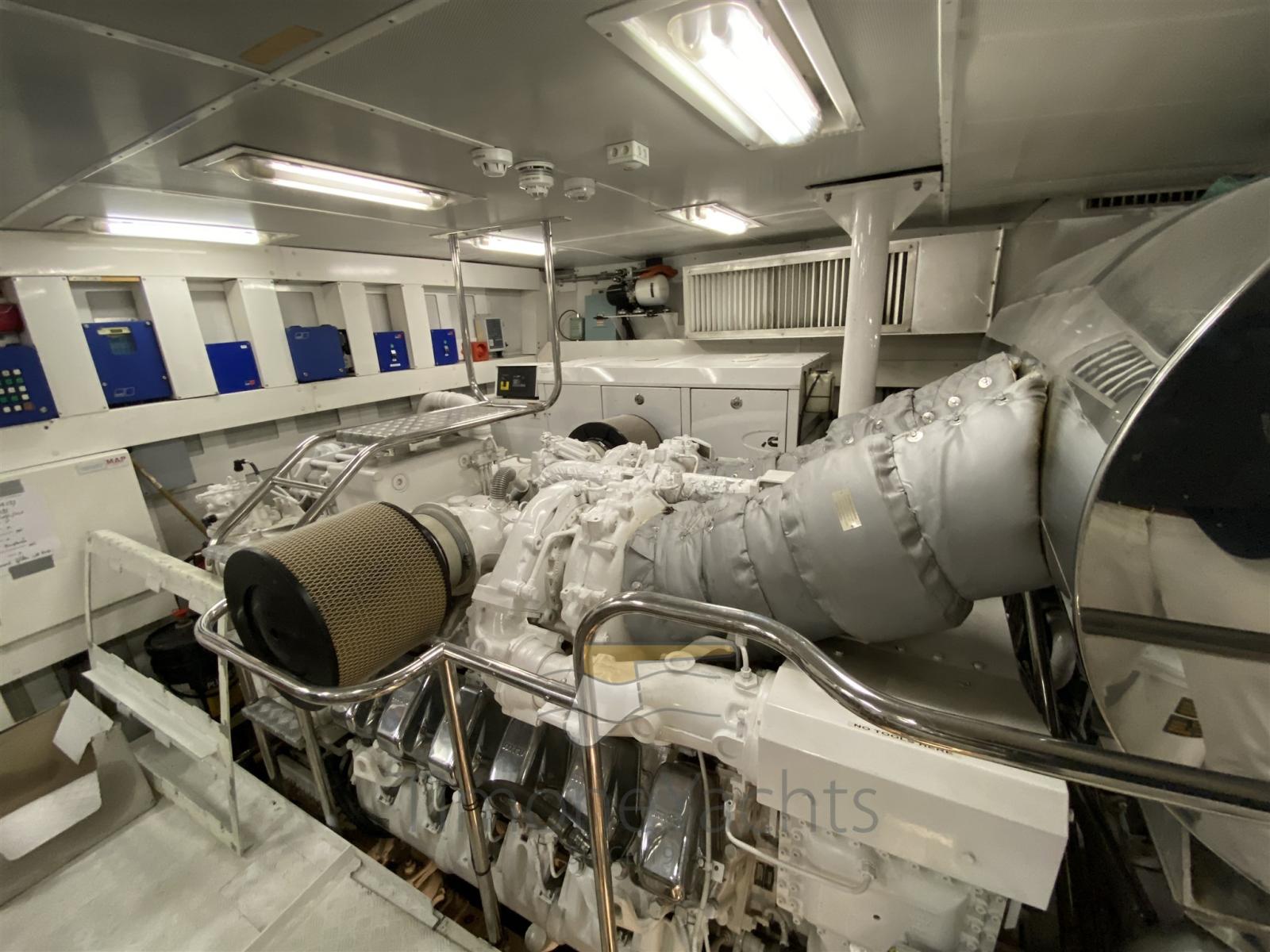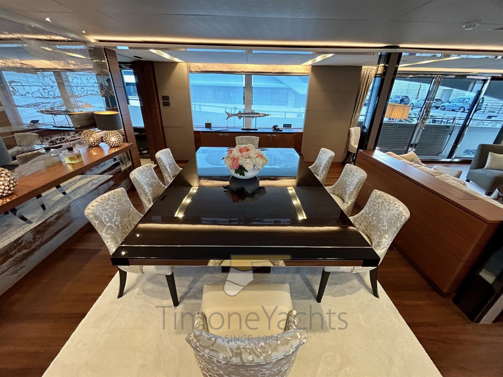 Fume/Gas Detector, 2 Engine Alarm, Bilge Alarm, Water pressure pump, Folding cleats, Teak Side Decks, Deck Shower, Twin Steering, Headlights fixed on the stem, Directional Spotlight, Hydraulic Flaps, Tender Garage, Hard top, Fire Extinguishing System, Flaps Indicators, Anchor Chain Washdown, Courtesy Lights, Underwater lights, Gangway (elettroidraulica), Platform, Entry door, 2 Side door, Teak Cockpit, Shorepower connector, Water harbor connector system, Voltage Rectifier, 2 Hydraulic Windlass, swimming ladder, Saddles for tender, Stabilizers (ABI TRAC FINS), cockpit table, Tender, Horn, 2 Stern Winches, 2 Bow Winches.