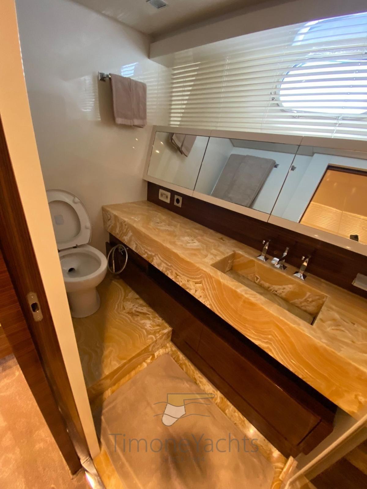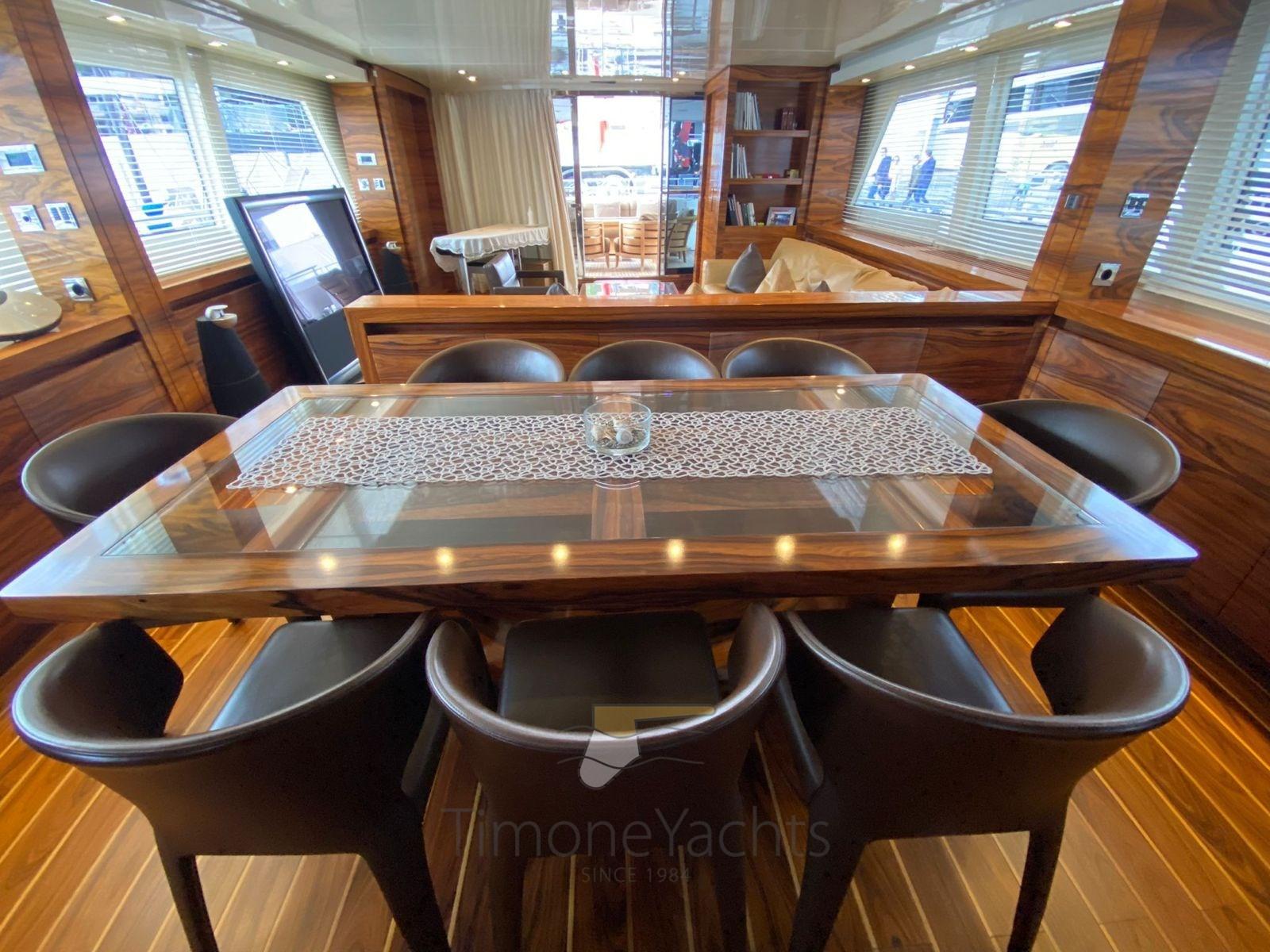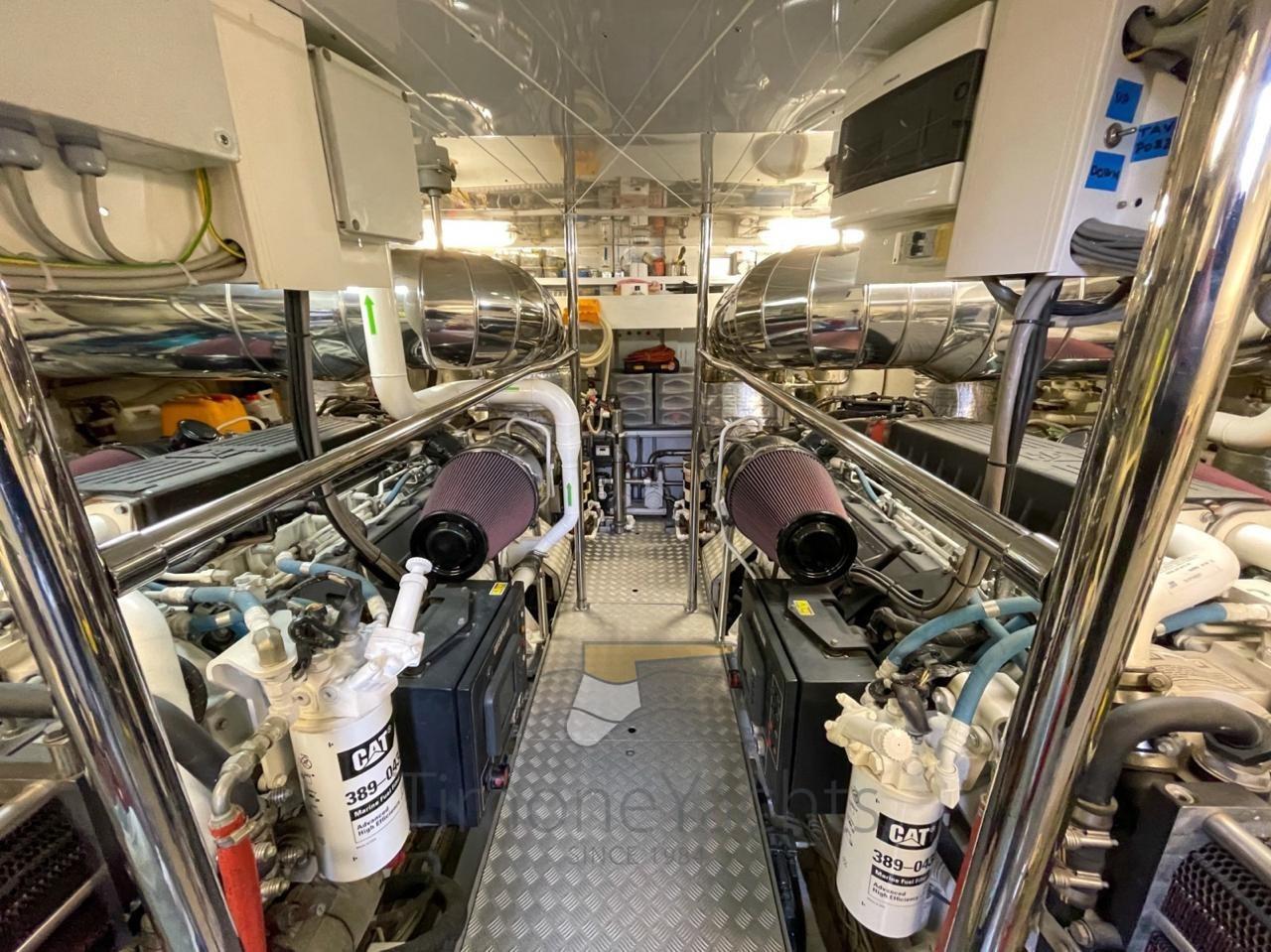 Equipped with CAT C32 DITA engines, the yacht is capable of speeds of up to 28 knots. The flybridge