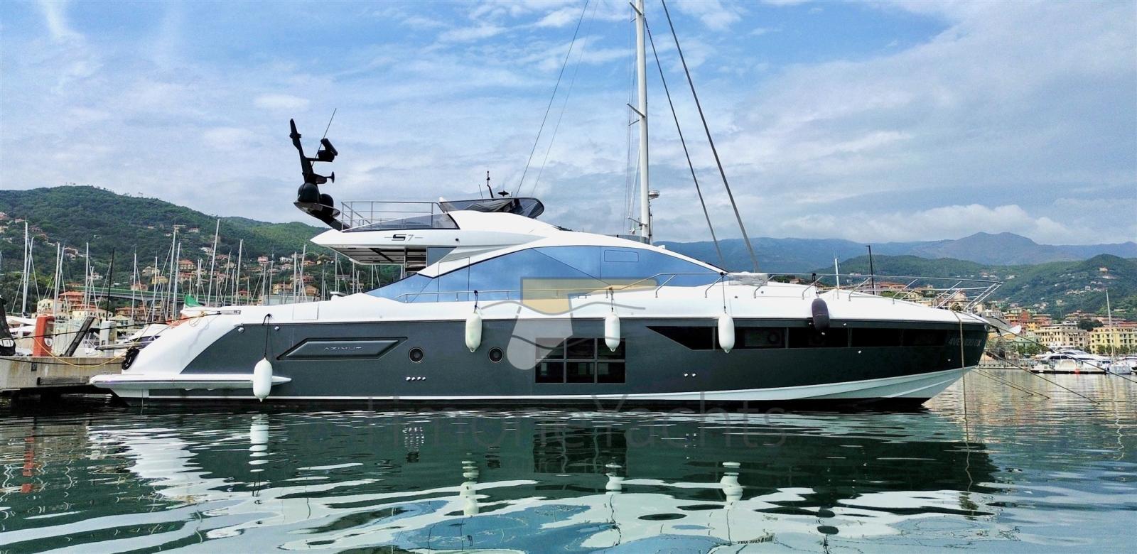 The Azimut S7 is quite something. Talking about a 21,4mts babe with her whole superstructure that's 100% carbon, tops 37 kts, cruises 30kts and burns 260lts/h at 26kts "low" cruise. Seakeeper stabilized, garage that recovers tender + jetski, 4 guest cabins and sleeps 2 crew, galley up. A mini fly that's a peach, cockpit and foredeck made for Mediterranean summer bliss.