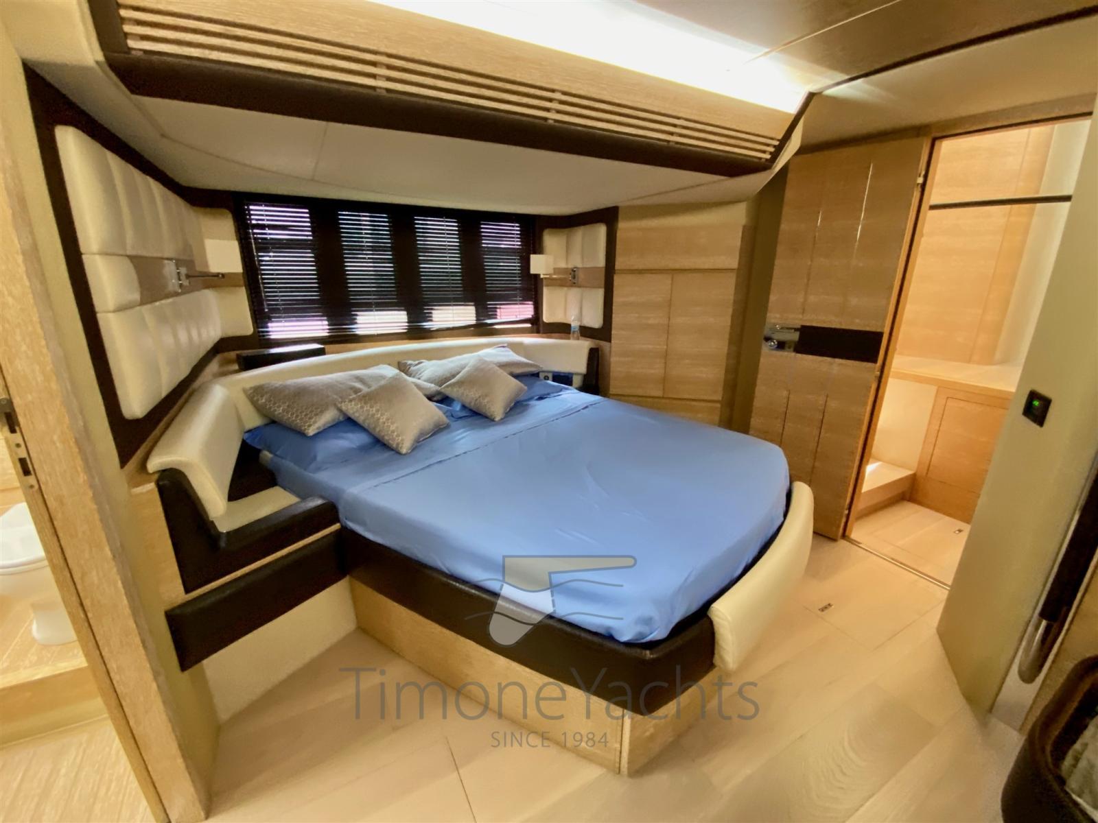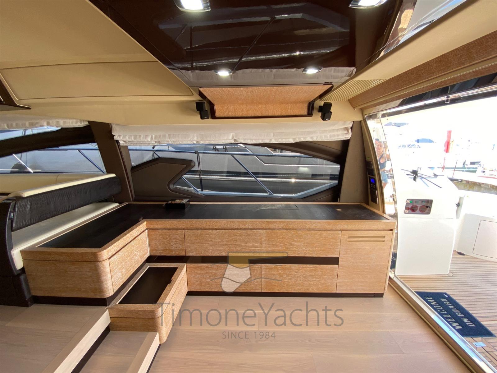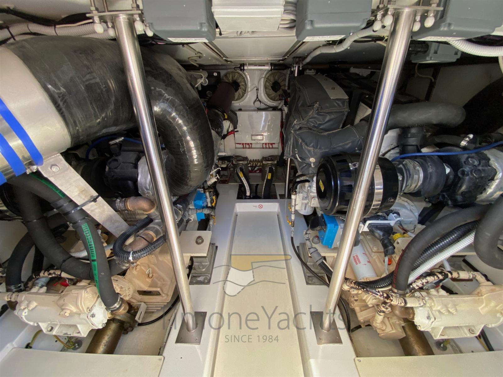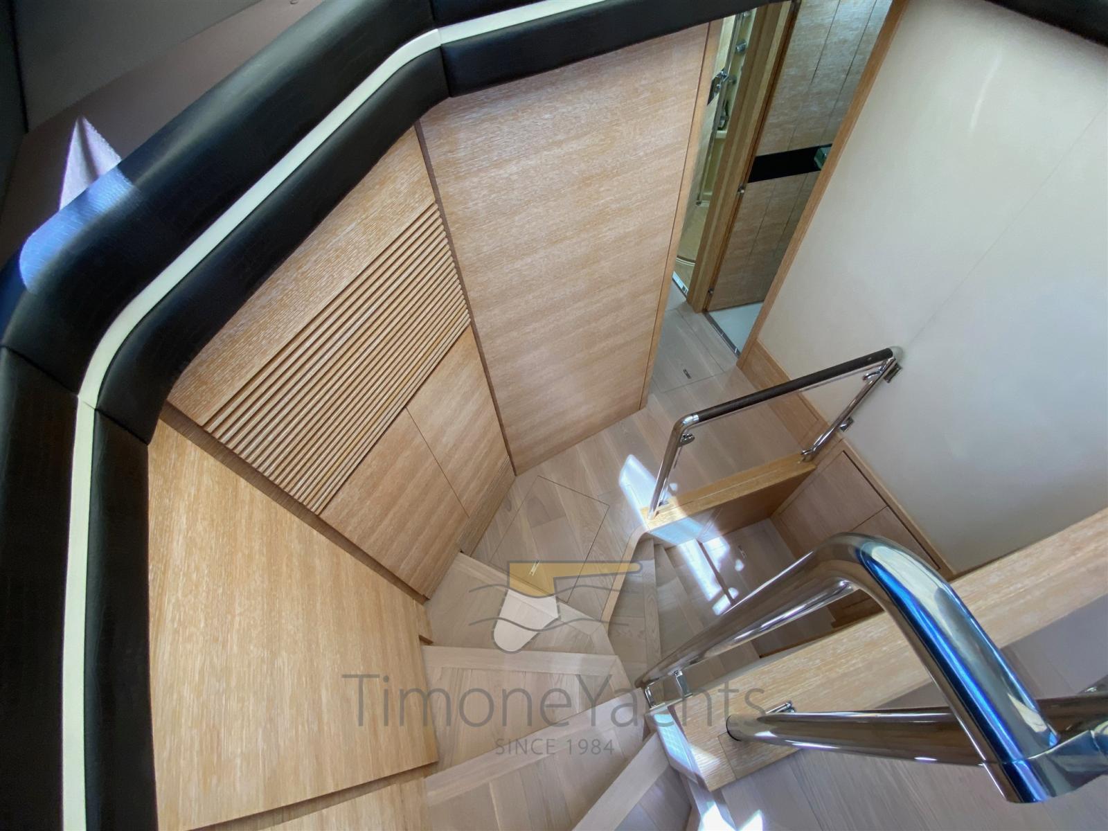 Teak Side Decks, Deck Shower, Headlights fixed on the stem, Directional Spotlight, Hydraulic Flaps, Hard top, Fire Extinguishing System, Flaps Indicators, Anchor Chain Washdown, Washbasin in the cockpit (on fly), Underwater lights, Gangway, Teak Cockpit, Shorepower connector, Water harbor connector system, cockpit table, Horn, 2 Stern Winches, Bow Winches.