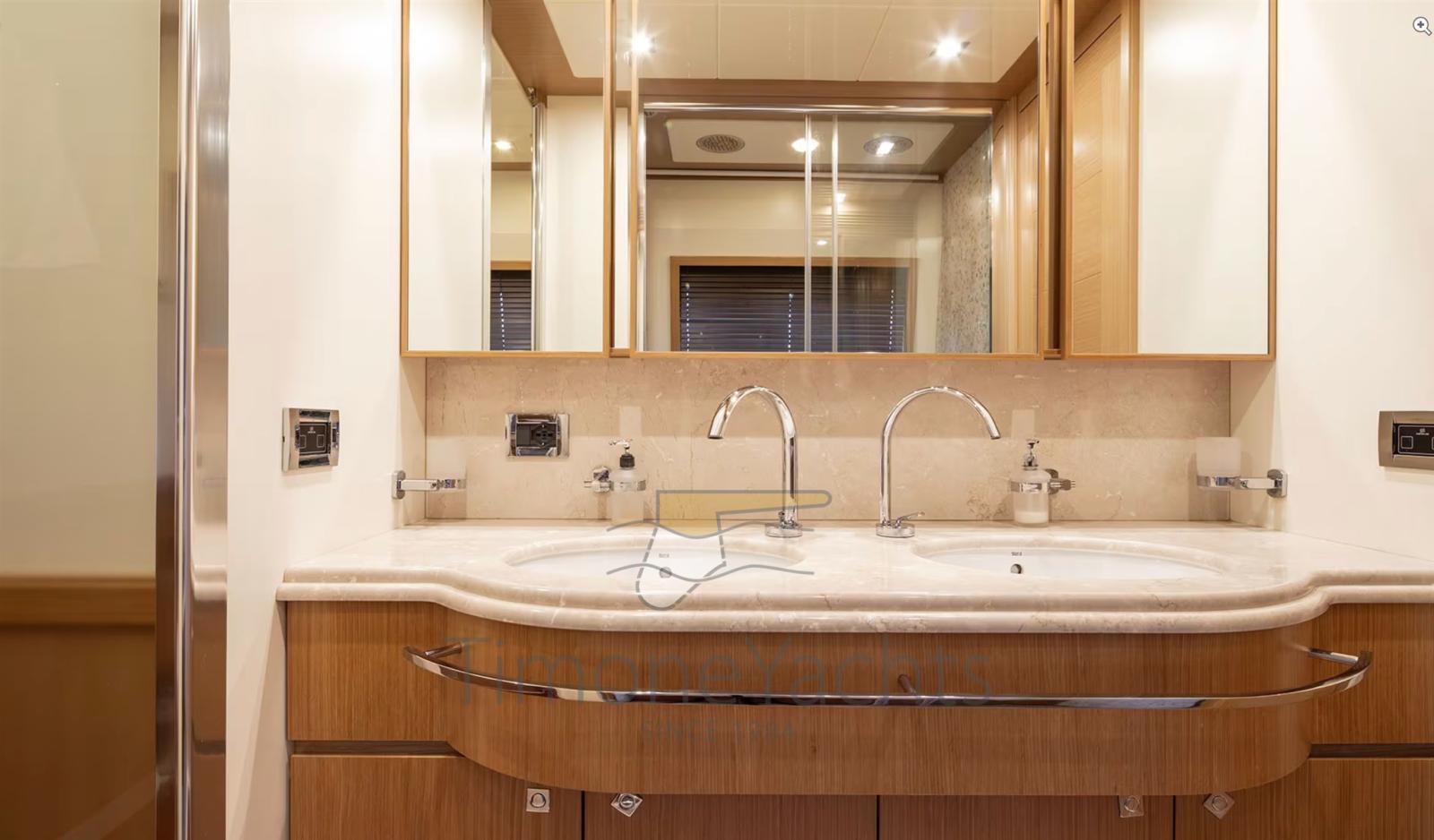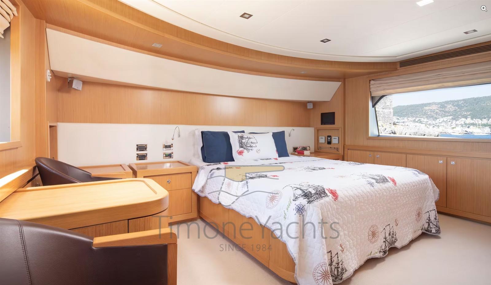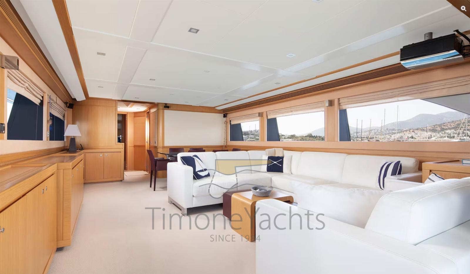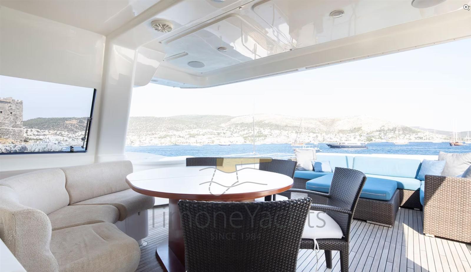 Alternator, Water pressure pump, Teak Side Decks, Deck Shower, Twin Steering, Directional Spotlight, Tender Garage, Davits for tender on fly, Hard top, Fire Extinguishing System, Anchor Chain Washdown, Washbasin in the cockpit, Courtesy Lights, Gangway, Teak deck, Entry door, 4 Side door, Teak Cockpit, Shorepower connector, Water harbor connector system, Saddles for tender, Stabilizers (Zero Speed Stabilizers), cockpit table, Tender (4.3m Capelli tender with 70hp Yamaha engine), Horn, 2 Stern Winches, Bow Winches.