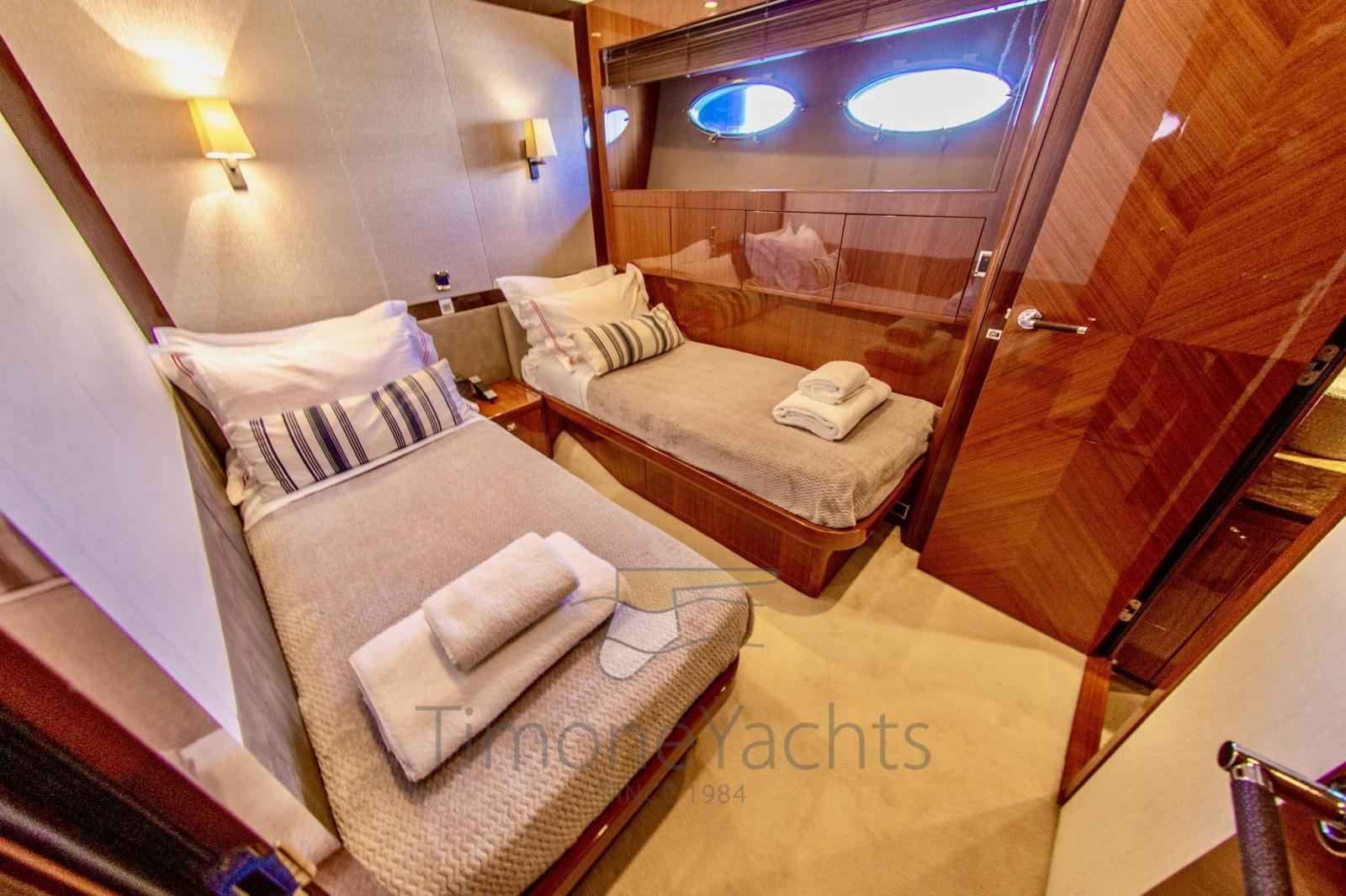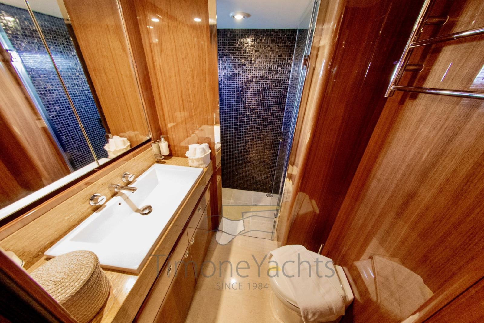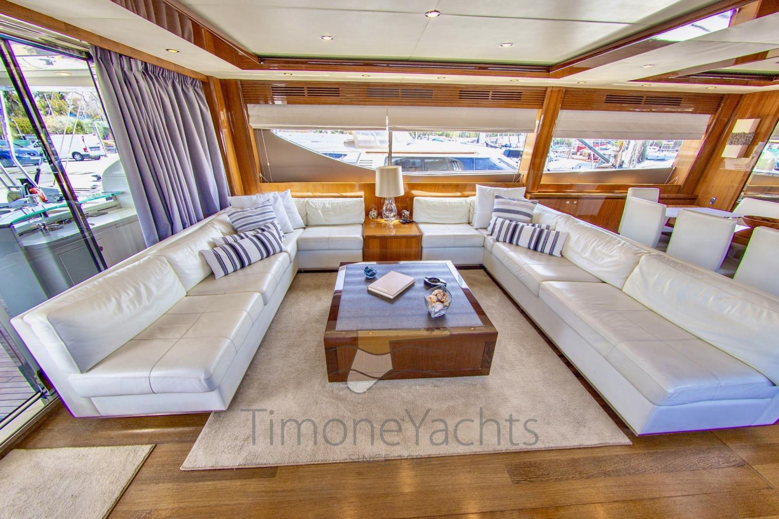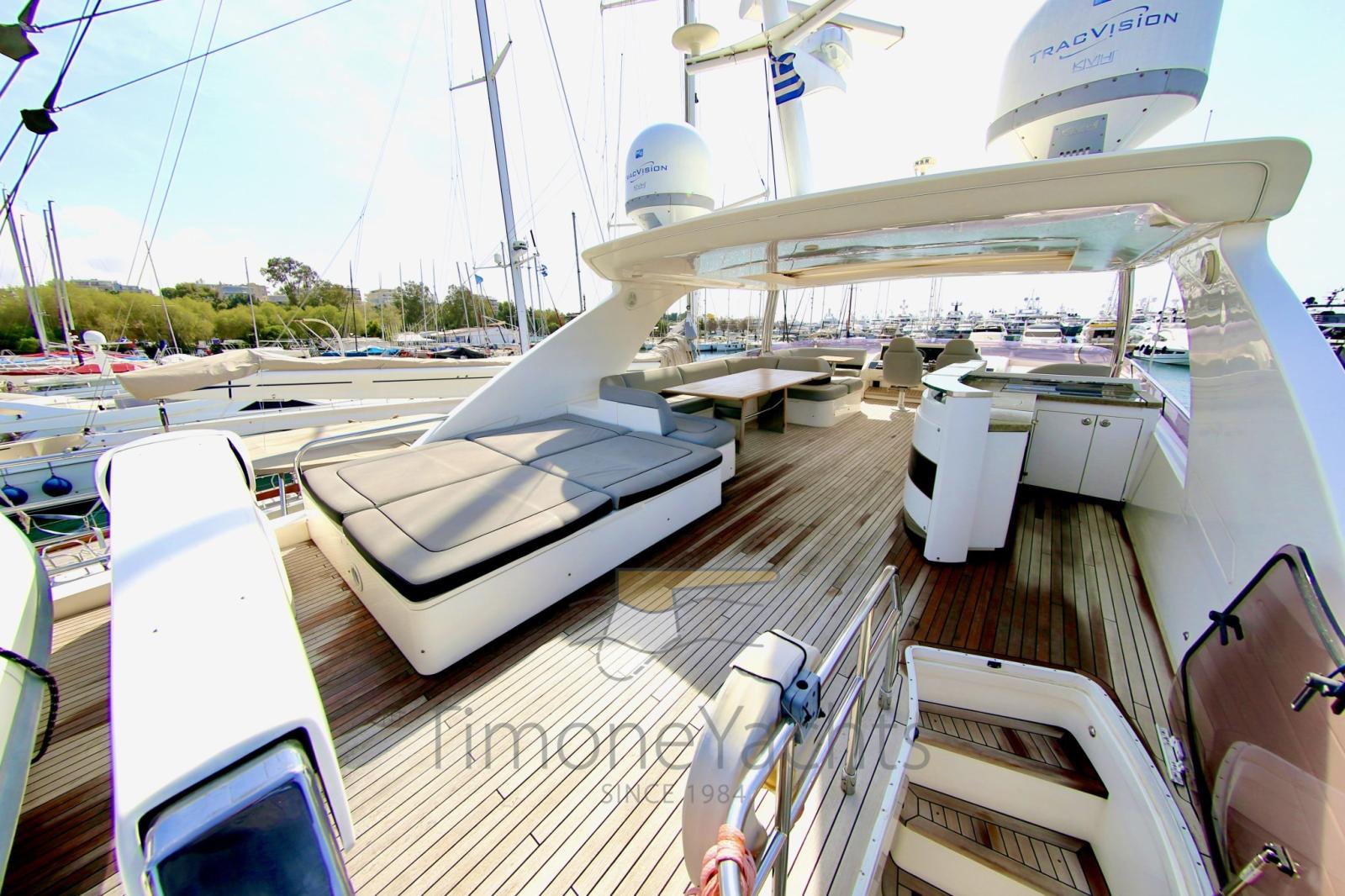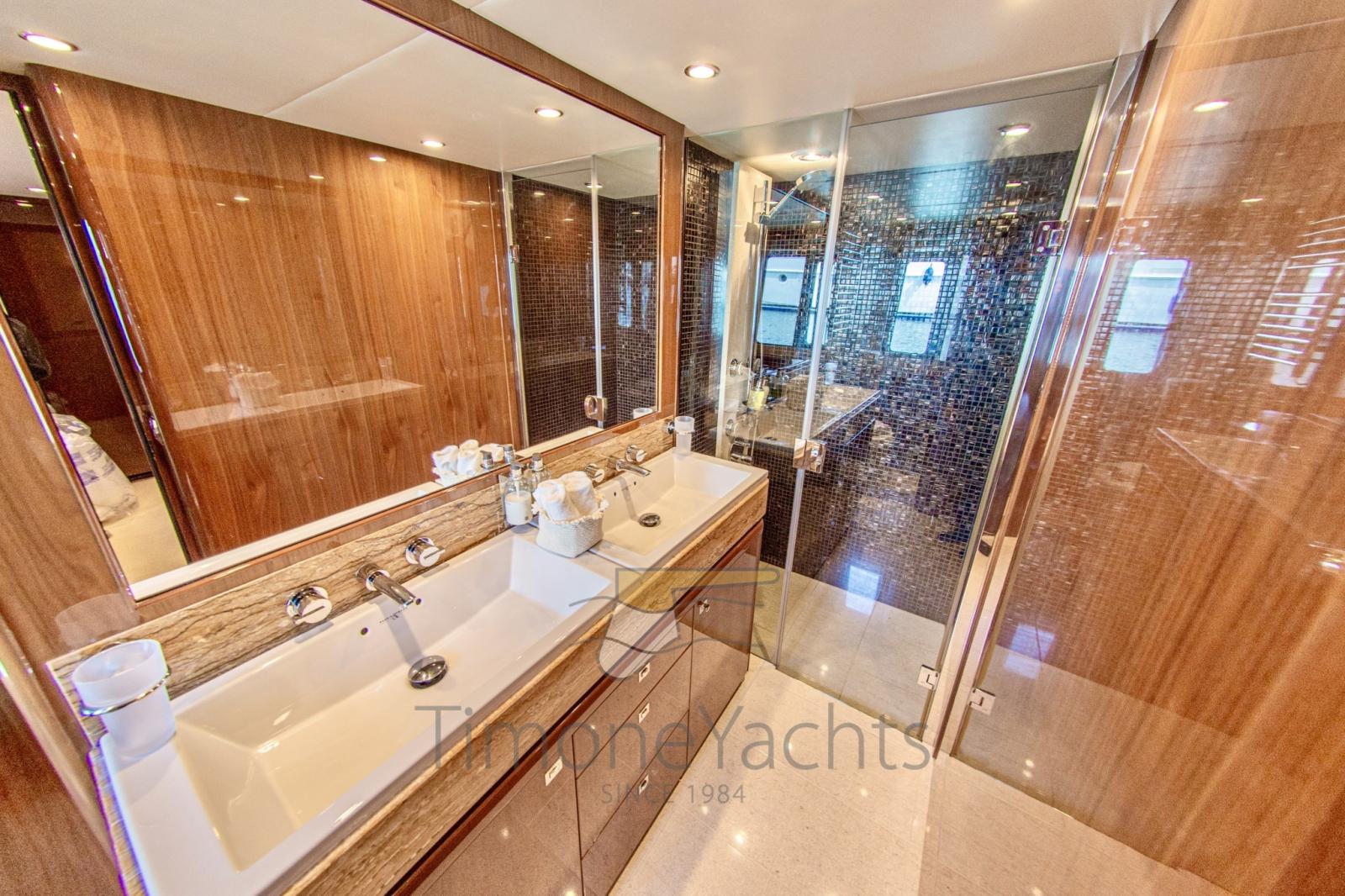 Fume/Gas Detector, 2 Engine Alarm, Bilge Alarm, Alternator, Water pressure pump, Teak Side Decks, Special Colour, Deck Shower, Twin Steering, Hydraulic Flaps, Tender Crane, Hard top, Fire Extinguishing System, Flaps Indicators, Anchor Chain Washdown, Washbasin in the cockpit, Courtesy Lights, Gangway (elettroidraulica), Platform (elettroidraulica), 5 Automatic Bilge Pump, Teak deck, Entry door, Side door, Teak Cockpit, Shorepower connector, Water harbor connector system, Rollbar, Electric Windlass, swimming ladder, Saddles for tender, Stabilizers (Fin Stabilizer), cockpit table, Tender (Williams 445), Horn, 2 Stern Winches, Bow Winches.