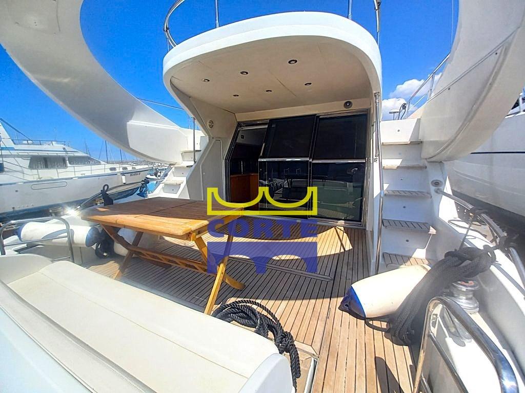 Large sundecks in the bow and on the flybridge, dinette with double sofa facing each other on the flyi bridge, roll bar that covers part of the cockpit, double ladder leading down to the aft bridge.