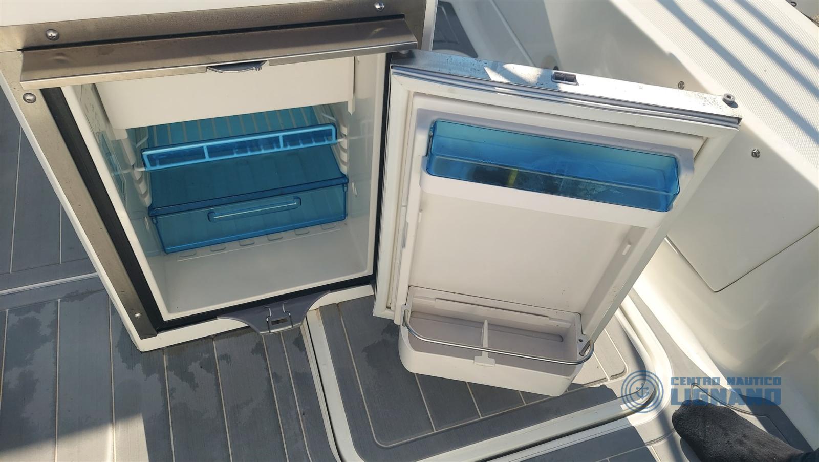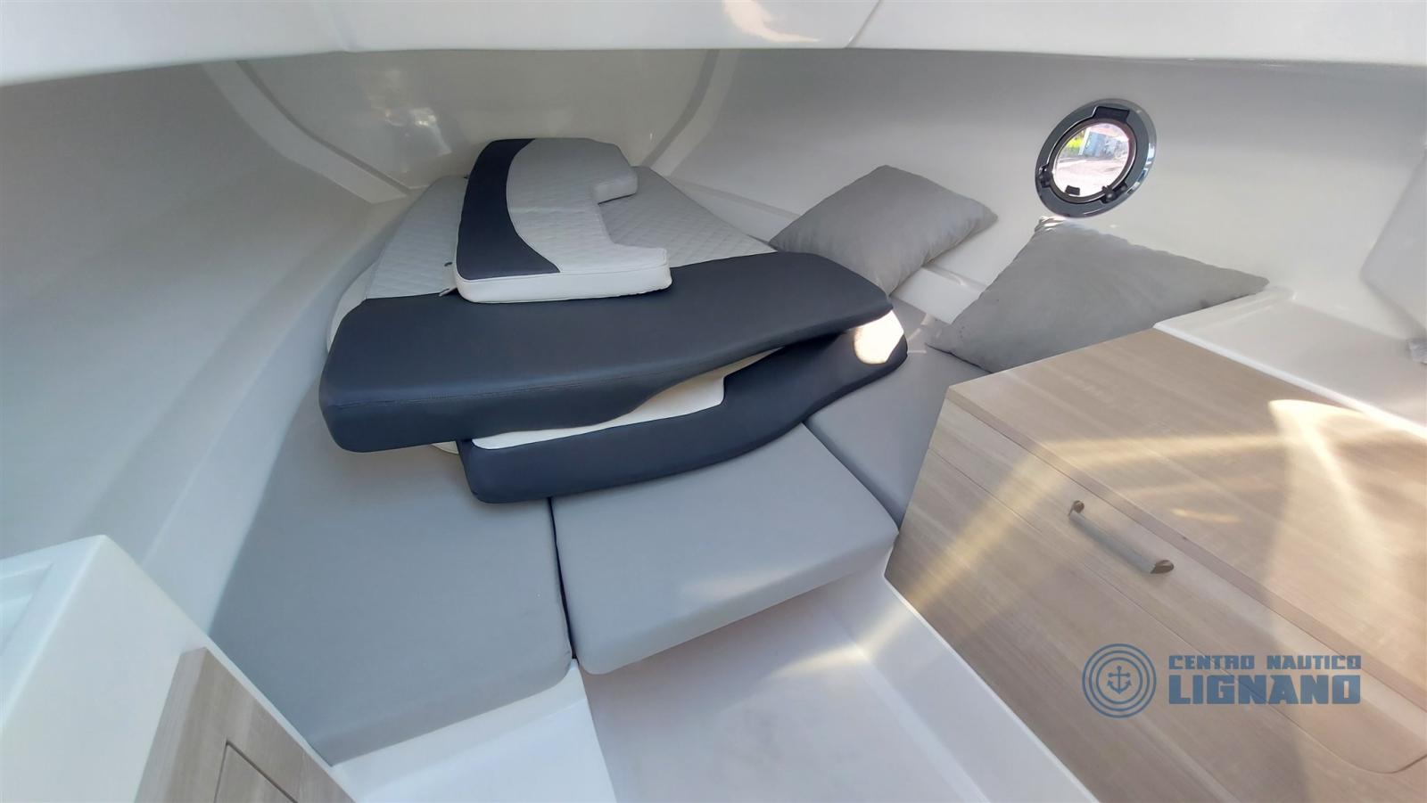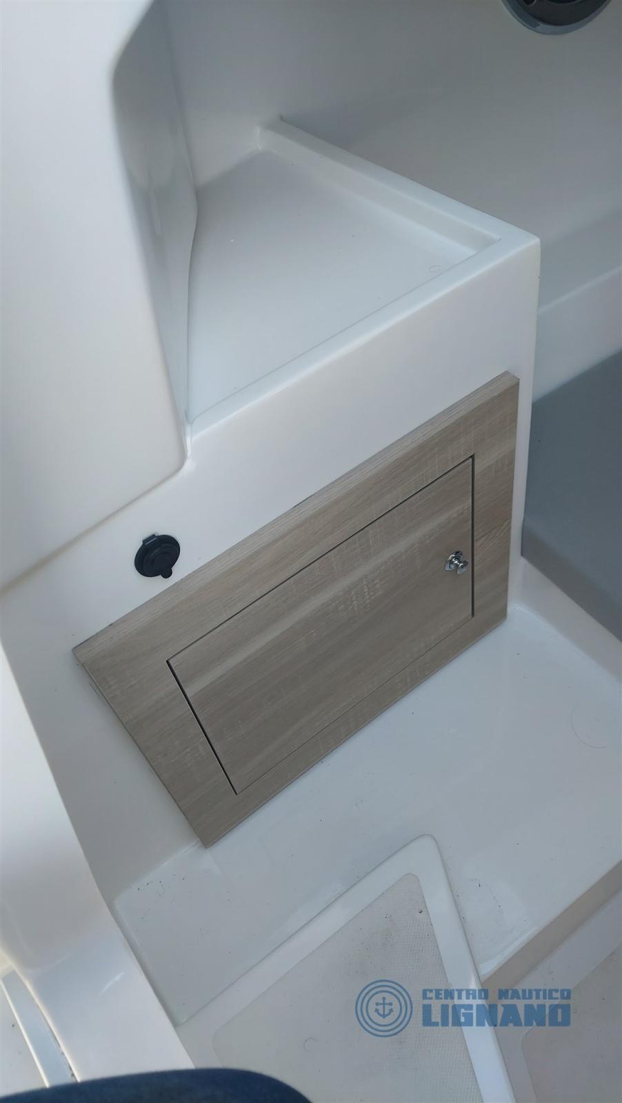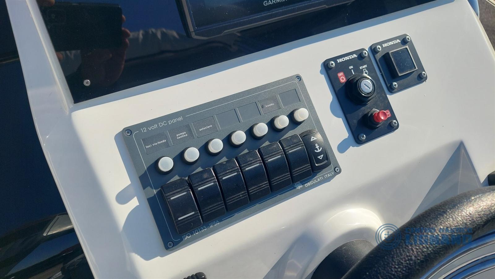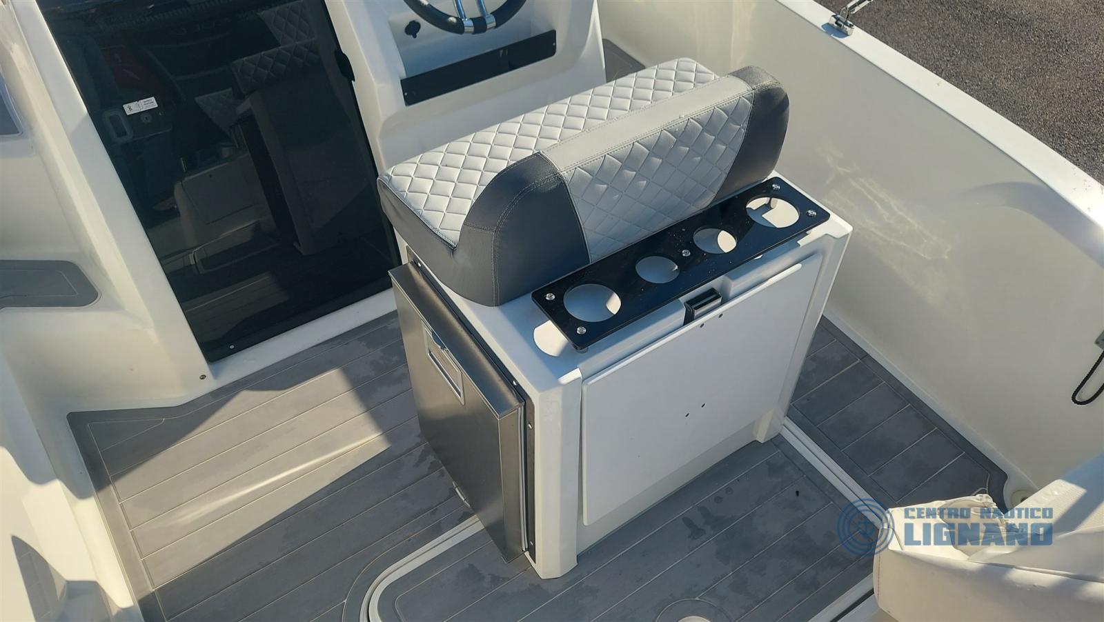 On-board equipment: special cockpit cabinet with integrated table and stainless steel refrigerator with icebox, Garmin Echomap UHD 7 HP GPS with map and stern transducer, gray synthetic full teak in the same color as cushions and side color, electrical system with double battery, shower system with tank, electric marine toilet system, second porthole in the cabin, electric windlass anchor and chain, second question at the bow for winch, stainless steel sun awning, horn, cover sheet kit (3 pieces), fixed fuel system 82 lt with boarding cap, 2 lighter sockets, water tank with shower system, light in the cabin, complete two-tone gray and perfect cushions, double battery system with diverter, decanter fuel filter.