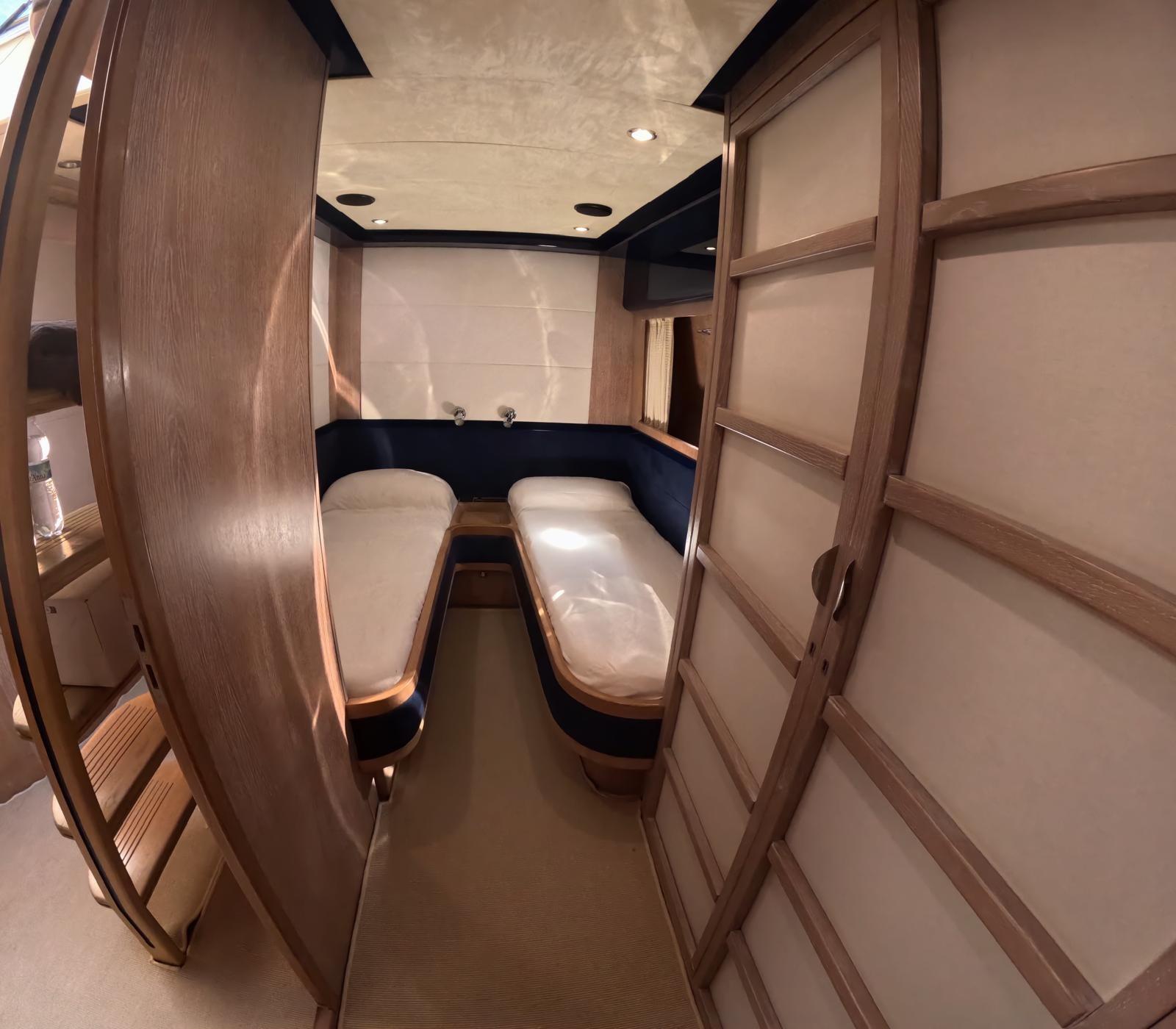 Delivered to its first and only owner, in April 1999, this AB Yachts Follia 75 is a large and fast Sport Yacht with Hamilton Jet propulsion and combines the highest standards of fittings and finishes with excellent handling and seaworthiness. The Follia 75 is an update of previous designs, with more powerful engines and a deep-V hull to provide faster and more comfortable sailing at sea. Two Deutz engines of 1850 hp each provide the impressive power to the water jets via Twin Disc gearboxes. The boat is built with closed-cell foam between layers of composite. There is a layer of elastomer inside the laminate, which maintains the seal even if the laminate is damaged in a collision. The decks are made of aluminum honeycomb. This construction makes the Follia 75 very light but also very durable. Two aft doors allow access to tenders. Another feature of the Follia 75 is its futuristic cockpit design and very intuitive controls. The reverse deflector and throttles are controlled with a single lever and there are three idle speeds to choose from for precise manoeuvring.