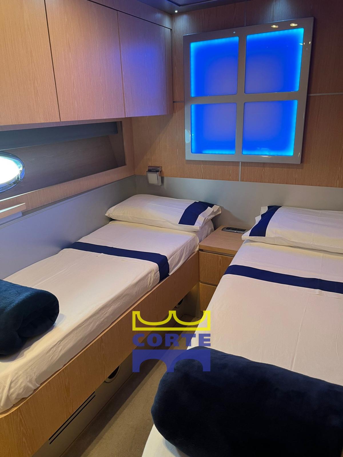 Engine Alarm, Bilge Alarm, Water pressure pump, Deck Shower, Twin Steering, Stern Thruster (Vetus), Bow Thruster (Vetus), Directional Spotlight, Electric Flaps, Tender Crane (sulla piattaforma di poppa), Courtesy Lights, Underwater lights, Gangway (elettroidraulica a scomparsa), Platform (poppa in teak), Automatic Bilge Pump, Entry door, Teak Cockpit, Shorepower connector, Water harbor connector system, Electric Windlass (Quick), swimming ladder, cockpit table, Tender, Horn, 2 Stern Winches (Quick), Bow Winches (Quick).