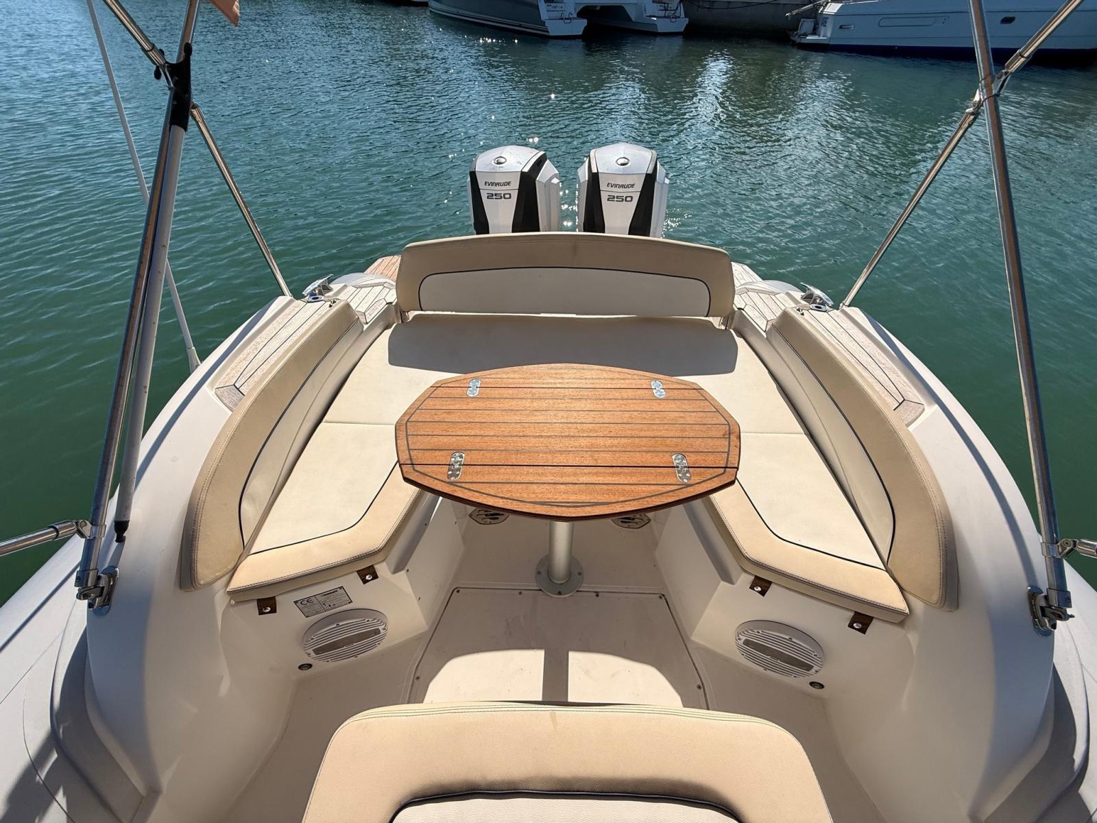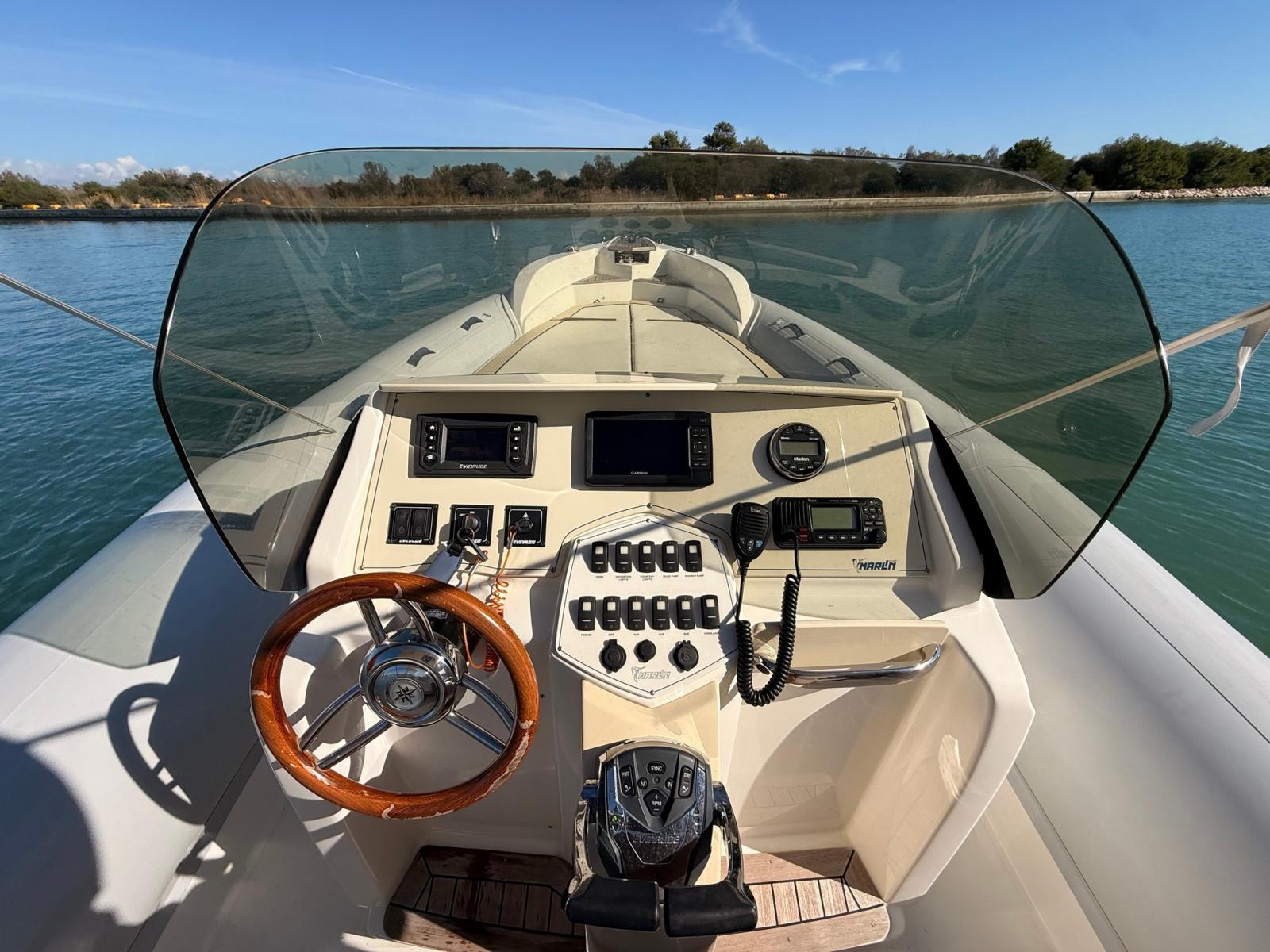 Thanks to the 250 HP twin Evinrudes, the Marlin 298 reaches speeds of over 45 knots, offering brilliant and precise navigation.