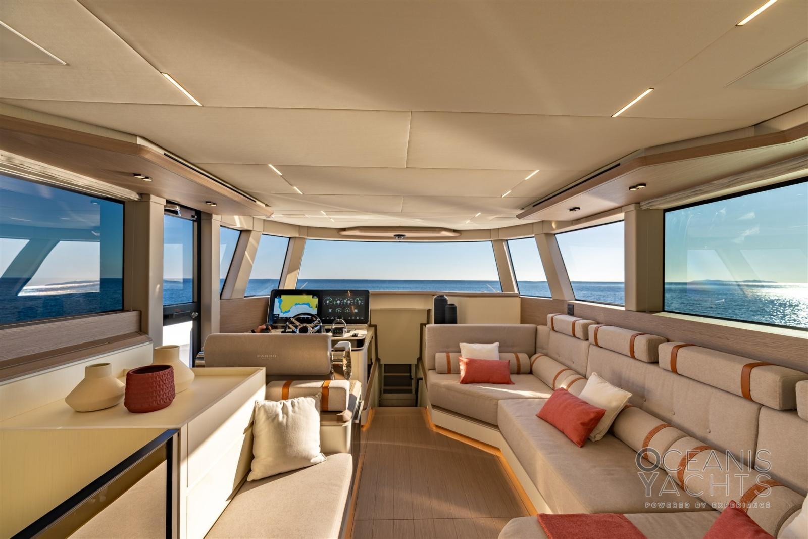 Bimini (elettrico in pozzetto), Cushions, Stern Cushions, Bow Cushions, Fly Bridge Cuscions, Cockpit Cushions, Mattresses, Sunshade, Curtains (elettriche per tutti gli ambienti).