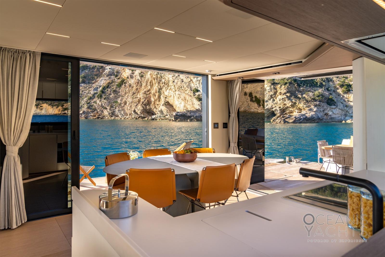 BBQ/Grill, Warm Water System, Safe, Inverter Air Conditioning, Internet Connection, Light Dimmer, Watermaker (200 lt/h), Waste Water Plant, Fuel Tank Indicator, Waste Water Tank Meter, Interior wooden floor, 12V Outlets, 220V Outlets, Black Water Tank, 4 Electric Toilet.