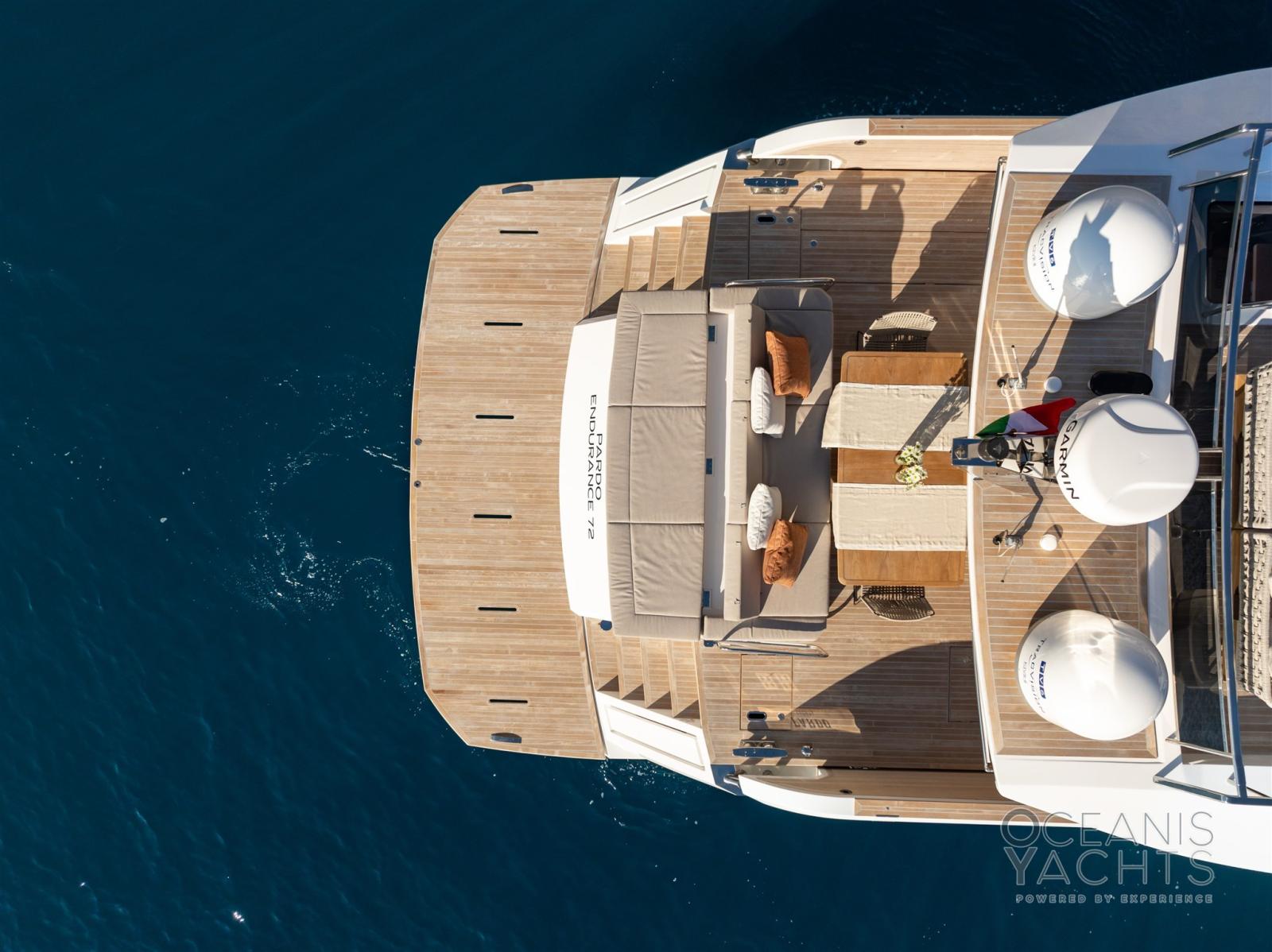 Fume/Gas Detector, Engine Alarm, Bilge Alarm, Alternator, Auto Dynamic Trim Interceptor, Water pressure pump, Teak Side Decks, Shore power cable, Deck Shower, Twin Steering, Directional Spotlight, Tender Garage, Fire Extinguishing System, Courtesy Lights, Underwater lights, Gangway (idraulica a scomparsa), Platform (idraulica di poppa), Automatic Bilge Pump, Manual Bilge Pump, Teak deck, Entry door, Side door, Teak Cockpit, Shorepower connector (con avvolgitore elettrico Glendinning), Water harbor connector system, Electric Windlass, swimming ladder, Saddles for tender, Stabilizers, cockpit table, Horn, Teak Deckhouse, Winch, Stern Winches, Bow Winches.