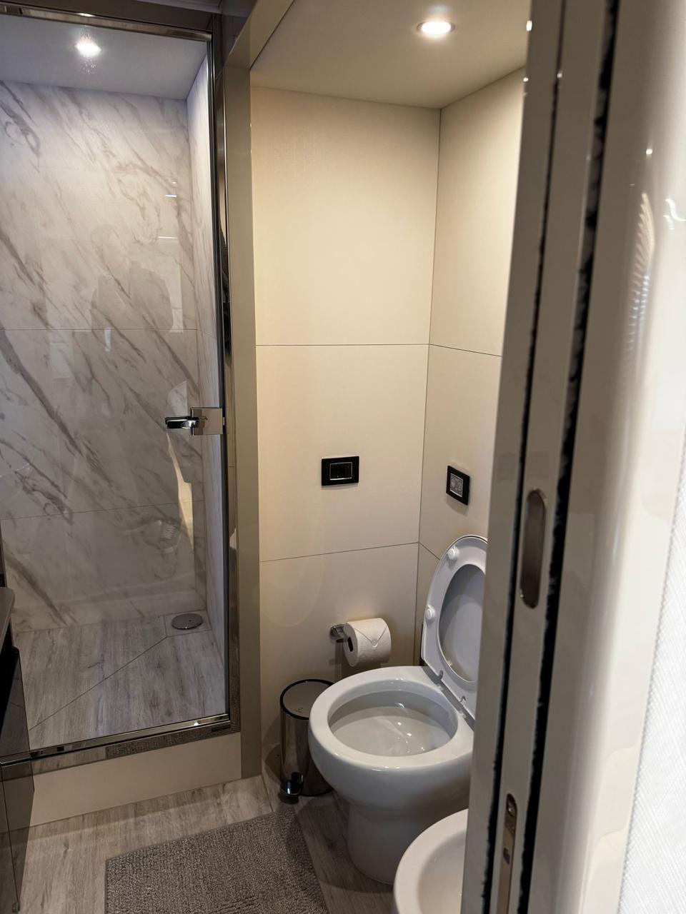 What I personally like about this yacht, is the fact that the aft “crew” cabin is on the same standard as all the other cabins, therefore I would say the yacht features 4 spacious cabins + 4 bathrooms, including a full-beam master, diagonal VIP, and convertible twin cabin. Bright salon with panoramic windows, seamless indoor-outdoor flow, and fully equipped galley.