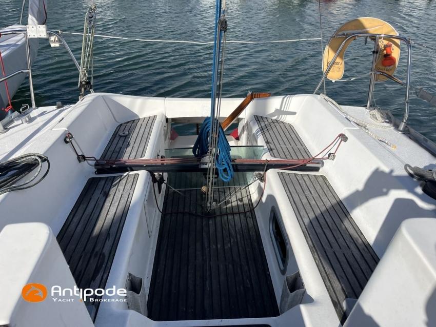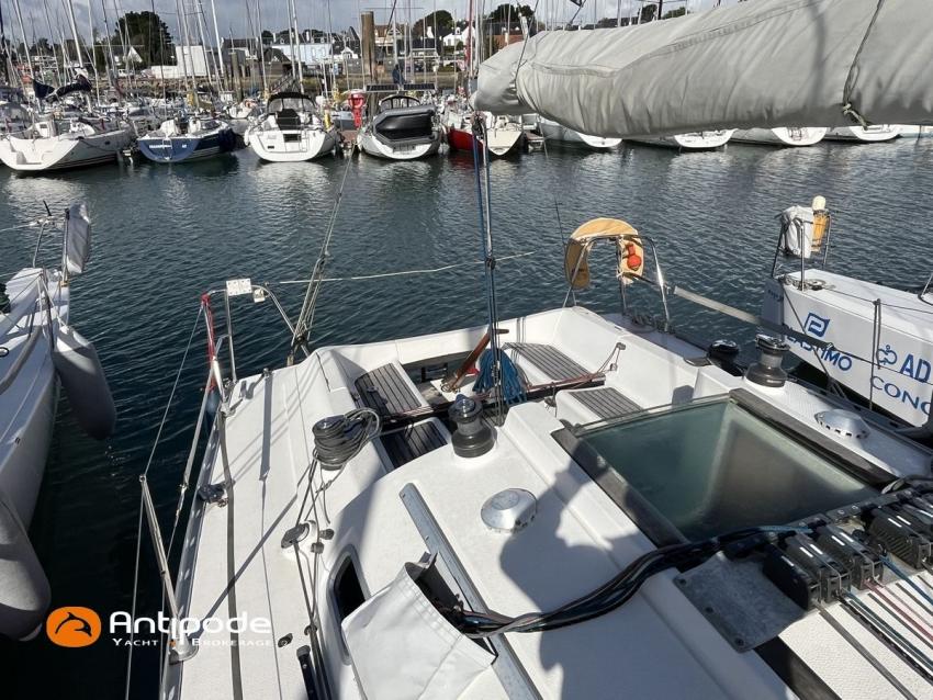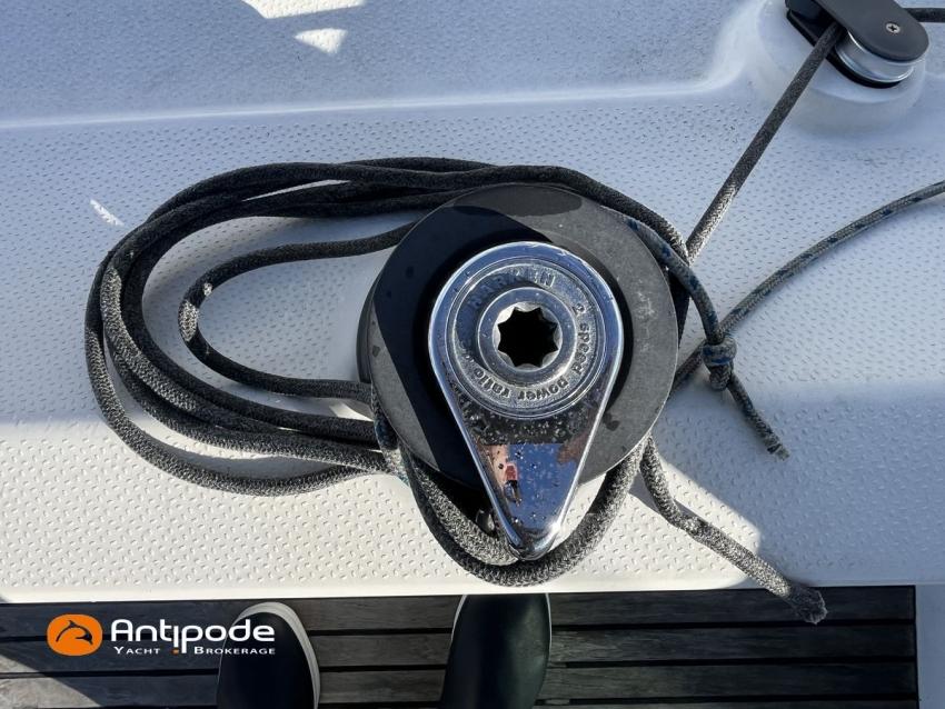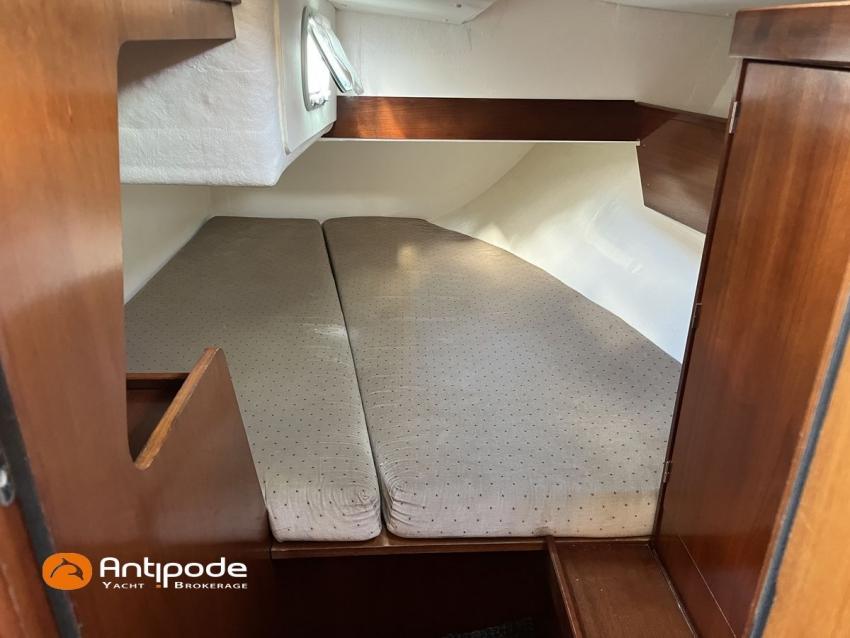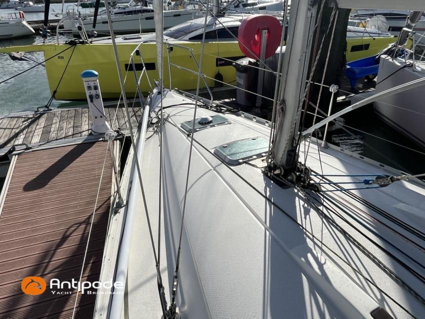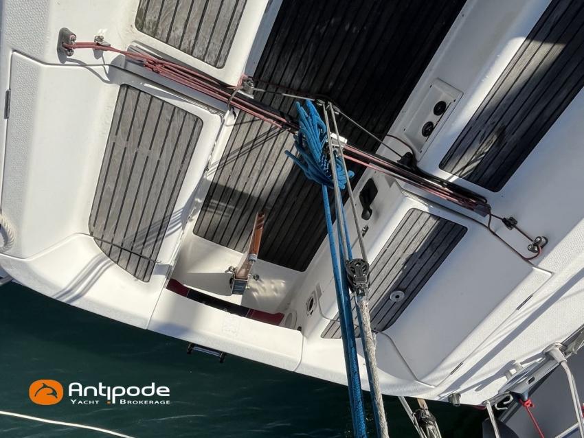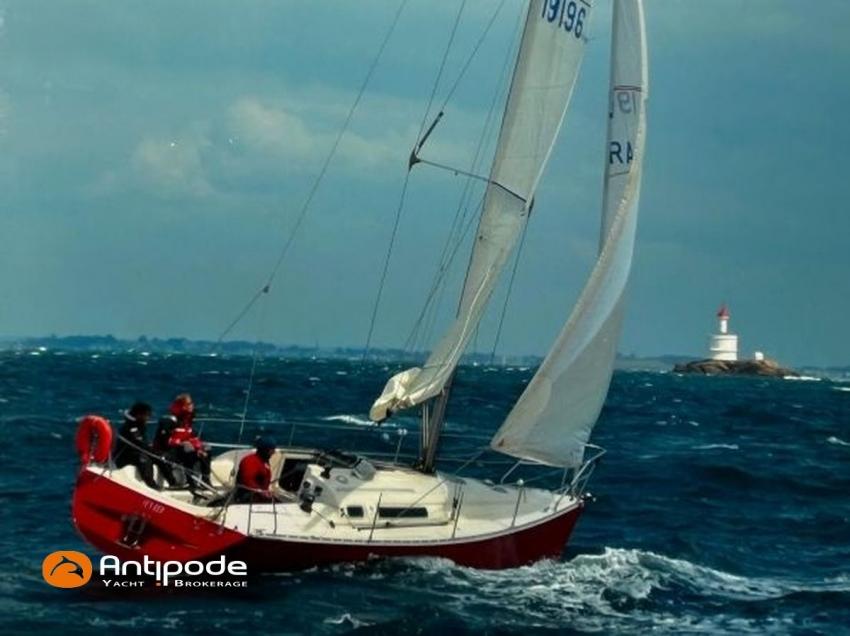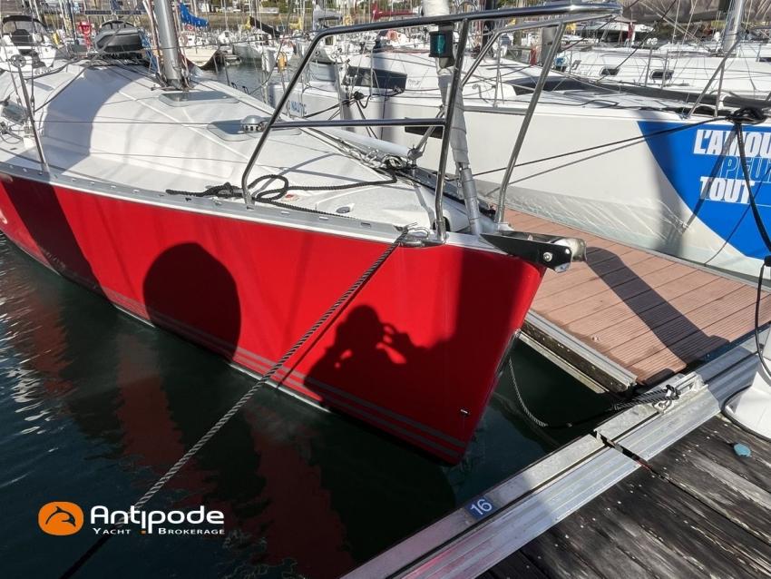 SUN FAST 32, 1999, 2 owners since 1999, Yanmar 2GM20 18 hp (1393 hrs), Interior layout version 1 forward cabin, 1 aft cabin, 1 heads (toilets + shower), Saloon upholstery - 2023, 2 cockpit primary genoa winches - Harken 40, 2 roof winches for adjustment and sail handling - Harken 32, Teak slatted cockpit floor, Teak cockpit seats, Triradial main sail, Main sail lazy bag, Genoa roller furling with drum under deck, Triradial furling genoa, Spinnaker riggings, 2 spinnakers, Raymarine ST 6200 in board autopilot, Raymarine ST 60 navigation system (wind, speed, depth), 3 Raymarine ST 60 cockpit repeaters, GPS and chartplotter (nav station), Electronic navigation charts, VHF / AIS at chart table - NAVICOM RT 650 DSC ASN, Fridge unit 12 V (top opening door) - 2023, 2 burners cooker + oven - 2024, 220 V shore power + battery charger, Engine battery - 70 amp, Service batteries - 2 X 70 amp, Liferaft, Anchor + chain, Located Brittany. For more information or to make an appointment for a visit, contact : Jérôme Le Joubioux +33 6 07 45 71 73 - jerome@antipode-yachts.com