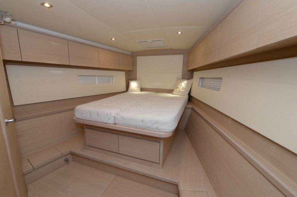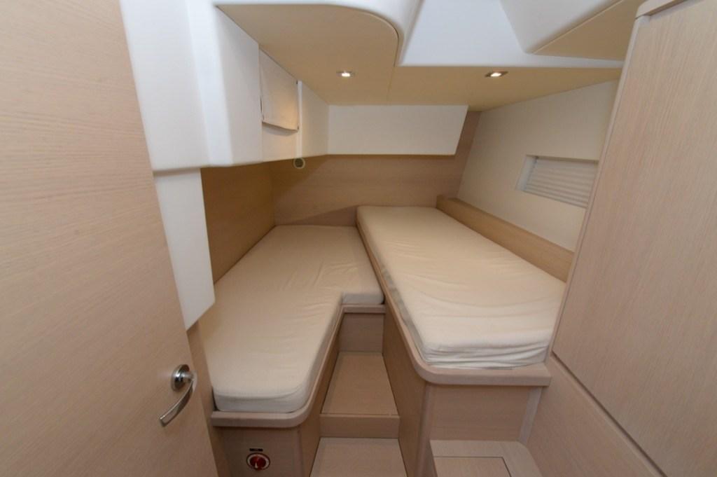 INTERIORS IN BLEACHED OAK, Left aft cabin with two single beds at staggered levels, sofa in front of the dinette table, white Corian kitchen top, carbon toilet sinks, adjustable reading lights in dinette and cabins, external cushions plus custom sponge upholstery, sheet bags, carbon gangway 2 mooring lines, partial safety equipment, Solimar hatches flush with bridge, self-tacking jib rail
