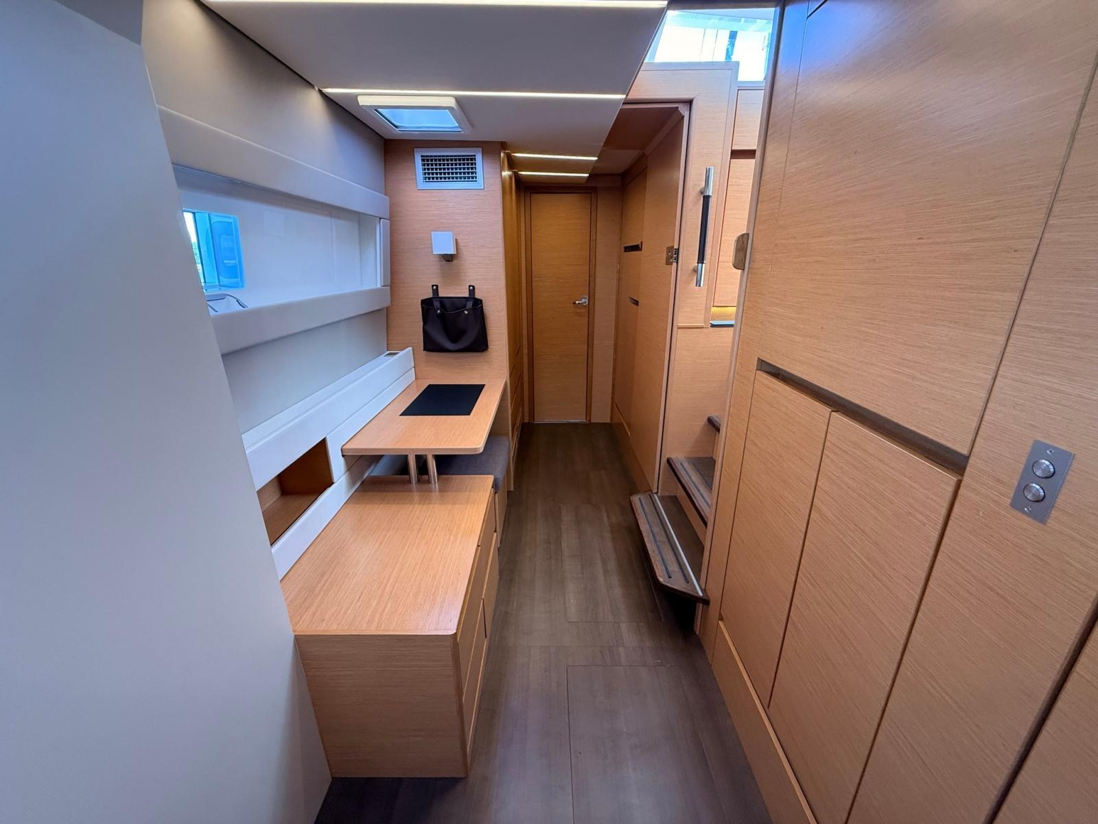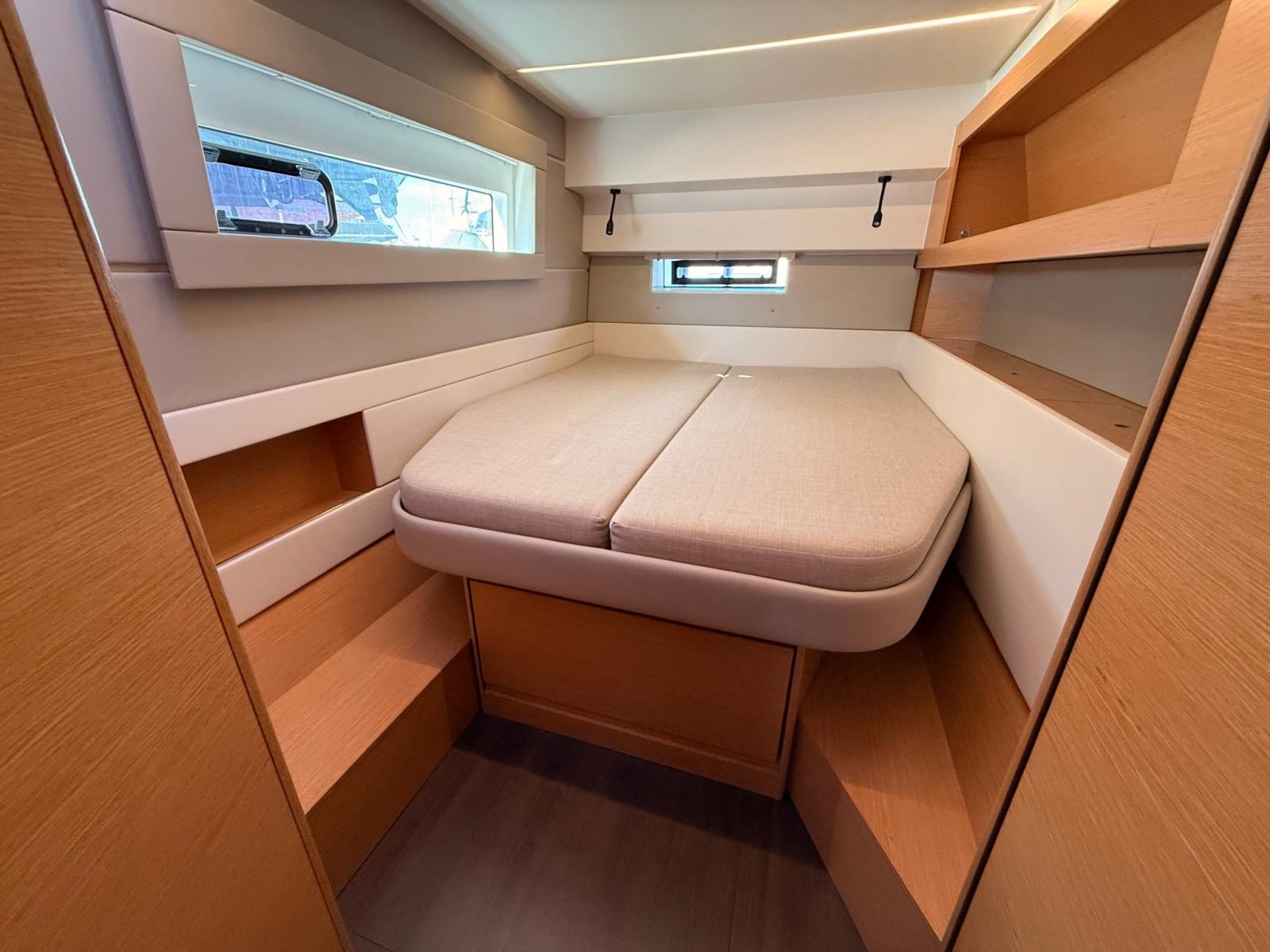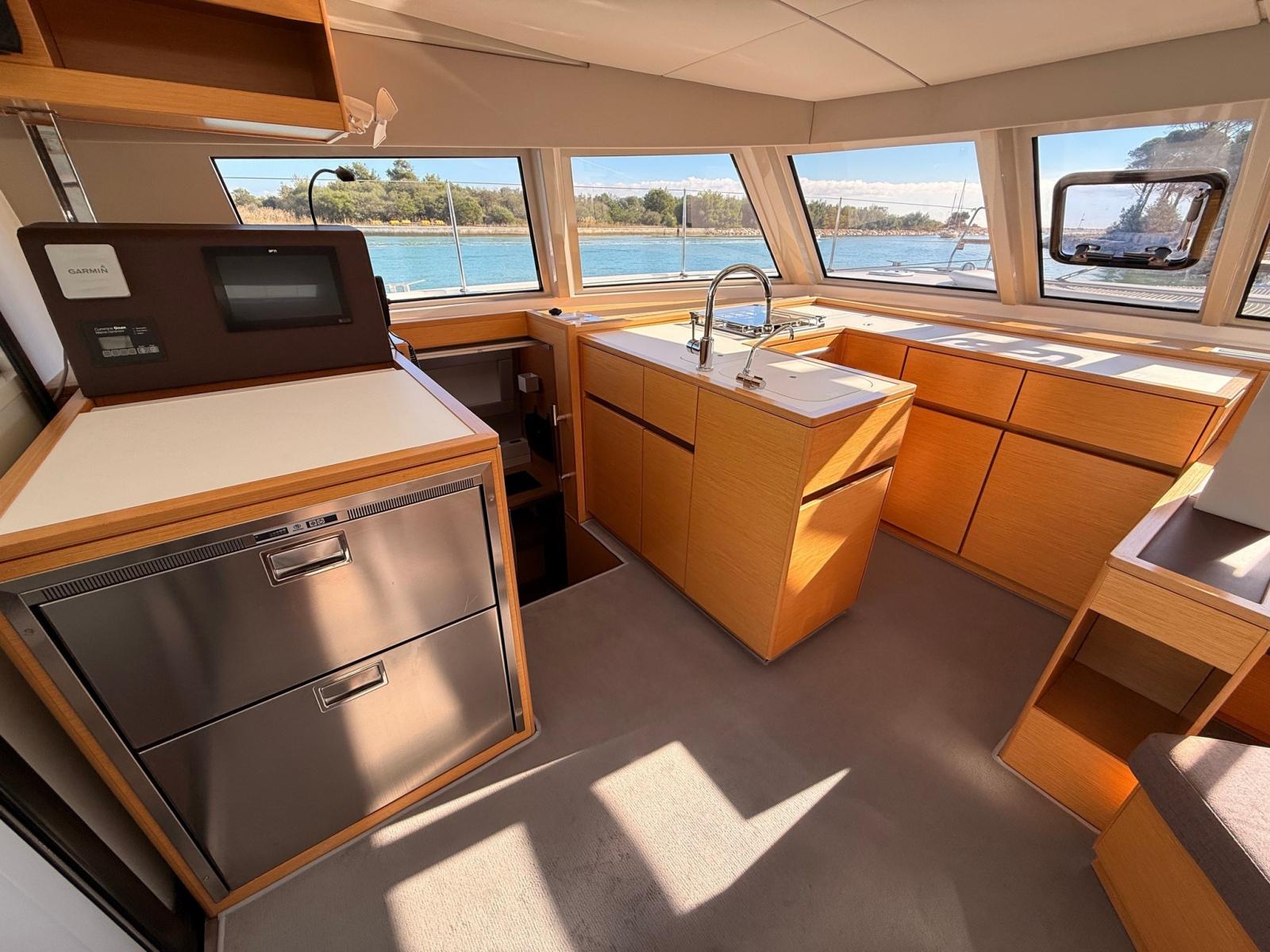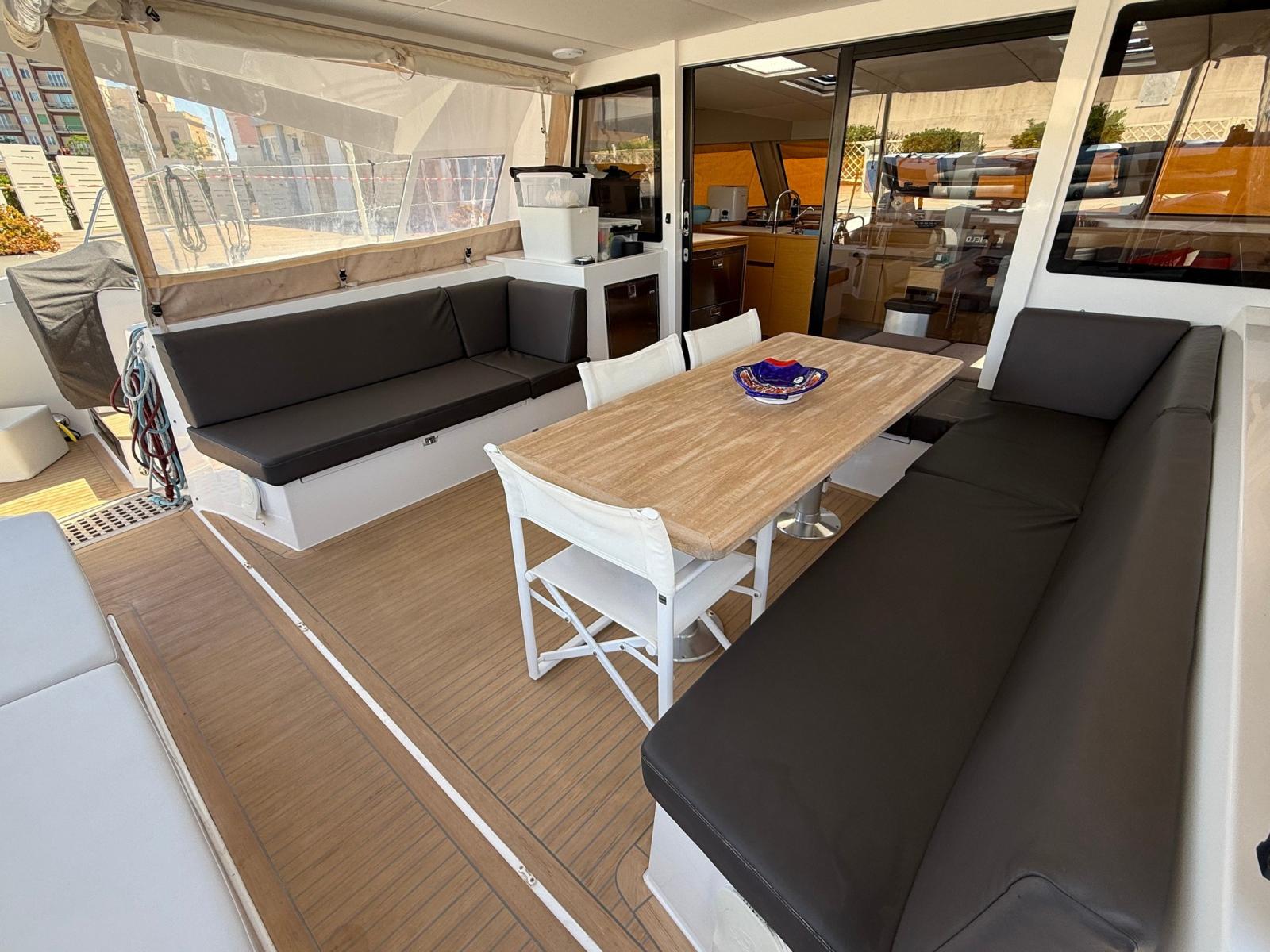The "Open" layout by Nautitech combines in a single environment, divided by the sliding door, cockpit, dinette and galley, creating a large bright and protected convivial space. Interiors with attention to detail, signed by Roseo Design, with quality materials and large panoramic windows.