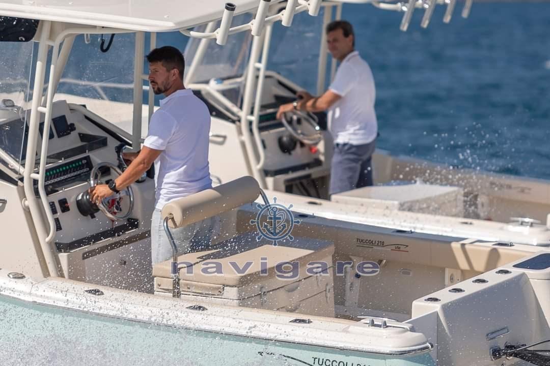 The driving position is designed to facilitate your fishing activities. Three levels, each with a support surface closed by a smoked plexiglass edge, to place everything that must always be available and at hand even if the sea is rough. The configuration also allows you to accommodate the on-board electronics you want and to insert the largest displays on the market. Place for the throttles of the main engines and for the trolling gasoline engine, as well as housing all the controls you need to govern your Tuccoli.