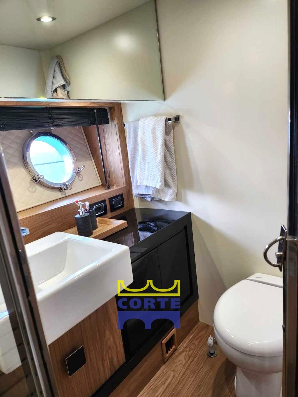 Full-beam double master cabin with bathroom with shower and separate sanitary facilities.