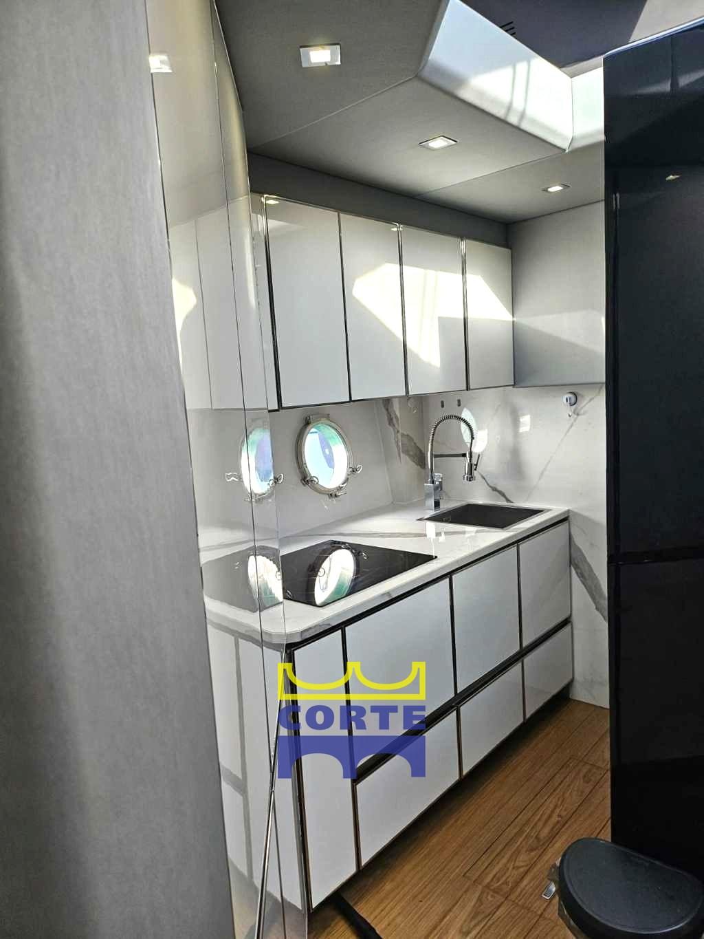 Below deck: galley on the starboard side, with refrigerator, dishwasher, wine cooler and plates.