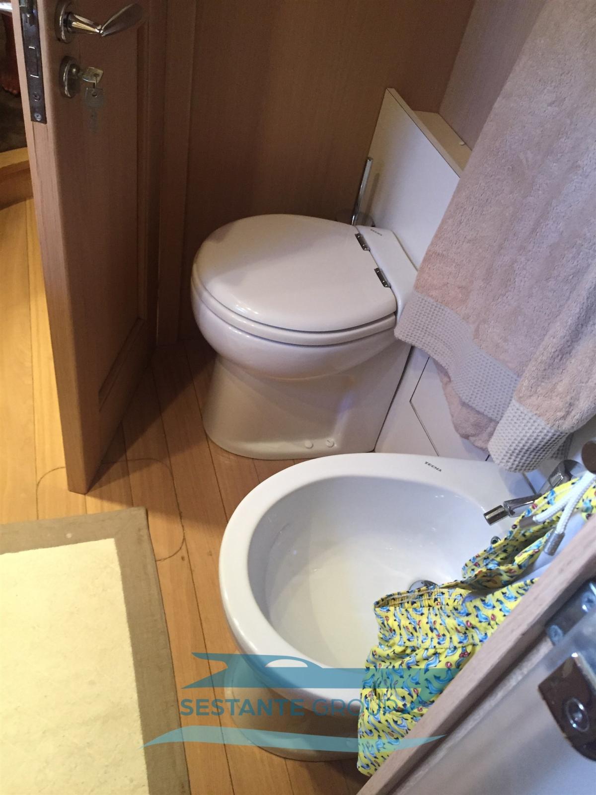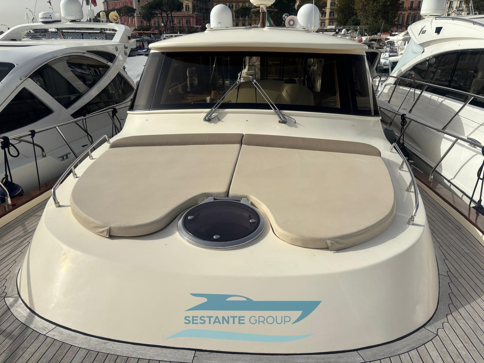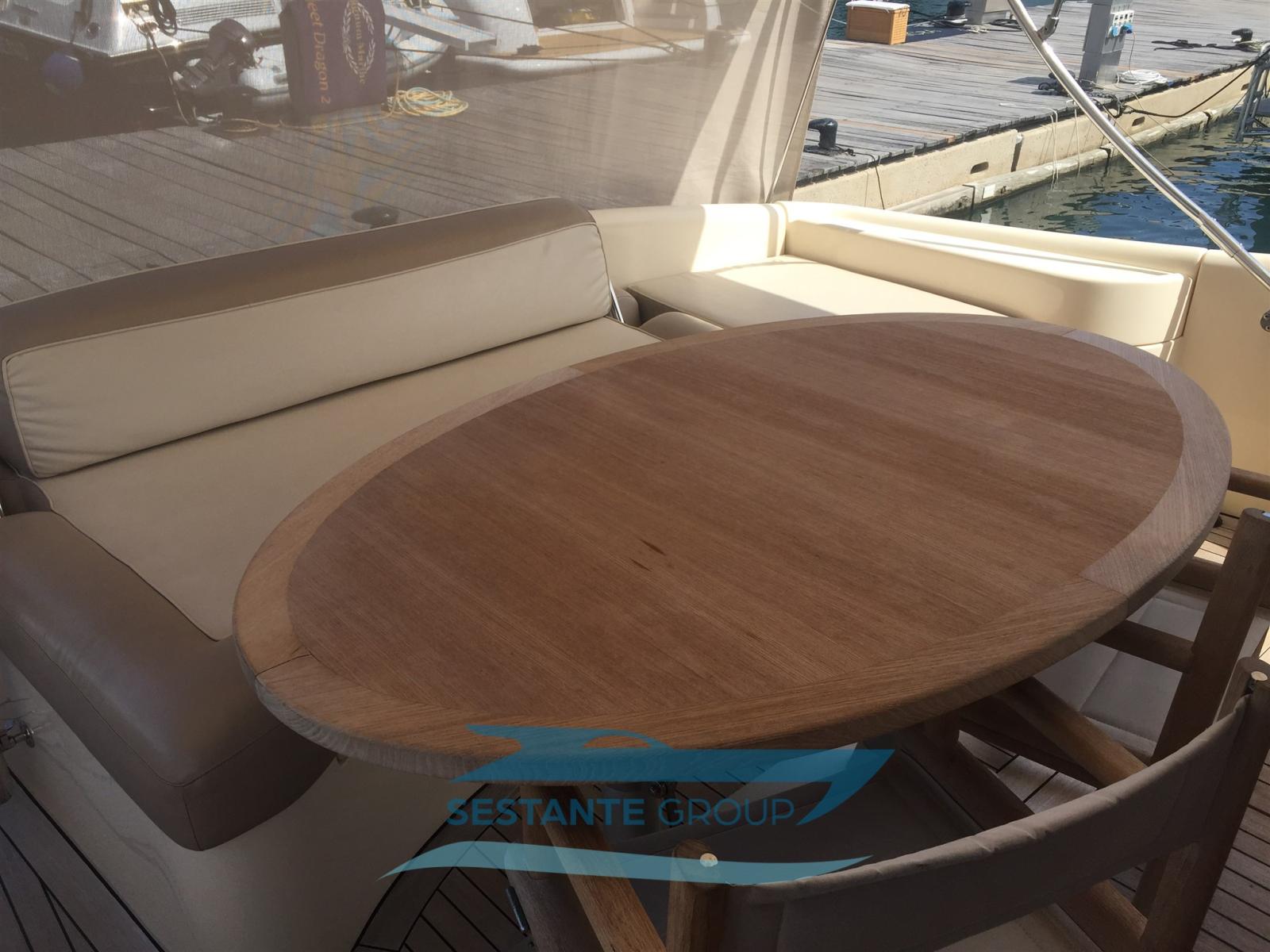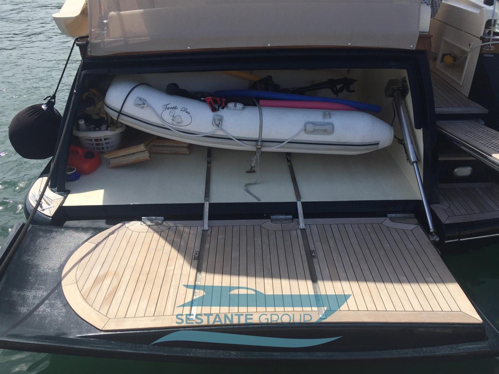 Fume/Gas Detector, Water pressure pump, Teak Side Decks, Deck Shower, Electric Flaps, Tender Garage, Hard top, Fire Extinguishing System, Flaps Indicators, Gangway (elettrica), Automatic Bilge Pump, Manual Bilge Pump, Entry door, Teak Cockpit, Shorepower connector, Voltage Rectifier, Electric Windlass, swimming ladder, Tender, Horn, Stern Winches.