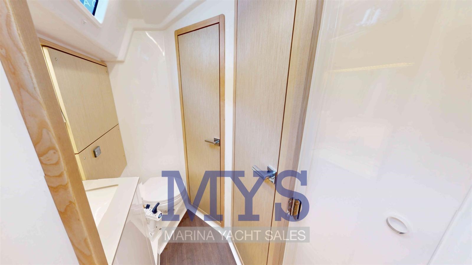 OWNER'S CABIN IN THE BOW WITH SEPARATE BATHROOM AND SHOWER.