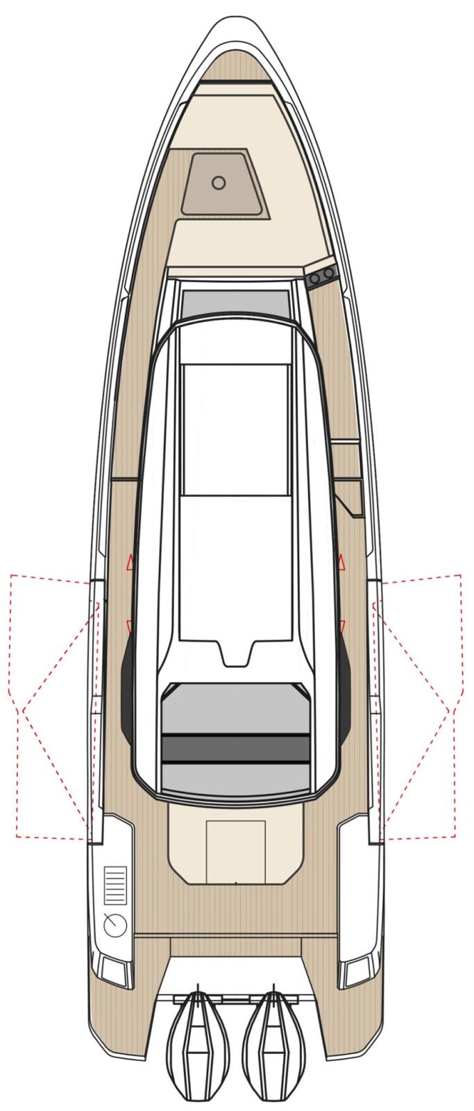 2 Engine Alarm, Bilge Alarm, Alternator, Electric Flaps, Hard top, Washbasin in the cockpit, Courtesy Lights, Platform, 3 Automatic Bilge Pump, Entry door, Side door, swimming ladder, cockpit table, Horn.